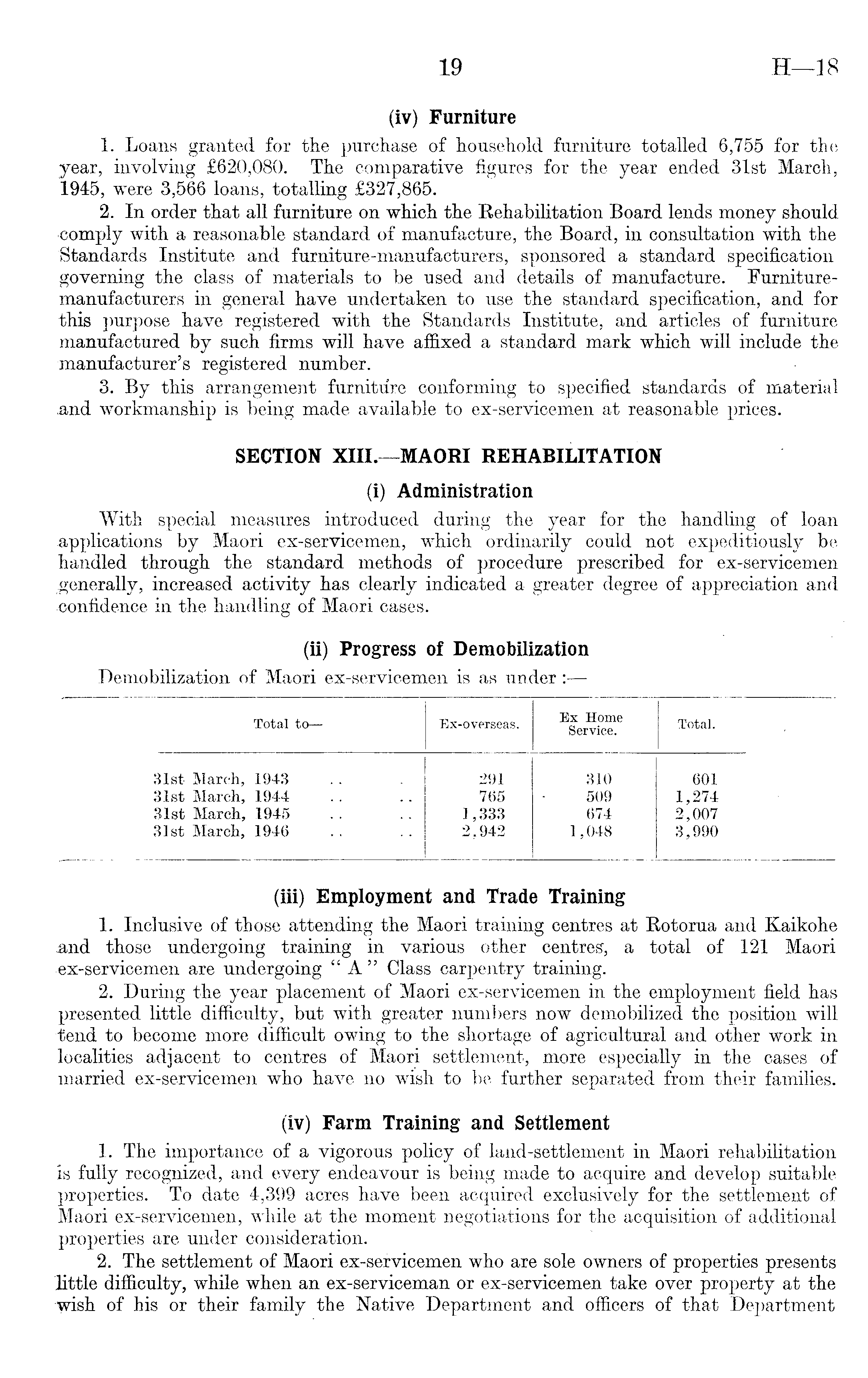 (iv) Furniture 1. Loans granted for the purchase of household furniture totalled 6,755 for the year, involving £620,080. The comparative figures for the year ended 31st March, 1945, were 3,566 loans, totalling £327,865. 2. In order that all furniture on which the Rehabilitation Board lends money should comply with a reasonable standard of manufacture, the Board, in consultation with the Standards Institute and furniture-manufacturers, sponsored a standard specification governing the class of materials to be used and details of manufacture. Furnituremanufacturers in general have undertaken to use the standard specification, and for this purpose have registered with the Standards Institute, and articles of furniture manufactured by such firms will have affixed a standard mark which will include the manufacturer's registered number. 3. By this arrangement furniture conforming to specified standards of material and workmanship is being made available to ex-servicemen at reasonable prices. SECTION XIII.—MAORI REHABILITATION (i) Administration With special measures introduced during the year for the handling of loan applications by Maori ex-servicemen, which ordinarily could not expeditiously be handled through the standard methods of procedure prescribed for ex-servicemen generally, increased activity has clearly indicated a greater degree of appreciation and confidence in the handling of Maori cases.