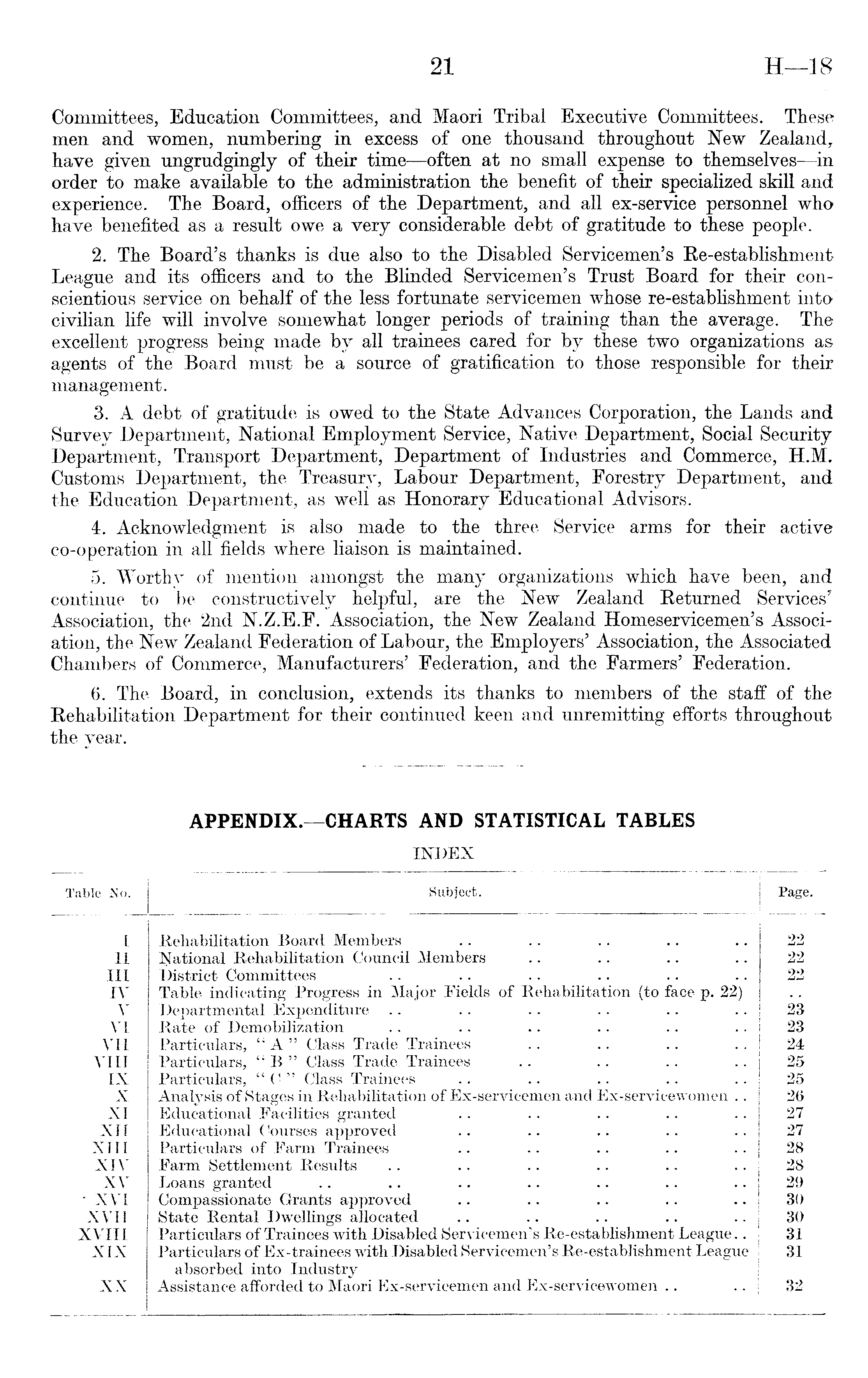 Committees, Education Committees, and Maori Tribal Executive Committees. These men and women, numbering in excess of one thousand throughout New Zealand, have given ungrudgingly of their time —often at no small expense to themselves —in order to make available to the administration the benefit of their specialized skill and experience. The Board, officers of the Department, and all ex-service personnel who have benefited as a result owe a very considerable debt of gratitude to these people. 2. The Board's thanks is due also to the Disabled Servicemen's Ee-establishment League and its officers and to the Blinded Servicemen's Trust Board for their conscientious service on behalf of the less fortunate servicemen whose re-establishment into civilian life will involve somewhat longer periods of training than the average. The excellent progress being made by all trainees cared for by theae two organizations as agents of the Board must be a source of gratification to those responsible for their management. 3. A debt of gratitude is owed to the State Advances Corporation, the Lands and Survey Department, National Employment Service, Native Department, Social Security Department, Transport Department, Department of Industries and Commerce, H.M. Customs Department, the Treasury, Labour Department, Forestry Department, and the Education Department, as well as Honorary Educational Advisors. 4. Acknowledgment is also made to the three Service arms for their active co-operation in all fields where liaison is maintained. 5. Worthy of mention amongst the many organizations which have been, and continue to be constructively helpful, are the New Zealand Returned Services' Association, the 2nd N.Z.E.F. Association, the New Zealand Homeservicemen's Association, the New Zealand Federation of Labour, the Employers' Association, the Associated Chambers of Commerce, Manufacturers' Federation, and the Farmers' Federation. 6. The Board, in conclusion, extends its thanks to members of the staff of the Rehabilitation Department for their continued keen and unremitting efforts throughout the year.