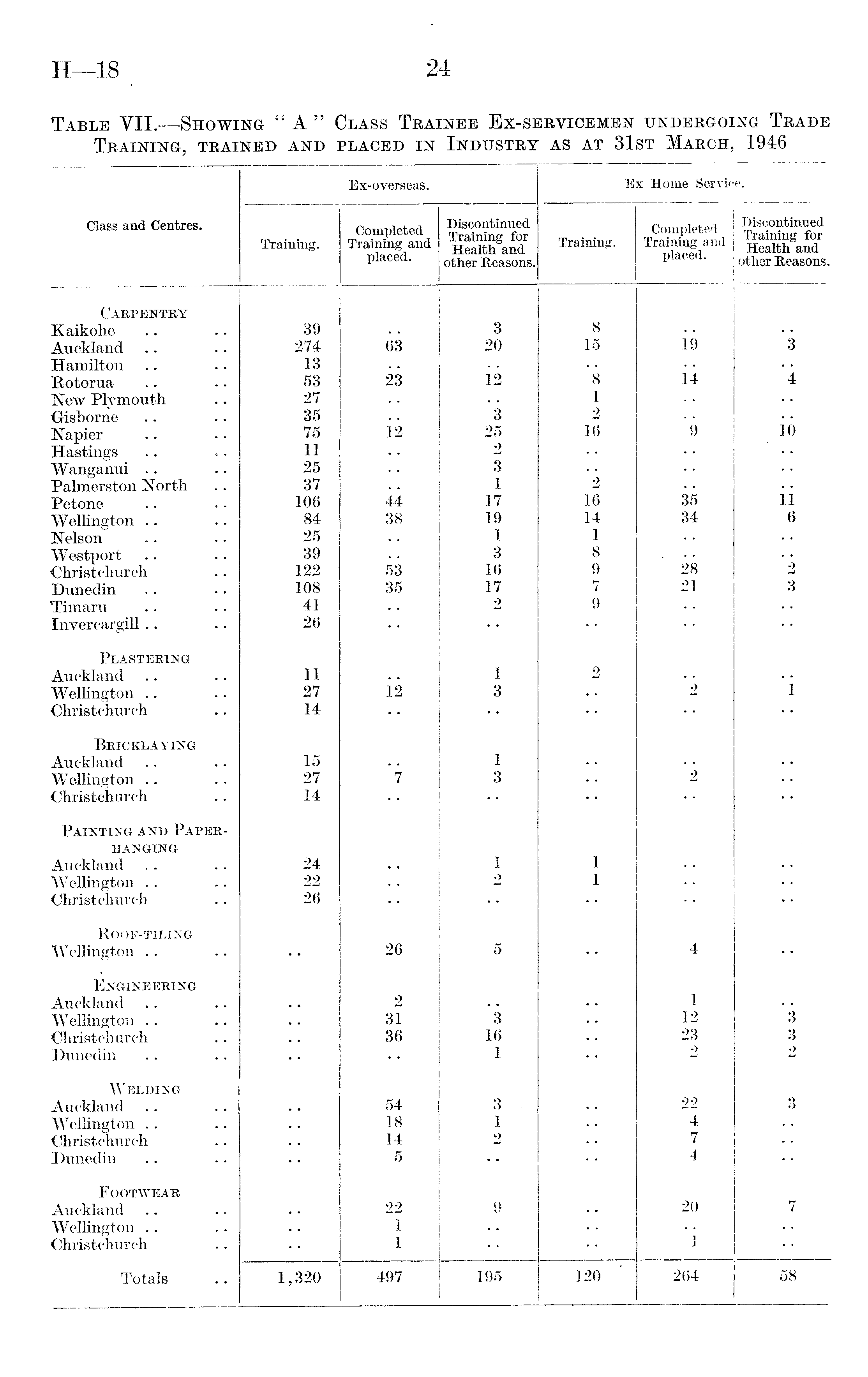 Ex-overseas. Ex Home Service. Class and Centres. * Training. Completed Training and Discontinued Training for Health and Training. Completed Training and placed. Discontinued Training for Health and placed. other Reasons. other Reasons. Carpentry Kaikohe 39 3 8 Auckland 274 63 20 15 19 3 Hamilton 13 Rotorua 53 23 12 8 14 4 New Plymouth 27 1 Qisborne 35 3 2 Napier 75 i2 25 16 9 10 Hastings 11 9 Wanganui .. 25 3 Palmerston North 37 1 2 Petone 106 44 17 16 35 11 Wellington .. 84 38 19 14 34 6 Nelson 25 1 1 Westport 39 3 8 Christ church 122 53 16 9 28 2 Dunedin 108 35 17 7 21 3 Timaru 41 2 9 Invercargill .. 26 Plastering Auckland 11 1 2 Wellington 27 i2 3 2 i Christchurch 14 Bricklaying Auckland 15 1 Wellington 27 7 3 2 Christchurch 14 Painting and PaferHANGING Auckland 24 1 1 Wellington . . 22 2 1 Christchurch 26 Roof-tiling Wellington 26 o 4 Engineering Auckland 2 1 Wellington 31 3 12 3 Christchurch 36 16 23 3 Dunedin 1 •> 2 Welding i Auckland 54 3 22 3 Wellington 18 1 4 Christchurch 14 2 7 Dunedin 5 4 Footwear Auckland 22 9 20 7 Wellington 1 Christchurch 1 1 Totals 1,320 497 195 120 264 58