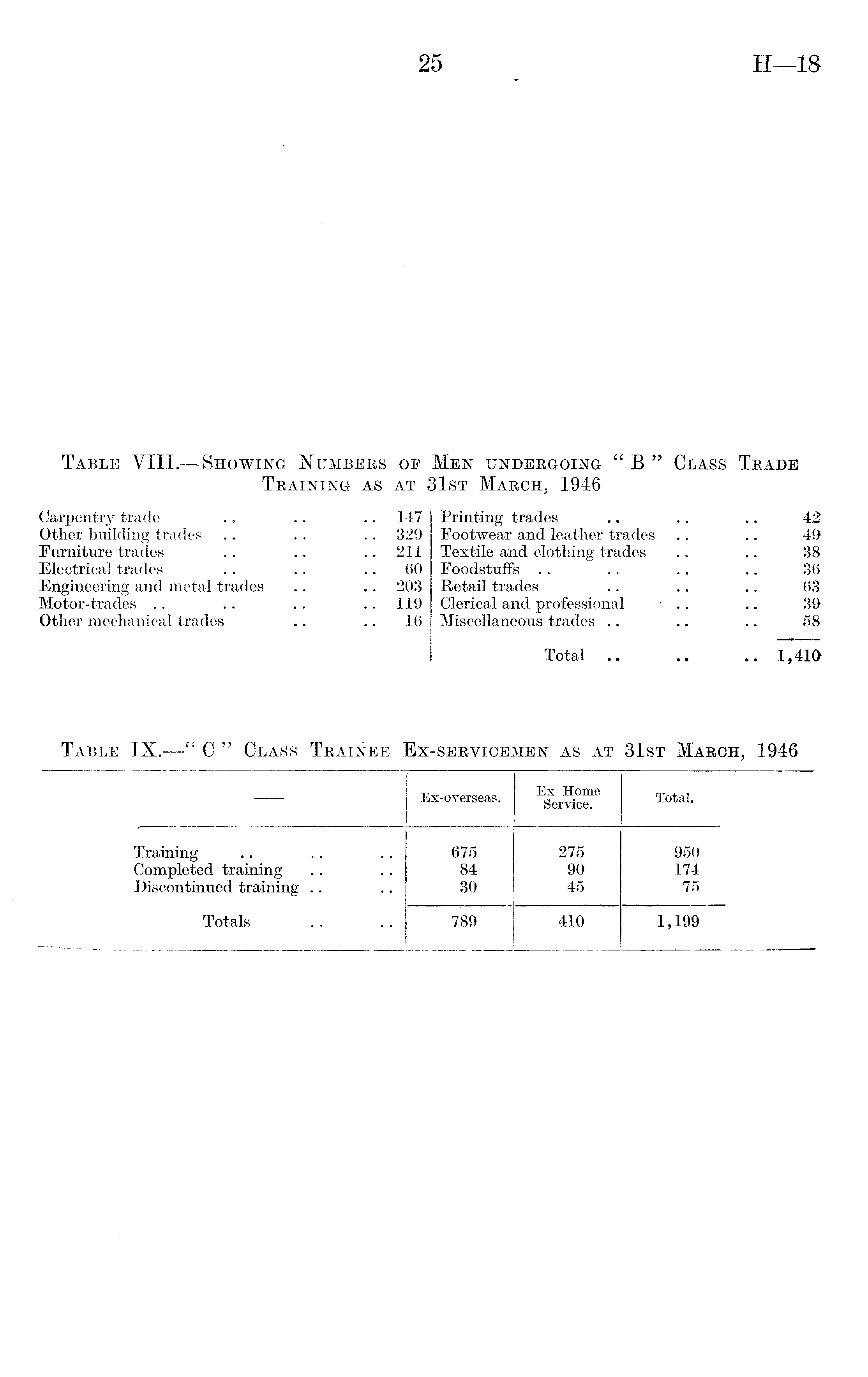 Table VIII.— Showing Numbers of Men undergoing "B " Glass Trade Training as at 31st March, 1946 Carpentry trade .. .. .. 147 Printing trades .. .. .. 42 Other building trades .. .. . . 329 Footwear and leather trades .. .. 49 Furniture trades .. .. ..211 Textile and clothing trades .. .. 38 Electrical trades .. .. 60 Foodstuffs .. .. .. .. 36 Engineering and metal trades .. .. 203 Retail trades .. .. .. 63 Motor-trades . . .. .. 119 Clerical and professional • .. .. 39 Other mechanical trades .. .. 16 Miscellaneous trades .. .. .. 58 Total .. .. .. 1,410