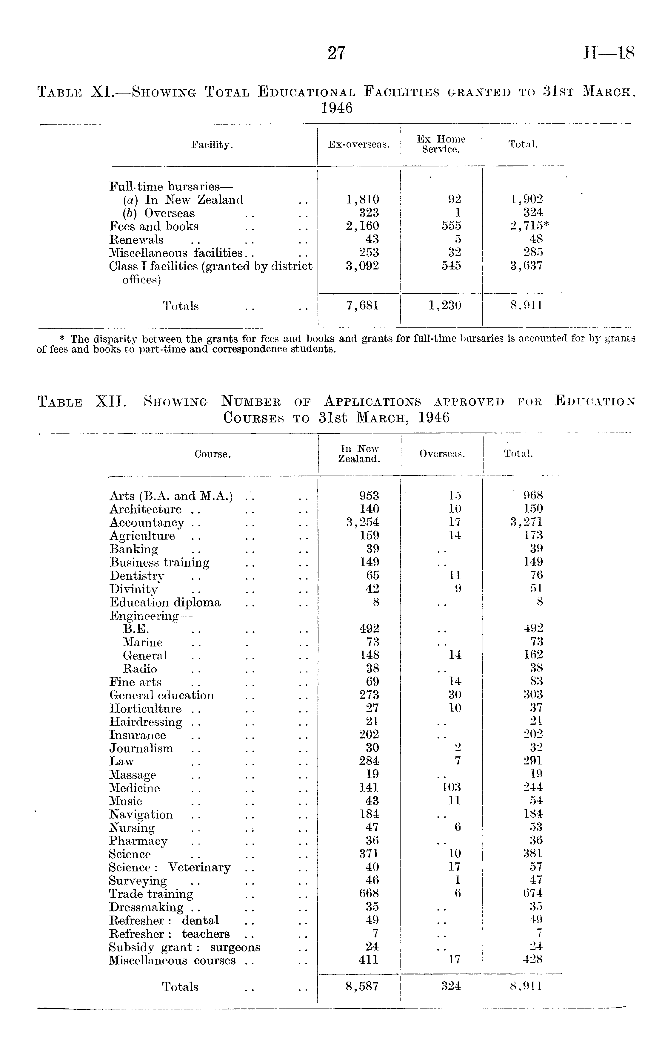 Facility. Ex-overseas. Ex Home Service. Total. Full-time bursaries — (a) In New Zealand (b) Overseas Fees and books Renewals Miscellaneous facilities Class I facilities (granted by district offices) 1,810 323 2,160 43 253 3,092 92 1 555 5 32 545 1,902 324 2,715* 48 285 3,637 Totals 7,681 1,230 8,911 * The disparity between the grants for fees and books and grants for full-time bursaries is accounted for by grants of fees and books to part-time and correspondence students.