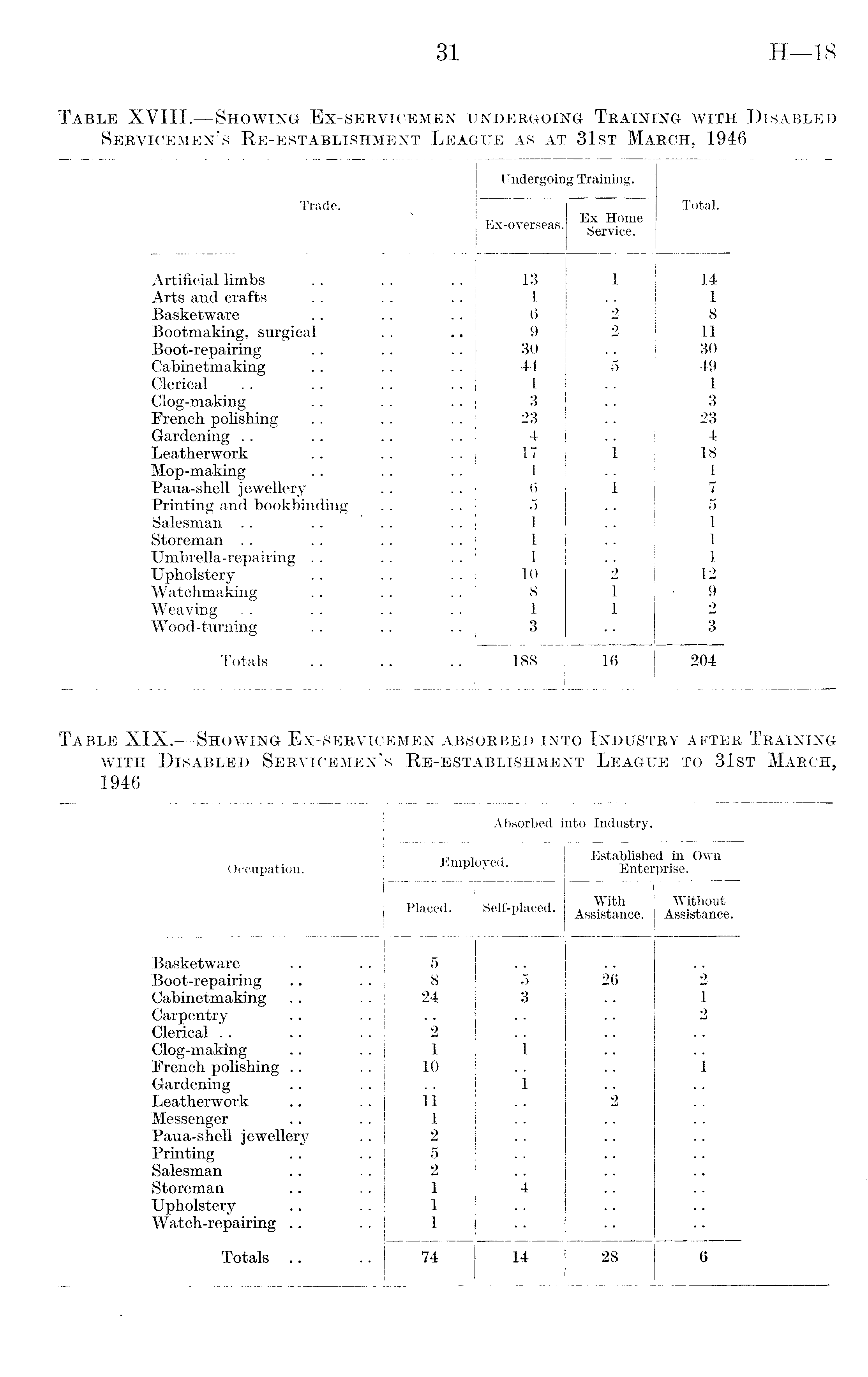 Undergoing Training. Trade. Ex-overseas. Ex Home Service. Total. Artificial limbs 13 1 14 Arts and crafts 1 1 Basketware () 2 8 Bootmaking, surgical Boot-repairing Cabinetmaking 9 30 44 2 5 11 30 49 Clerical 1 1 Clog-making French polishing Gardening 3 23 4 3 23 4 Leatherwork 17 1 18 Mop-making Paua-shell jewellery Printing and bookbinding Salesman .. . . . 1 6 5 1 1 1 7 5 1 Storeman 1 1 Umbrella-repairing . . Upholstery Watchmaking Weaving Wood-turning 1 10 8 1 3 2 1 1 1 12 9 2 3 Totals 188 16 204