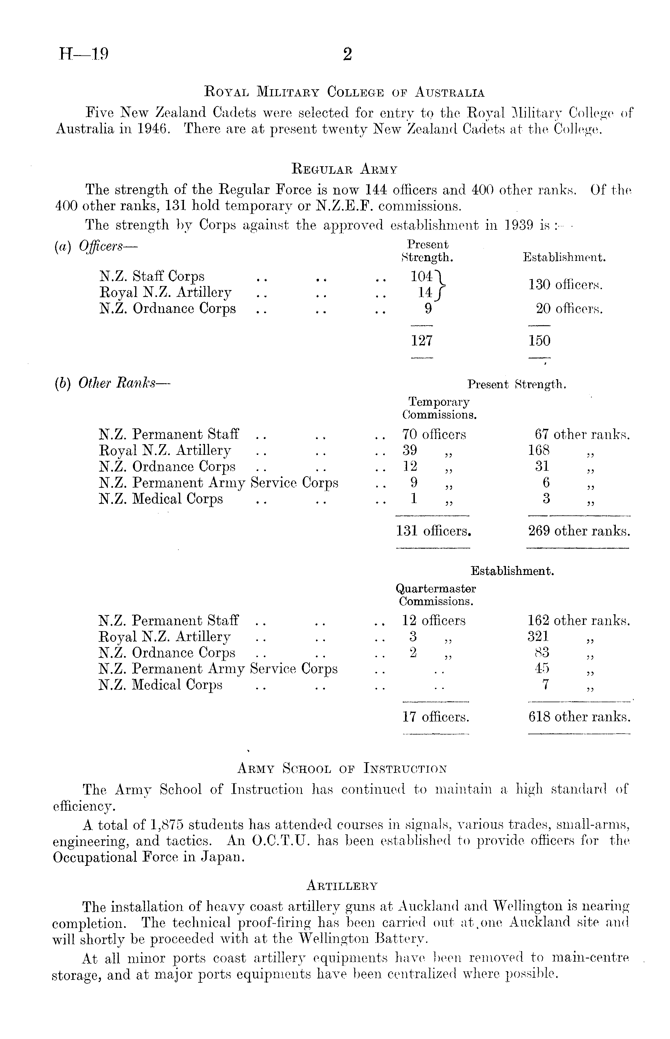 Royal Military College op Australia Five New Zealand Cadets were selected for entry to the Royal Military College of Australia in 1946. There are at present twenty New Zealand Cadets at the College. Regular Army The strength of the Regular Force is now 144 officers and 400 other ranks. Of the 400 other ranks, 131 hold temporary or N.Z.E.F. commissions. The strength by Corps against the approved establishment in 1939 is : (a) Officers — Present Strength. Establishment. N.Z. Staff Corps .. .. .. 104\ , QA Royal N.Z. Artillery 14/ 130 officers. N.Z. Ordnance Corps .. .. .. 9 20 officers. 127 150 (b) Other Ranks — Present Strength. Temporary Commissions. N.Z. Permanent Staff .. .. .. 70 officers 67 other ranks. Royal N.Z. Artillery .. .. .. 39 „ 168 „ N.Z. Ordnance Corps .. .. .. 12 „ 31 „ N.Z. Permanent Army Service Corps 9 „ 6 „ N.Z. Medical Corps .. .. 1 „ 3 „ 131 officers. 269 other ranks. Establishment. Quartermaster Commissions. N.Z. Permanent Staff .. .. .. 12 officers 162 other ranks. Royal N.Z. Artillery .. .. 3 „ 321 „ N.Z. Ordnance Corps .. .. 2 „ 83 „ N.Z. Permanent Army Service Corps .. .. 45 „ N.Z. Medical Corps .. .. .. .. 7 17 officers. 618 other ranks. Army School of Instruction The Army School of Instruction has continued to maintain a high standard of efficiency. A total of 1,875 students has attended courses in signals, various trades, small-arms, engineering, and tactics. An O.C.T.U. has been established to provide officers for the Occupational Force in Japan. Artillery The installation of heavy coast artillery guns at Auckland and Wellington is nearing completion. The technical proof-firing has been carried out at .one Auckland site and will shortly be proceeded with at the Wellington Battery. At all minor ports coast artillery equipments have been removed to main-centre storage, and at major ports equipments have been centralized where possible.