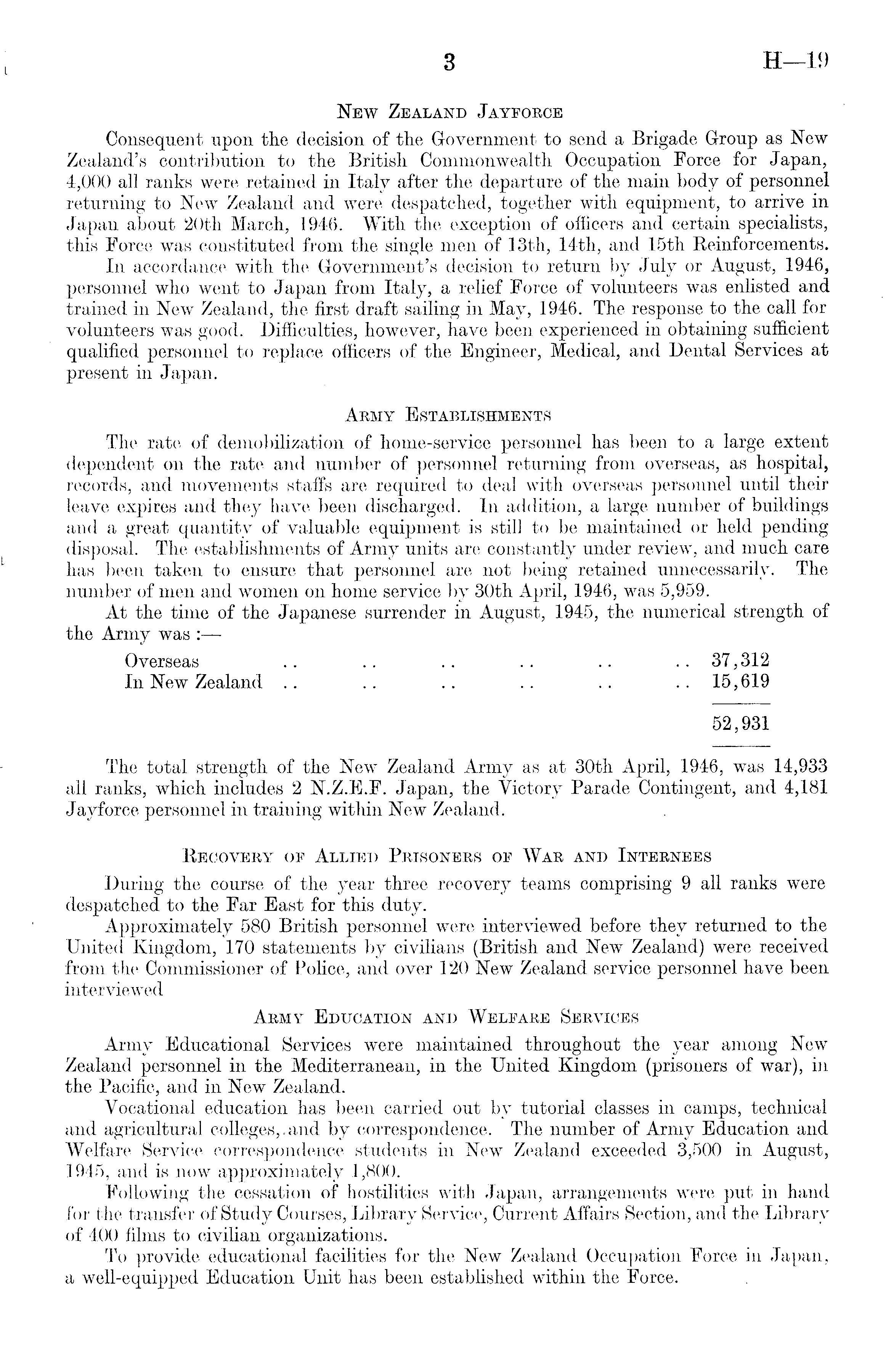 New Zealand Jayforce Consequent upon the decision of the Government to send a Brigade Group as New Zealand's contribution to the British Commonwealth Occupation Force for Japan, 4,000 all ranks were retained in Italy after the departure of the main body of personnel returning to New Zealand and were despatched, together with equipment, to arrive in Japan about 20th March, 1946. With the exception of officers and certain specialists, this Force was constituted from the single men of 13th, 14th, and 15th Reinforcements. In accordance with the Government's decision to return by July or August, 1946, personnel who went to Japan from Italy, a relief Force of volunteers was enlisted and trained in New Zealand, the first draft sailing in May, 1946. The response to the call for volunteers was good. Difficulties, however, have been experienced in obtaining sufficient qualified personnel to replace officers of the Engineer, Medical, and Dental Services at present in Japan. Army Establishments The rate of demobilization of home-service personnel has been to a large extent dependent on the rate and number of personnel returning from overseas, as hospital, records, and movements staffs are required to deal with overseas personnel until their leave expires and they have been discharged. In addition, a large number of buildings and a great quantity of valuable equipment is still to be maintained or held pending disposal. The establishments of Army units are constantly under review, and much care has been taken to ensure that personnel are not being retained unnecessarily. The number of men and women on home service by 30th April, 1946, was 5,959. At the time of the Japanese surrender in August, 1945, the numerical strength of the Army was : Overseas .. .. .. .. .. .. 37,312 In New Zealand .. .. .. .. .. .. 15,619 52,931 The total strength of the New Zealand Army as at 30th April, 1946, was 14,933 all ranks, which includes 2 N.Z.E.F. Japan, the Victory Parade Contingent, and 4,181 Jayforce personnel in training within New Zealand. Recovery of Allied Prisoners of War and Internees During the course of the year three recovery teams comprising 9 all ranks were despatched to the Far East for this duty. Approximately 580 British personnel were interviewed before they returned to the United Kingdom, 170 statements by civilians (British and New Zealand) were received from the Commissioner of Police, and over 120 New Zealand service personnel have been interviewed Army Education and Welfare Services Army Educational Services were maintained throughout the year among New Zealand personnel in the Mediterranean, in the United Kingdom (prisoners of war), in the Pacific, and in New Zealand. Vocational education has been carried out by tutorial classes in camps, technical and agricultural colleges,-and by correspondence. The number of Army Education and Welfare Service correspondence students in New Zealand exceeded 3,500 in August, 1945, and is now approximately 1,800. Following the cessation of hostilities with Japan, arrangements were put in hand for the transfer of Study Courses, Library Service, Current Affairs Section, and the Library of 400 films to civilian organizations. To provide educational facilities for the New Zealand Occupation Force in Japan, a well-equipped Education Unit has been established within the Force.