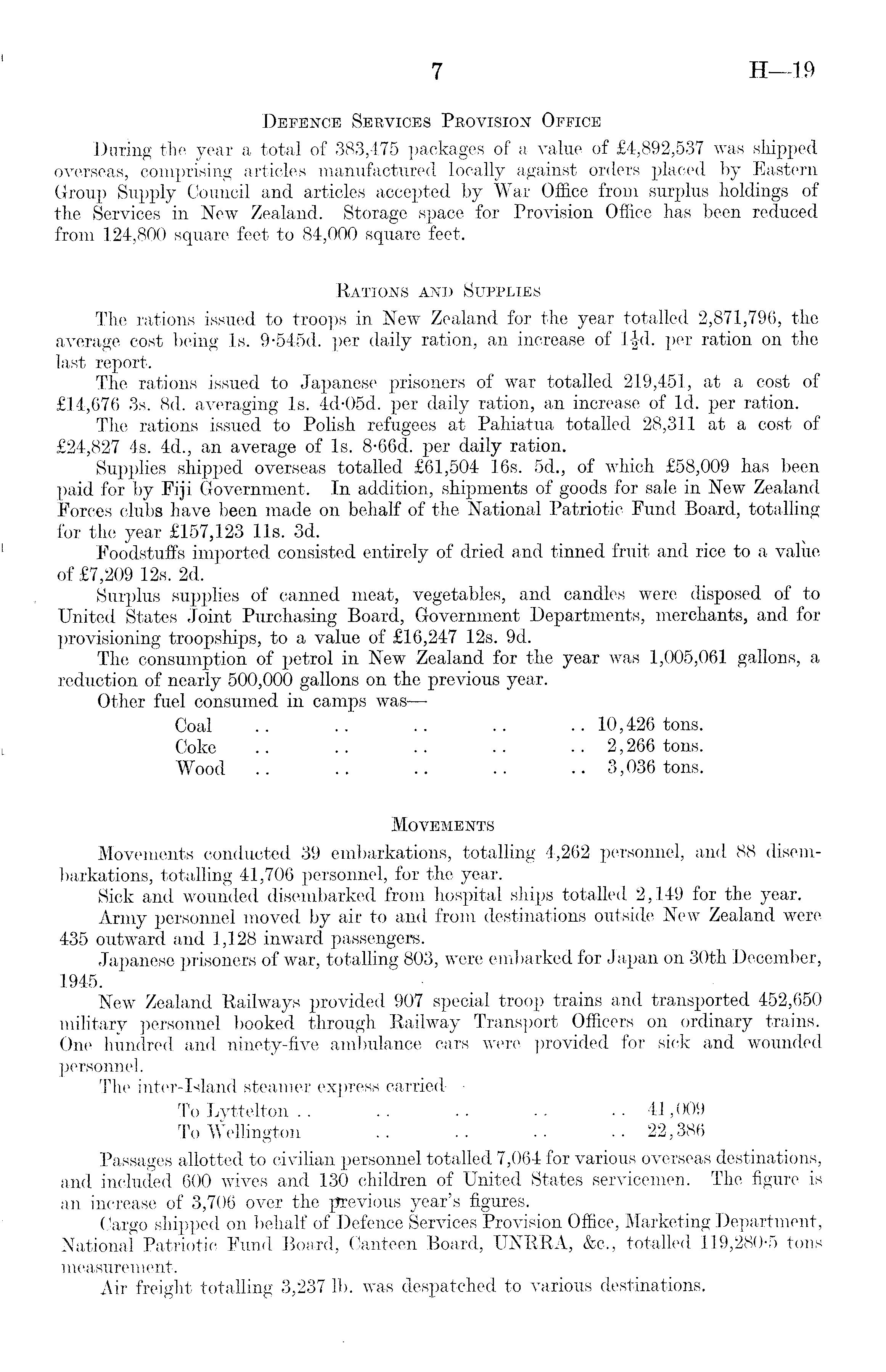 Defence Services Provision Office Daring the year a total of 383,475 packages of a value of £4,892,537 was shipped overseas, comprising articles manufactured locally against orders placed by Eastern Group Supply Council and articles accepted by War Office from surplus holdings of the Services in New Zealand. Storage space for Provision Office has been reduced from 124,800 square feet to 84,000 square feet. Rations and Supplies The rations issued to troops in New Zealand for the year totalled 2,871,796, the average cost being Is. 9-545 d. per daily ration, an increase of per ration on the last report. The rations issued to Japanese prisoners of war totalled 219,451, at a cost of £14,676 3s. Bd. averaging Is. 4d-05d. per daily ration, an increase of Id. per ration. The rations issued to Polish refugees at Pahiatua totalled 28,311 at a cost of £24,827 4s. 4d., an average of Is. 8-66 d. per daily ration. Supplies shipped overseas totalled £61,504 16s. 5d., of which £58,009 has been paid for by Fiji Government. In addition, shipments of goods for sale in New Zealand Forces clubs have been made on behalf of the National Patriotic Fund Board, totalling for the year £157,123 lis. 3d. Foodstuffs imported consisted entirely of dried and tinned fruit and rice to a value of £7,209 12s. 2d. Surplus supplies of canned meat, vegetables, and candles were disposed of to United States Joint Purchasing Board, Government Departments, merchants, and for provisioning troopships, to a value of £16,247 12s. 9d. The consumption of petrol in New Zealand for the year was 1,005,061 gallons, a reduction of nearly 500,000 gallons on the previous year. Other fuel consumed in camps was — Coal .. .. .. .. .. 10,426 tons. Coke .. .. .. .. .. 2,266 tons. Wood .. .. .. .. .. 3,036 tons. Movements Movements conducted 39 embarkations, totalling 4,262 personnel, and 88 disembarkations, totalling 41,706 personnel, for the year. Sick and wounded disembarked from hospital ships totalled 2,149 for the year. Army personnel moved by air to and from destinations outside New Zealand were 435 outward and 1,128 inward passengers. Japanese prisoners of war, totalling 803, were embarked for Japan on 30th December, 1945. New Zealand Railways provided 907 special troop trains and transported 452,650 military personnel booked through Railway Transport Officers on ordinary trains. One hundred and ninety-five ambulance cars were provided for sick and wounded personnel. The inter-Island steamer express carried — To Lyttelton .. .. .. .. .. 41,009 To Wellington .. .. .. .. 22,386 Passages allotted to civilian personnel totalled 7,064 for various overseas destinations, and included 600 wives and 130 children of United States servicemen. The figure is an increase of 3,706 over the previous year's figures. Cargo shipped on behalf of Defence Services Provision Office, Marketing Department, National Patriotic Fund Board, Canteen Board, UNRRA, &c., totalled 119,280-5 tons measurement. Air freight totalling 3,237 lb. was despatched to various destinations.