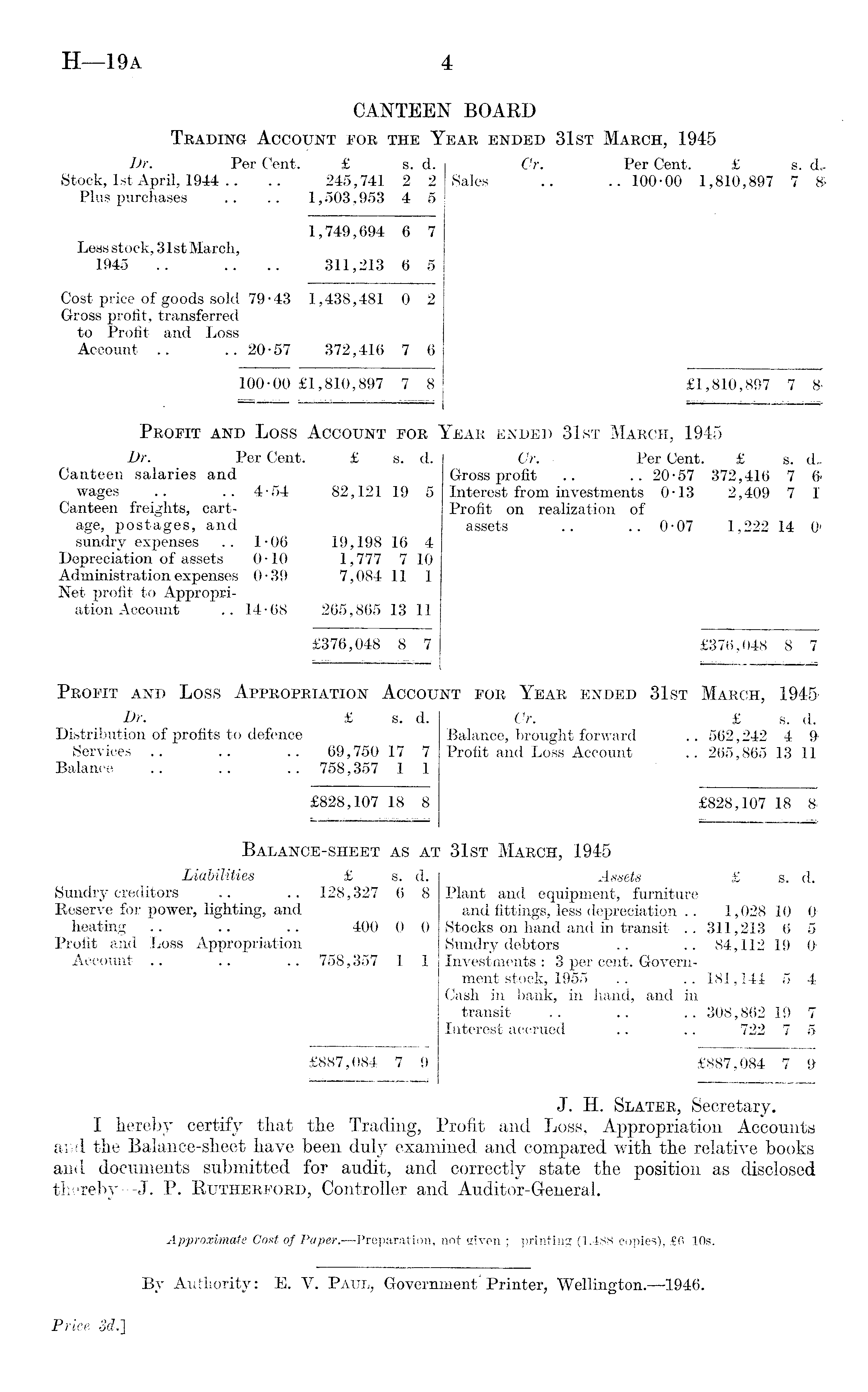 CANTEEN BOARD Trading Account for the Year ended 31st March, 1945 Dr. Per Cent. £ s. d. Cr. Per Cent. £ s. d. Stock, Ist April, 1944 .. .. 245,741 22 Sales .. ..100-00 1,810,897 7 & Plus purchases .. .. 1,503,953 4 5 1,749,694 6 7 Less stock, 31st March, 1945 .. .. .. 311,213 6 5 Cost price of goods sold 79-43 1,438,481 0 2 Gross profit, transferred to Profit and Loss Account .. .. 20-57 372,416 7 6 100-00 £1,810,897 7 8 £1,810,897 7 8Profit and Loss Account for Year ended 31st March, 1945 Dr. Per Cent. £ s. d. Gr. Per Cent. £ s. d. Canteen salaries and Gross profit .. .. 20-57 372,416 7 6wages .. .. 4-54 82,121 19 5 Interest from investments 0-13 2,409 7 1' Canteen freights, cart- Profit on realization of age, postages, and assets .. .. 0-07 1,222 14 0> sundry expenses .. 1-06 19,198 16 4 Depreciation of assets 0-10 1,777 710 Administration expenses 0-39 7,084 11 1 Net profit to Appropriation Account .. 14-68 265,865 13 11 £376,048 8 7 £376,048 8 7 Profit and Loss Appropriation Account for Year ended 31st March, 1945 Dr. £ s. d. Cr. £ s. d. Distribution of profits to defence Balance, brought forward .. 562,242 4 9 Services .. .. .. 69,750 17 7 Profit and Loss Account .. 265,865 13 11 Balance .. .. .. 758,357 1 1 £828,107 18 8 £828,107 18 8 Balance-sheet as at 31st March, 1945 Liabilities £ s. d. Assets £ s. d. Sundry creditors .. .. 128,327 6 8 Plant and equipment, furniture Reserve for power, lighting, and and fittings, less depreciation .. 1,028 10 0 heating .. .. .. 400 0 0 Stocks on hand and in transit .. 311,213 6 5 Profit and Loss Appropriation Sundry debtors .. .. 84,11219 0 Account .. .. .. 758,357 1 1 Investments: 3 per cent. Government stock, 1955 .. .. 181,144 5 4 Cash in bank, in hand, and in transit .. .. .. 308,862 19 7 Interest accrued .. .. 722 7 5 £887,084 7 9 £887,084 7 9 J. H. Slater, Secretary. I hereby certify that the Trading, Profit and Loss, Appropriation Accounts and the Balance-sheet have been duly examined and compared with the relative books and documents submitted for audit, and correctly state the position as disclosed thereby —J. P. Rutherford, Controller and Auditor-General. Approximate Cost of Paper.—Preparation, not sn'ven ; printing (1,488 copies), £6 10s. By Authority: E. Y. Paul, Government* Printer, Wellington.—l 946. Price 3d.]