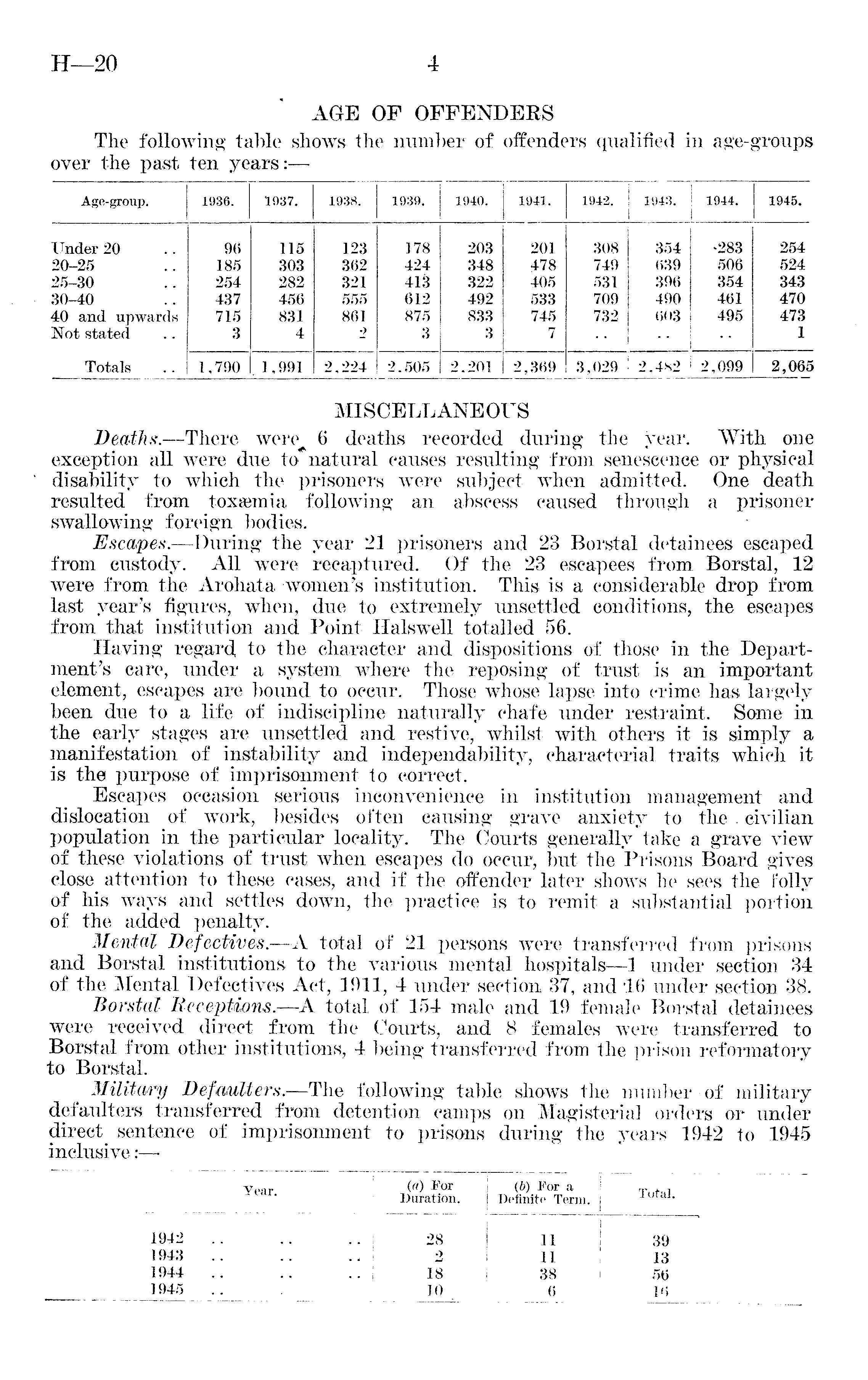 MISCELLANEOUS Deaths.—There 6 deaths recorded during the year. With one exception all were due to*natural causes resulting from senescence or physical disability to which the prisoners were subject when admitted. One death resulted from toxgemia following an abscess caused through a prisoner swallowing foreign bodies. Escapes.—During the year 21 prisoners and 23 Borstal detainees escaped from custody. All were recaptured. Of the 23 escapees from Borstal, 12 were from the Arohata women's institution. This is a considerable drop from last year's figures, when, due to extremely unsettled conditions, the escapes from that institution and Point Halswell totalled 56. Having regard, to the character and dispositions of those in the Department's care, under a system where the reposing of trust is an important element, escapes are bound to occur. Those whose lapse into crime has largely been due to a life of indiscipline naturally chafe under restraint. Some in the early stages are unsettled and restive, whilst with others it is simply a manifestation of instability and independability, characterial traits which it is the purpose of imprisonment to correct. Escapes occasion serious inconvenience in institution management and dislocation of work, besides often causing grave anxiety to the . civilian population in the particular locality. The Courts generally take a grave view of these violations of trust when escapes do occur, but the Prisons Board gives close attention to these eases, and if the offender later shows he sees the folly of his ways and settles down, the practice is to remit a substantial portion of the added penalty. Mental Defectives. —A total of 21 persons were transferred from prisons and Borstal institutions to the various mental hospitals—l under section 34 of the Mental Defectives Act, 1911, 4 under section 37, and 'l6 under section 38. Borstal Receptions.—A total of 154 male and 19 female Borstal detainees were received direct from the Courts, and 8 females were transferred to Borstal from other institutions, 4 being transferred from the prison reformatory to Borstal. Military Defaulters. —The following table shows the number of military defaulters transferred from detention camps on Magisterial orders or under direct sentence of imprisonment to prisons during the years 1942 to 1945 inclusive:—