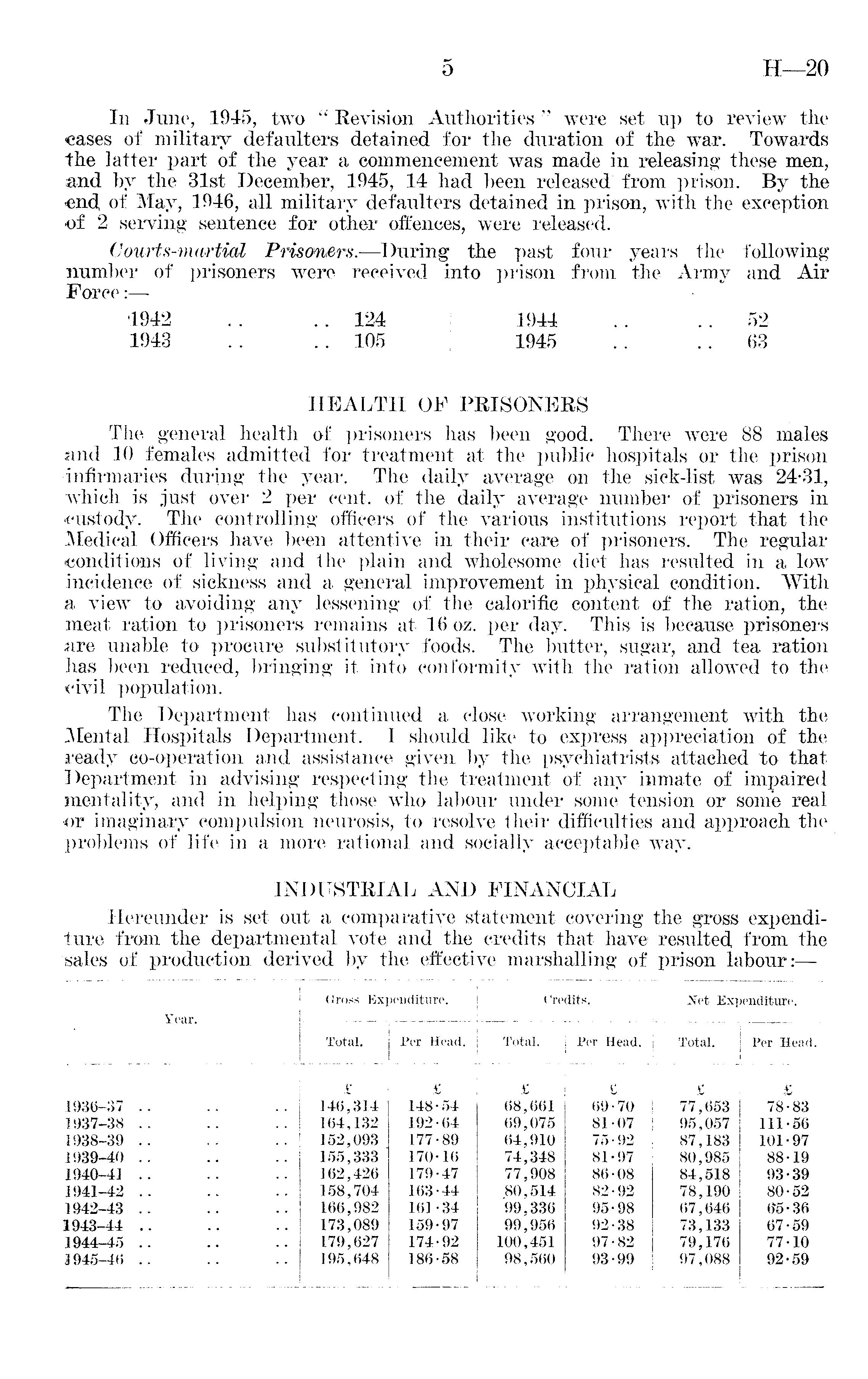 In June, 1945, two " Revision Authorities " were set up to review the ■cases of military defaulters detained for the duration of the war. Towards the latter part of the year a commencement was made in releasing these men, and by the 31st December, 1945, 14 had been released from prison. By the end, of May, 1946, all military defaulters detained in prison, with the exception of 2 serving* sentence for other offences, were released. Courts-martial Prisoners. —During the past four years the following number of prisoners were received into prison from the Army and Air Force:— 1942 .. .. 124 1944 .. .. 52 1943 . . .. 105 ! 1945 . . . . 63 HEALTH OF PRISONERS The general health of prisoners has been good. There were 88 males and 10 females admitted for treatment at the public hospitals or the prison infirmaries during the year. The daily average on the sick-list was 24-31, which is just over 2 per cent, of the daily average number of prisoners in custody. The controlling officers of the various institutions report that the Medical Officers have been attentive in their care of prisoners. The regular •conditions of living and the plain and wholesome diet has resulted in a low incidence of sickness and a general improvement in physical condition. With a view to avoiding any lessening of the calorific content of the ration, the meat ration to prisoners remains at 16 oz. per day. This is because prisoners are unable to procure substitutory foods. The butter, sugar, and tea ration has been reduced, bringing it into conformity with the ration allowed to the civil population. The Department has continued a close working arrangement with the Mental Hospitals Department. I should like to express appreciation of the ready co-operation and assistance given by the psychiatrists attached to that Department in advising respecting the treatment of any inmate of impaired mentality, and in helping those who labour under some tension or some real or imaginary compulsion neurosis, to resolve their difficulties and approach the problems of life in a more rational and socially acceptable way. INDUSTRIAL AND FINANCIAL Hereunder is set out a comparative statement covering the gross expenditure from the departmental vote and the credits that have resulted from the sales of production derived by the effective marshalling of prison labour:—