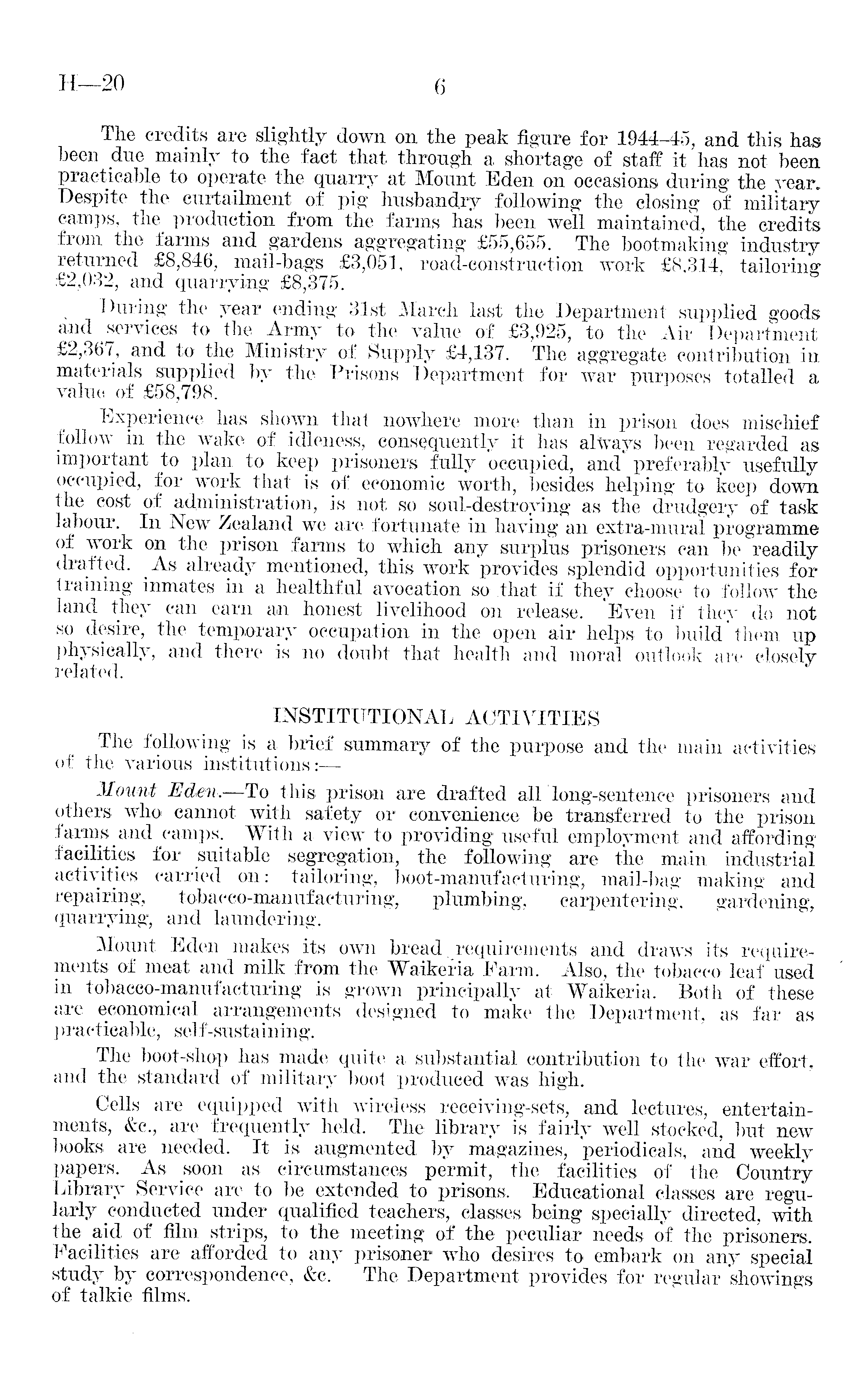 The credits are slightly down on the peak figure for 1944-45, and this has been due mainly to the fact that through a shortage of staff it has not been practicable to operate the quarry at Mount Eden on occasions during the year. Despite the curtailment of pig husbandry following the closing of military camps, the production from the farms has been well maintained, the credits from the farms and gardens aggregating £55,655. The bootmaking industry returned £8,846, mail-bags £3,051, road-construction work £8,314, tailoring £2,032, and quarrying £8,375. During the year ending 31st March last the Department supplied goods and services to the Army to the value of £3,925, to the Air Department £2,367, and to the Ministry of Supply £4,137. The aggregate contribution in materials supplied by the Prisons Department for war purposes totalled a value of £58,798. Experience has shown that nowhere more than in prison does mischief follow in the wake of idleness, consequently it has always been regarded as important to plan to keep prisoners fully occupied, and' preferably usefully occupied, for work that is of economic worth, besides helping to keep down the cost of administration, is not so soul-destroying as the drudgery of task labour. In New Zealand we are fortunate in having an extra-mural programme of work on the prison farms to which any surplus prisoners can be readily dratted. As already mentioned, this work provides splendid opportunities for training inmates in a healthful avocation so that if they choose to follow the land they can earn an honest livelihood on release. Even if they do not so desire, the temporary occupation in the open air helps to build them up physically, and there is no doubt that health and moral outlook are closelv related. INSTITUTIONAL ACTIVITIES The following is a brief summary of the purpose and the main activities of the various institutions:— Mount Eden.+~To this prison are drafted all long-sentence prisoners and others who cannot with safety or convenience be transferred to the prison farms and camps, With a view to providing useful employment and affording facilities for suitable segregation, the following are the main industrial activities carried on: tailoring, boot-manufacturing, mail-bag making and repairing, tobacco-manufacturing, plumbing, carpentering, gardening, quarrying, and laundering. Mount Eden makes its own bread requirements and draws its requirements of meat and milk from the Waikeria Farm. Also, the tobacco leaf used in tobacco-manufacturing is grown principally at Waikeria. Both of these are economical arrangements designed to make the Department, as far as practicable, self-sustaining. The boot-shop has made quite a substantial contribution to the war effort, and the standard of military boot produced was high. Cells are equipped with wireless receiving-sets, and lectures, entertainments, &c., are frequently held. The library is fairly well stocked, but new books are needed. It is augmented by magazines, periodicals, and weekly papers. As soon as circumstances permit, the facilities of the Country Library Service are to be extended to prisons, Educational classes are regularly conducted under qualified teachers, classes being specially directed, with the aid of film strips, to the meeting of the peculiar needs of the prisoners. Facilities are afforded to any prisoner who desires to embark on any special study by correspondence, &c. The Department provides for regular showings of talkie films.