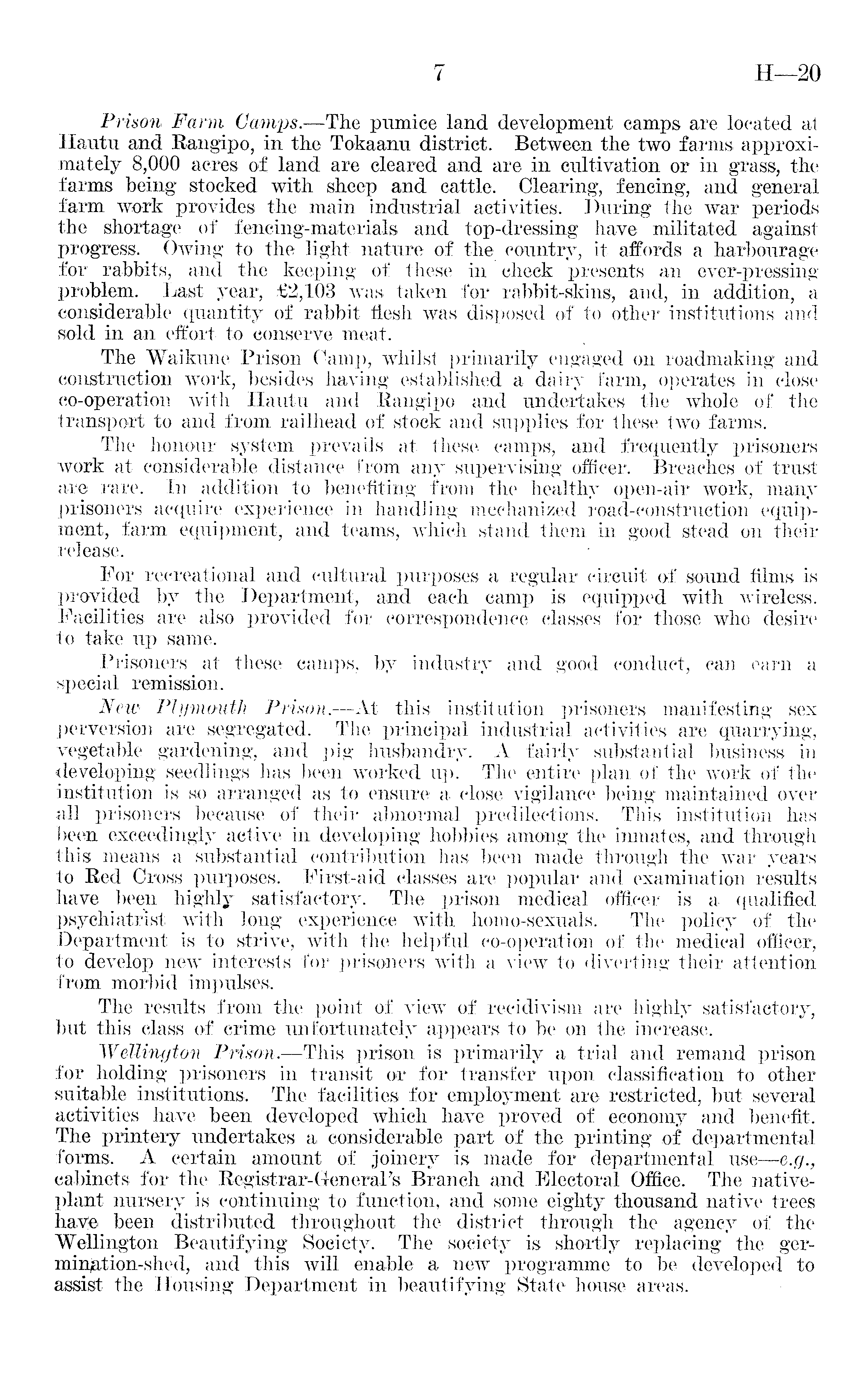 Prison Farm Camps.—The pumice land development camps are located at Hautu and Rangipo, in the Tokaanu district. Between the two farms approximately 8,000 acres of land are cleared and are in cultivation or in grass, the farms being* stocked with sheep and cattle. Clearing, fencing, and general farm work provides the main industrial activities. During the war periods the shortage of fencing-materials and top-dressing have militated against progress. Owing to the light nature of the country, it affords a harbourage for rabbits, and the keeping of these in check presents an ever-pressing problem. Last year, £2,103 was taken for rabbit-skins, and, in addition, a considerable quantity of rabbit flesh was disposed of to other institutions and sold in an effort to conserve meat. The Waikune Prison Camp, whilst primarily engaged on roadmaking and construction work, besides having established a dairy farm, operates in close co-operation with Hautu and Rangipo and undertakes the whole of the transport to and from railhead of stock and supplies for these two farms. The honour system prevails at these camps, and frequently prisoners work at considerable distance from any supervising officer. Breaches of trust are rare. In addition to benefiting from the healthy open-air work, many prisoners acquire experience in handling mechanized road-construction equipment, farm equipment, and teams, which stand them in good stead on their release. For recreational and cultural purposes a regular circuit of sound films is provided by the Department, and each camp is equipped with wireless. Facilities are also provided for correspondence classes for those who desire to take up same. Prisoners at these camps, by industry and good conduct, can earn a special remission. New Plymouth Prison.—At this institution prisoners manifesting sex perversion are segregated. The principal industrial activities are quarrying, vegetable gardening, and pig husbandry. A fairly substantial business in developing seedlings has been worked up. The entire plan of the work of the institution is so arranged as to ensure a close vigilance being maintained over all prisoners because of their abnormal predilections. This institution has been exceedingly active in developing hobbies among the inmates, and through this means a substantial contribution has been made through the war years to Red Cross purposes. First-aid classes are popular and examination results have been highly satisfactory. The prison medical officer is a qualified psychiatrist with long experience with homo-sexuals. The policy of the Department is to strive, with the helpful co-operation of the medical officer, to develop new interests for prisoners with a view to diverting their attention from morbid impulses. The results from the point of view of recidivism are highly satisfactory, but this class of crime unfortunately appears to be on the increase. Wellington Prison.—This prison is primarily a trial and remand prison for holding prisoners in transit or for transfer upon classification to other suitable institutions. The facilities for employment are restricted, but several activities have been developed which have proved of economy and benefit. The printery undertakes a considerable part of the printing of departmental forms. A certain amount of joinery is made for departmental use—e.g., cabinets for the Registrar-General's Branch and Electoral Office, The nativeplant nursery is continuing to function, and some eighty thousand native trees have been distributed throughout the district through the agency of the Wellington Beautifying Society. The society is shortly replacing the ger-mination-shed, and this will enable a new programme to be developed to assist the Housing Department in beautifying State house areas.