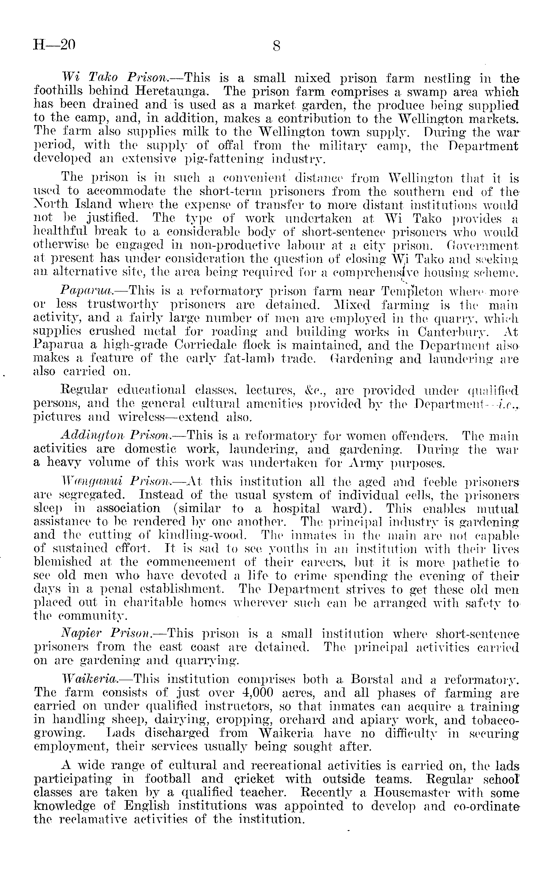 Wi Tako Prison. —This is a small mixed prison farm nestling in the foothills behind. Heretaunga. The prison farm comprises a swamp area which has been drained and is used as a market garden, the produce being supplied to the camp, and, in addition, makes a contribution to the Wellington markets. The farm also supplies milk to the Wellington town supply. During the war period, with the supply of offal from the military camp, the Department developed an extensive pig-fattening industry. The prison is in such a convenient distance from Wellington that it is used to accommodate the short-term prisoners from the southern end of the North Island where the expense of transfer to more distant institutions would not be justified. The type of work undertaken at Wi Tako provides a healthful break to a considerable body of short-sentence prisoners who would otherwise be engaged in non-productive labour at a city prison. Government at present has under consideration the question of closing W,i Tako and seeking an alternative site, the area being required for a comprehensive housing scheme. Papm^wa.—This is a reformatory prison farm near Templeton where more or less trustworthy prisoners are detained. Mixed farming is the main activity, and a fairly large number of men are employed in the quarry, which supplies crushed metal for roading and building works in Canterbury. At Paparua a high-grade Corriedale flock is maintained, and the Department also makes a feature of the early fat-lamb trade. Gardening and laundering are also carried on. Regular educational classes, lectures, &c., are provided under qualified persons, and the general cultural amenities provided by the Department—i.e. r pictures and wireless —extend also. Adding ton Prison, —This is a reformatory for women offenders. The main activities are domestic work, laundering, and gardening. During the war a heavy volume of this work was undertaken for Army purposes. Wamgamm Prison.—At this institution all the aged and feeble prisoners are segregated. Instead of the usual system of individual cells, the prisoners sleep in association (similar to a hospital ward). This enables mutual assistance to be rendered by one another. The principal industry is gardening and the cutting of kindling-wood. The inmates in the main are not capable of sustained effort. It is sad to see youths in an institution with their lives blemished at the commencement of their careers, but it is more pathetic tosee old men who have devoted a life to crime spending the evening of their days in a penal establishment. The Department strives to get these old men placed out in charitable homes wherever such can be arranged with safety tothe community. Napier Prison. —This prison is a small institution where short-sentence prisoners from the east coast are detained. The principal activities carried on are gardening and quarrying. Waikeria.—This institution comprises both a Borstal and a reformatory. The farm consists of just over 4,000 acres, and all phases of farming are carried on under qualified instructors, so that inmates can acquire a training in handling sheep, dairying, cropping, orchard and apiary work, and tobaccogrowing. Lads discharged from Waikeria have no difficulty in securing employment, their services usually being sought after. A wide range of cultural and recreational activities is carried on, the lads participating in football and qrieket with outside teams. Regular school classes are taken by a qualified teacher. Recently a Housemaster with some knowledge of English institutions was appointed to develop and co-ordinate the reelamative activities of the institution.