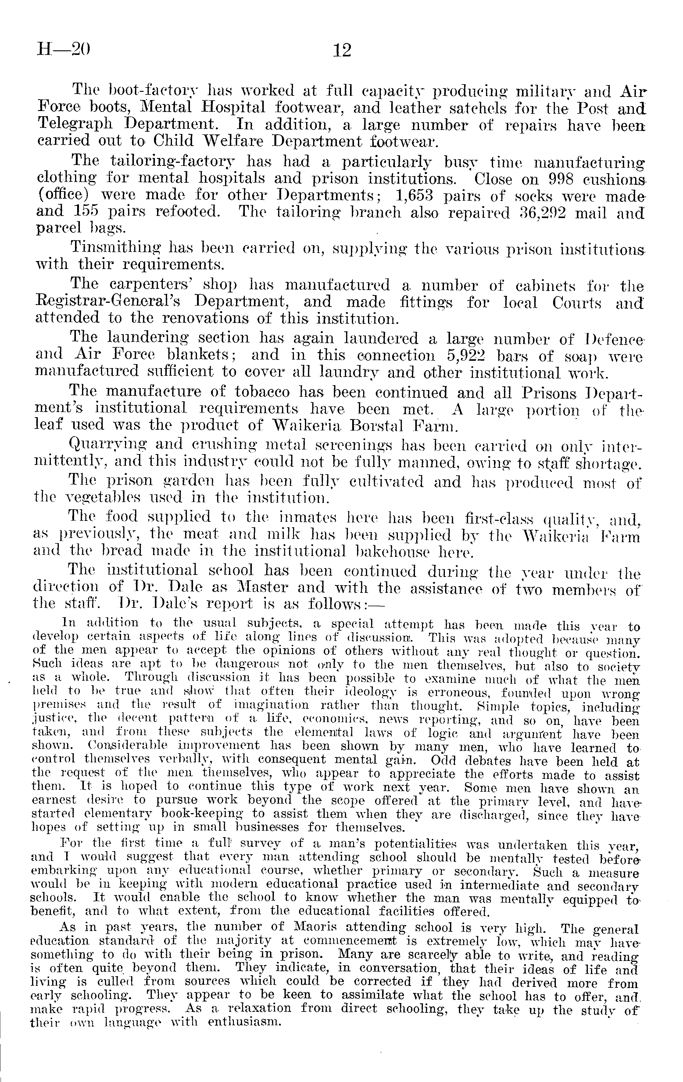 The boot-factory has worked at full capacity producing military and Air Force boots, Mental Hospital footwear, and leather satchels for the Post and Telegraph Department. In addition, a large number of repairs have been carried out to Child Welfare Department footwear. The tailoring-factory has had a particularly busy time manufacturing clothing for mental hospitals and prison institutions. Close on 998 cushions (office) were made for other Departments; 1,653 pairs of socks were made and 155 pairs refooted. The tailoring branch also repaired 36,292 mail and parcel bags. Tinsmithing has been carried on, supplying the various prison institutions with their requirements. The carpenters' shop has manufactured a number of cabinets for the Kegistrar-General's Department, and made fittings for local Courts and attended to the renovations of this institution. The laundering section has again laundered a large number of Defence and Air Force blankets; and in this connection 5,922 bars of soap were manufactured sufficient to cover all laundry and other institutional work. The manufacture of tobacco has been continued and all Prisons Department's institutional requirements have been met. A large portion of the leaf used was the product of Waikeria Borstal Farm. Quarrying and crushing metal screenings has been carried on only intermittently, and this industry could not be fully manned, owing to staff shortage. The prison garden has been fully cultivated and has produced most of the vegetables used in the institution. The food supplied to the inmates here lias been first-class quality, and r as previously, the meat and milk has been supplied by the Waikeria Farm and the bread made in the institutional bakehouse here. The institutional school has been continued during the year under the direction of Dr. Dale as Master and with the assistance of two members of the staff. Dr. Dale's report is as follows: In addition to the usual subjects, a special attempt has been made this year to* develop certain aspects of life along lines of discussion!. This was adopted because many of the men appear to accept the opinions of others without any real thought or question. Such ideas are apt to be dangerous not only to the men themselves, but also to society as a whole. Through discussion it has been possible to examine much of what the men held to be true and show that often their ideology is erroneous, founded upon wrong premises and the result of imagination rather than thought. Simple topics, including justice, the decent pattern of a life, economics, news reporting, and so on, have been taken, and from these subjects the elemental laws of logic and argument have been shown. Considerable improvement has been shown by many men, who have learned tocontrol themselves verbally, with consequent mental gain. Odd debates have been held at the request of the men themselves, who appear to appreciate the efforts made to assist them. It is hoped to continue this type of work next year. Some men have shown an earnest desire to pursue work beyond the scope offered at the primary level, and have started elementary book-keeping to assist them when they are discharged, since they have hopes of setting up in small businesses for themselves. For the first time a full survey of a man's potentialities was undertaken this year and I would suggest that every man attending school should be mentally tested beforeembarking upon any educational course, whether primary or secondary. Such a measurewould be in keeping with modern educational practice used i-n intermediate and secondary schools. It would enable the school to know whether the man was mentally equipped tobenefit, and to what extent, from the educational facilities offered. As in past years, the number of Maoris attending school is very high. The general education standard of the majority at commencement is extremely low, which may havesomething to do with their being in prison. Many are scarcely able to write, and reading is often quite beyond them. They indicate, in conversation, that their ideas of life and living is culled from sources which could be corrected if they had derived more from early schooling. They appear to be keen to assimilate what the school has to offer, and. make rapid progress. As a relaxation from direct schooling, they take up the study of their own language with enthusiasm.
