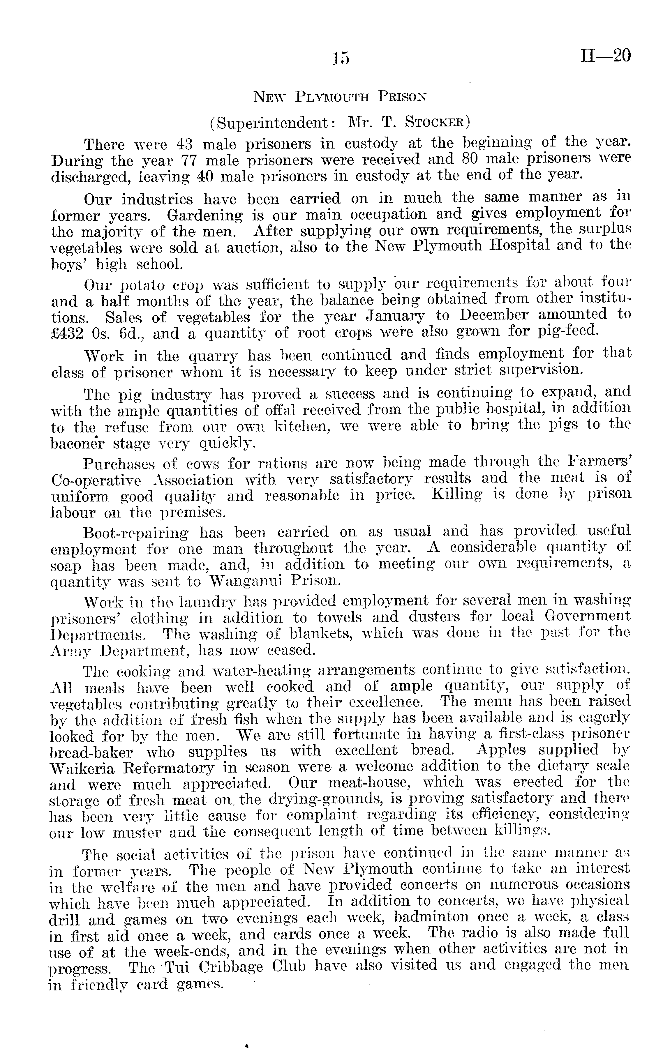 New Plymouth Prison (Superintendent: Mr. T. Stocker) There were 43 male prisoners in custody at the beginning of the year. During the year 77 male prisoners were received and 80 male prisoners were discharged, leaving 40 male prisoners in custody at the end of the year. Our industries have been carried on in much the same manner as in former years. Gardening is our main occupation and gives employment for the majority of the men. After supplying our own requirements, the surplus vegetables were sold at auction, also to the New Plymouth Hospital and to the boys' high school. Our potato crop was sufficient to supply our requirements for about four and a half months of the year, the balance being obtained from other institutions. Sales of vegetables for the year January to December amounted to £432 os. 6d., and a quantity of root crops were also grown for pig-feed. Work in the quarry has been continued and finds employment for that class of prisoner whom it is necessary to keep under strict supervision. The pig industry has proved a success and is continuing to expand, _ and with the ample quantities of offal received from the public hospital, in addition to refuse from our own kitchen, we were able to bring the pigs to the baconer stage very quickly. Purchases of cows for rations are now being made through the Farmers' Co-operative Association with very satisfactory results and the meat is of uniform good quality and reasonable in price. Killing is done by prison labour on the premises. Boot-repairing has been carried on as usual and has provided useful employment for one man throughout the year. A considerable quantity of soap has been made, and, in addition to meeting our own requirements, a quantity was sent to Wanganui Prison. Work in the laundry has provided employment for several men in washing prisoners' clothing in addition to towels and dusters for local Government Departments. The washing of blankets, which was done in the past for the Army Department, has now ceased. The cooking and water-heating arrangements continue to give satisfaction. All meals have been well cooked and of ample quantity, our supply of vegetables contributing greatly to their excellence. The menu has been raised by the addition of fresh fish when the supply has been available and is eagerly looked for by the men. We are still fortunate in having a first-class prisoner bread-baker who supplies us with excellent bread. Apples supplied by Waikeria Eeformatory in season were a welcome addition to the dietary scale and were much appreciated. Our meat-house, which was erected for the storage of fresh meat on. the drying-gmunds, is proving satisfactory and there has been very little cause for complaint regarding its efficiency, considering our low muster and the consequent length of time between killings. The social activities of the prison have continued in the same manner as in former years. The people of New Plymouth continue to take an interest in the Welfare of the men and have provided concerts on numerous occasions which have been much appreciated. In addition to concerts, we have physical drill and games on two evenings each week, badminton once a week, a class in first aid once a week, and cards once a week. The radio is also made full use of at the week-ends, and in the evenings when other activities are not in progress. The Tui Cribbage Club have also visited us and engaged the men in friendly card games.