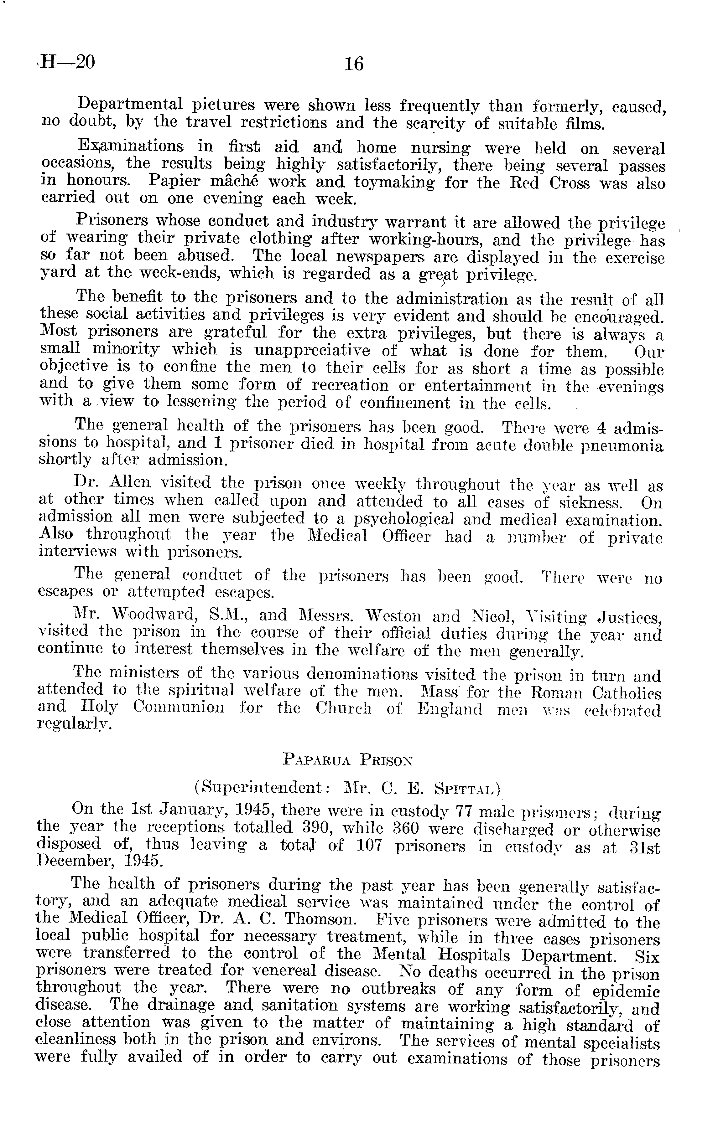 Departmental pictures were shown less frequently than formerly, caused, no doubt, by the travel restrictions and the scarcity of suitable films. Examinations in first aid and home nursing were held on several occasions, the results being highly satisfactorily, there being several passes in honours. Papier mache work and toymaking for the Red Cross was also carried out on one evening each week. Prisoners whose conduct and industry warrant it are allowed the privilege of wearing their private clothing after working-hours, and the privilege has so far not been abused. The local newspapers are displayed in the exercise yard at the week-ends, which is regarded as a great privilege. The benefit to the prisoners and to the administration as the result of all these social activities and privileges is very evident and should be encouraged. Most prisoners are grateful for the extra privileges, but there is always a small minority which is unappreciative of what is done for them. Our objective is to confine the men to their cells for as short a time as possible and to give them some form of recreation or entertainment in the evenings with a view to lessening the period of confinement in the cells. The general health of the prisoners has been good. There were 4 admissions to hospital, and 1 prisoner died in hospital from acute double pneumonia shortly after admission. Dr. Allen visited the prison once weekly throughout the year as well as at other times when called upon and attended to all eases of sickness. On admission all men were subjected to a psychological and medical examination. Also throughout the year the Medical Officer had a number of private interviews with prisoners. The general conduct of the prisoners has been good. There were no escapes or attempted escapes. Mr. Woodward, S.M., and Messrs. Weston and Nicol, Visiting Justices, visited the prison in the course of their official duties during the year and continue to interest themselves in the welfare of the men generally. The ministers of the various denominations visited the prison in turn and attended to the spiritual welfare of the men. Mass' for the Roman Catholics and Holy Communion for the Church of England men was celebrated regularly. Paparua Prison (Superintendent: Mr. C. E. Spittal) On the Ist January, 1945, there were in custody 77 male prisoners; during the year the receptions totalled 390, while 360 were discharged or otherwise disposed of, thus leaving a total of 107 prisoners in custody as at 31st December, 1945. The health of prisoners during the past year has been generally satisfactory, and an adequate medical service was maintained under the control of the Medical Officer, Dr. A. C. Thomson. Five prisoners were admitted to the local public hospital for necessary treatment, while in three cases prisoners were transferred to the control of the Mental Hospitals Department. Six prisoners were treated for venereal disease. No deaths occurred in the prison throughout the year. There were no outbreaks of any form of epidemic disease. The drainage and sanitation systems are working satisfactorily, and close attention was given to the matter of maintaining a high standard of cleanliness both in the prison and environs. The services of mental specialists were fully availed of in order to carry out examinations of those prisoners