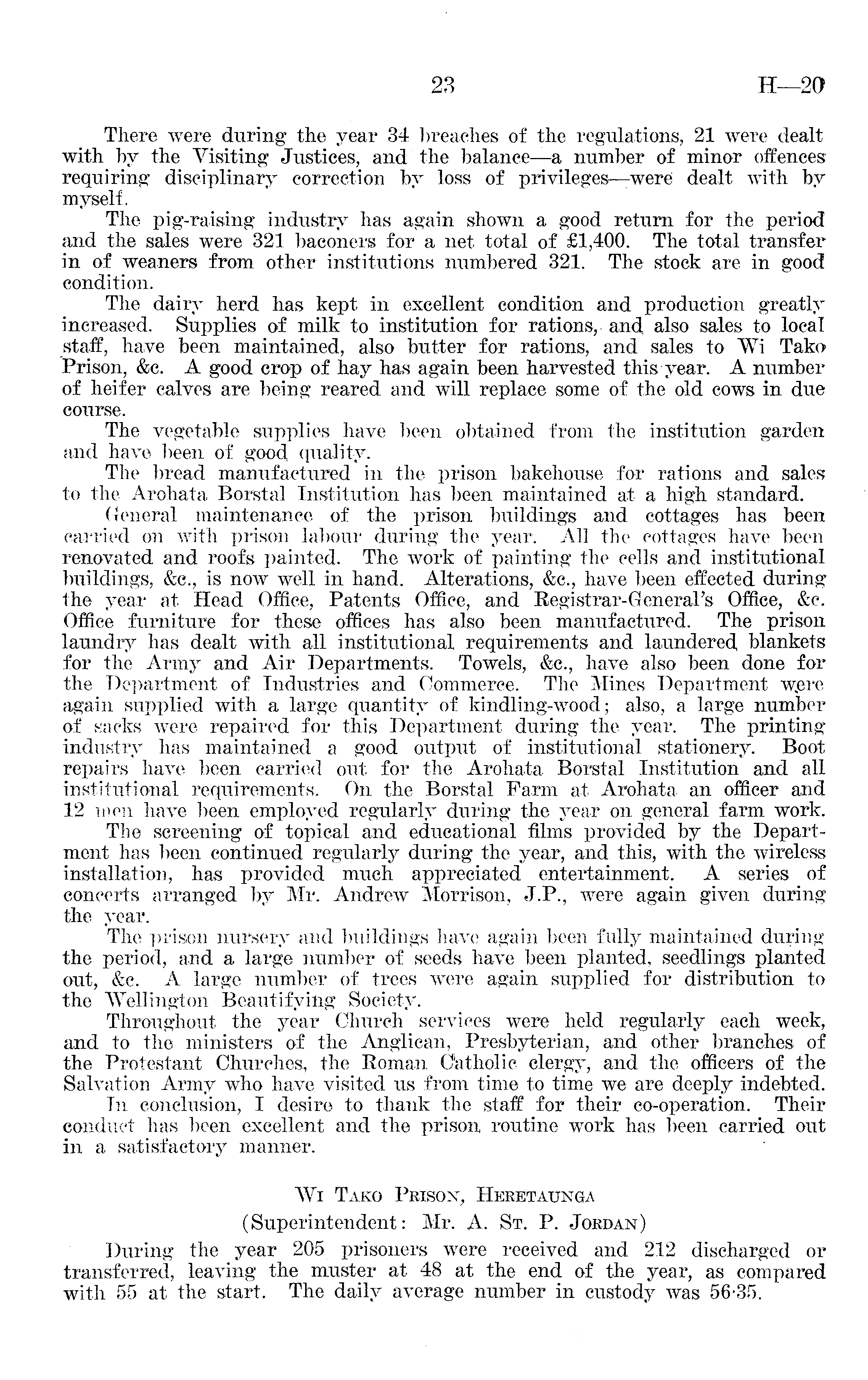 There were during the year 34 breaches of the regulations, 21 were dealt with by the Visiting Justices, and the balance—a number of minor offences requiring disciplinary correction by loss of privileges—were dealt with by myself. The pig-raising industry has again shown a good return for the period and the sales were 321 baconers for a net total of £1,400. The total transfer in of weaners from other institutions numbered 321. The stock are in good condition. The dairy herd has kept in excellent condition and production greatly increased. Supplies of milk to institution for rations, and also sales to local staff, have been maintained, also butter for rations, and sales to Wi Tako Prison, &c. A good crop of hay has again been harvested this year. A number of heifer calves are being reared and will replace some of the old cows in due course. The vegetable supplies have been obtained from the institution garden and have been of good, quality. The bread manufactured in the prison bakehouse for rations and sales to the Arohata Borstal Institution has been maintained at a high standard. General maintenance of the prison buildings and cottages has been carried on with prison labour during the year. All the cottages have been renovated and roofs painted. The work of painting the cells and institutional buildings, &c., is now well in hand. Alterations, &c., have been effected during the year at Head Office, Patents Office, and Registrar-General's Office, &e. Office furniture for these offices has also been manufactured. The prison laundry has dealt with all institutional requirements and laundered, blankets for the Army and Air Departments. Towels, &c., have also been done for the Department of Industries and Commerce. The Mines Department were again supplied with a large quantity of kindling-wood; also, a large number of sacks were repaired for this Department during the year. The printing industry has maintained a good output of institutional stationery. Boot repairs have been carried out for the Arohata Borstal Institution and all institutional requirements. On the Borstal Farm at Arohata an officer and 12 men have been employed regularly during the year on general farm work. The screening of topical and educational films provided by the Department has been continued regularly during the year, and this, with the wireless installation, has provided much appreciated entertainment. A series of concerts arranged by Mr. Andrew Morrison, J.P., were again given during the year. The prison nursery and buildings have again been fully maintained during the period, and a large number of seeds have been planted, seedlings planted out, &c. A large number of trees were again supplied for distribution to the Wellington Beautifying Society. Throughout the year Church services were held regularly each week, and to the ministers of the Anglican, Presbyterian, and other branches of the Protestant Churches, the Roman Catholic clergy, and the officers of the Salvation Army who have visited us from time to time we are deeply indebted. In conclusion, I desire to thank the staff for their co-operation. Their conduct has been excellent and the prison routine work has been carried out in a satisfactory manner. Wi Tako Prison, Heretaunga (Superintendent: Mr. A. St. P. Jordan) During the year 205 prisoners were received and 212 discharged or transferred, leaving the muster at 48 at the end of the year, as compared with 55 at the start. The daily average number in custody was 56-35.