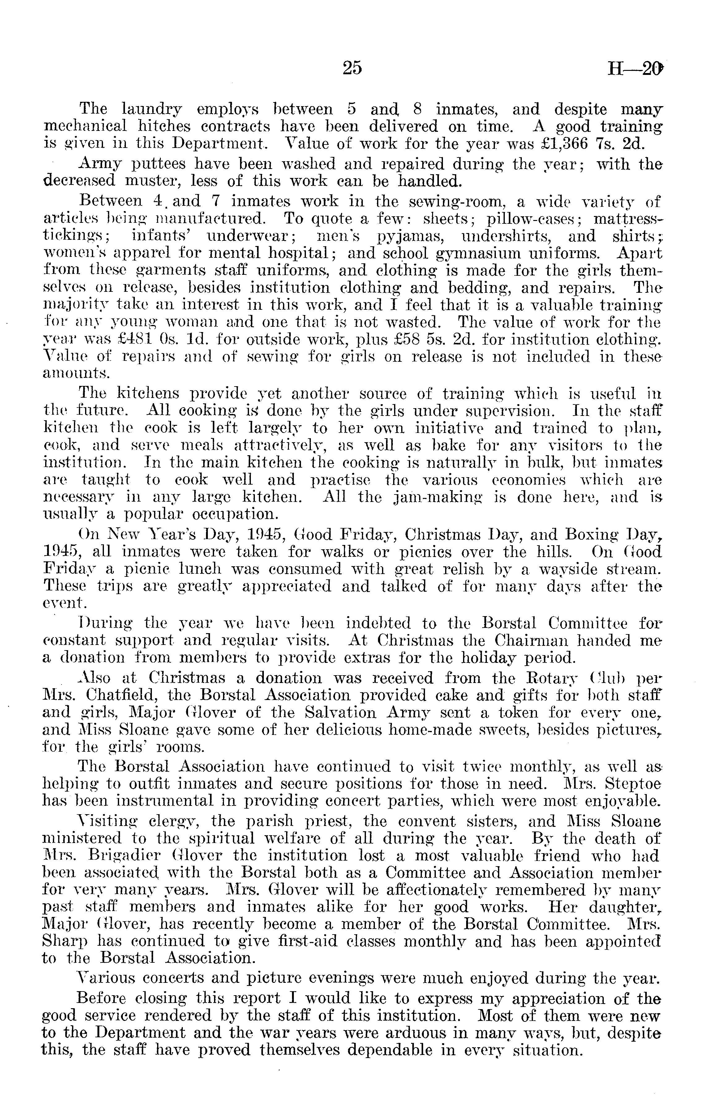 The laundry employs between 5 and, 8 inmates, and despite many mechanical hitches contracts have been delivered on time. A good training is given in this Department. Value of work for the year was £1,366 7s. 2d. Army puttees have been washed and repaired during the year; with the decreased muster, less of this work can be handled. Between 4. and 7 inmates work in the sewing-room, a wide variety of articles being manufactured. To quote a few: sheets; pillow-cases; mattresstickings; infants' underwear; men's pyjamas, undershirts, and shirts; women's apparel for mental hospital; and school gymnasium uniforms. Apart from these garments staff uniforms, and clothing is made for the girls themselves on release, besides institution clothing and bedding, and repairs. The majority take an interest in this work, and I feel that it is a valuable training for any young woman and one that is not wasted. The value of work for the year was £4Bl Os. Id. for outside work, plus £5B ss. 2d. for institution clothing. Value of repairs and of sewing for girls on release is not included in these amounts. The kitchens provide yet another source of training which is useful in the future. All cooking done by the girls under supervision. In the staff kitchen the cook is left largely to her own initiative and trained to plan,, cook, and serve meals attractively, as well as bake for any visitors to the institution. In the main kitchen the cooking is naturally in bulk, but inmates are taught to cook well and practise the various economies which are necessary in any large kitchen. All the jam-making is done here, and is usually a popular occupation. On New Year's Day, 1945, Good Friday, Christmas Day, and Boxing Day r 1945, all inmates were taken for walks or picnics over the hills. On Good Friday a picnic lunch was consumed with great relish by a wayside stream. These trips are greatly appreciated and talked of for many days after the event. During the year we have been indebted to the Borstal Committee for constant support and regular visits. At Christmas the Chairman handed me a donation from members to provide extras for the holiday period. Also at Christmas a donation was received from the Rotary Club per Mrs. Chatfield, the Borstal Association provided cake and gifts for both staff and girls, Major Glover of the Salvation Army sent a token for every one r and Miss Sloane gave some of her delicious home-made sweets, besides pictures,, for the girls' rooms, The Borstal Association have continued to visit twice monthly, as well as helping to outfit inmates and secure positions for those in need. Mrs. Steptoe has been instrumental in providing concert parties, which were most enjoyable. Visiting clergy, the parish priest, the convent sisters, and Miss Sloane ministered to the spiritual welfare of all during the year. By the death of Mrs. Brigadier Glover the institution lost a most valuable friend who had been associated, with the Borstal both as a Committee and Association member for very many years. Mrs. Glover will be affectionately remembered by many past staff members and inmates alike for her good works. Her daughter,. Major Glover, has recently become a member of the Borstal Committee. Mrs. Sharp has continued to give first-aid classes monthly and has been appointed to the Borstal Association. Various concerts and picture evenings were much enjoyed during the year. Before closing this report I would like to express my appreciation of the good service rendered by the staff of this institution. Most of them were new to the Department and the war years were arduous in many ways, but, despite this, the staff have proved themselves dependable in every situation.