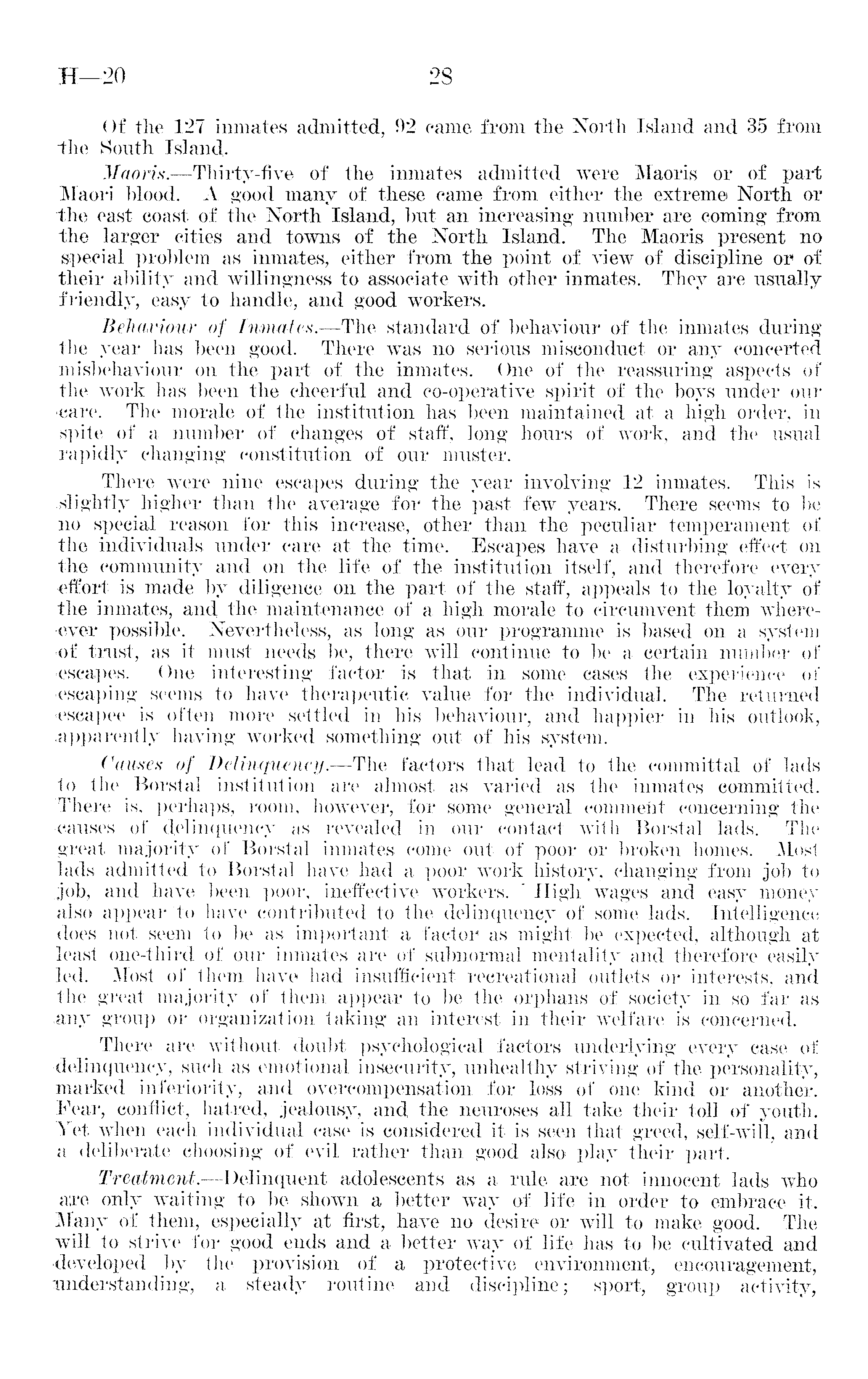 Of the 127 inmates admitted, 92 came from the North Island and 35 from "the South Island,. Maoris.—Thirty-five of the inmates admitted were Maoris or of part Maori blood. A good many of these came from either the extreme North or the east coast of the North Island, but an increasing number are coming from the larger cities and towns of the North Island. The Maoris present no special problem as inmates, either from the point of view of discipline or l of their ability and willingness to associate with other inmates. They are usually friendly, easy to handle, and good workers. Behaviour of Inmates.—The standard of behaviour of the inmates during the year has been good. There was no serious misconduct or any concerted misbehaviour on the part of the inmates. One of the reassuring aspects of the work has been the cheerful and co-operative spirit of the boys under our •care. The morale of the institution has been maintained at a high order, in -spite of a number of changes of staff, long hours of work, and the usual rapidly changing constitution of our muster. There were nine escapes during the year involving 12 inmates. This is .•slightly higher than the average for the past few years. There seems to be no special reason for this increase, other than the peculiar temperament of the individuals under care at the time. Escapes have a disturbing effect on the community and on the life of the institution itself, and therefore every -effort is made by diligence on the part of the staff, appeals to the loyalty of the inmates, and, the maintenance of a high morale to circumvent them where■ever possible. Nevertheless, as long as our programme is based on a system •of trust, as it must needs be, there will continue to be a certain number of ■escapes. One interesting factor is that in some cases the experience of -escaping seems to have therapeutic value for the individual. The returned •escapee is often more settled in his behaviour, and happier in his outlook, .apparently having worked something out of his system. Causes of Delinquency.—The factors that lead to the committal of lads to the Borstal institution are almost as varied as the inmates committed. There is, perhaps, room, however, for some general comment concerning the -causes of delinquency as revealed in our contact with Borstal lads. The great majority of Borstal inmates come out of poor or broken homes. Most lads admitted to Borstal have had a poor work history, changing from job to job, and have been poor, ineffective workers. * High wages and easy money also appear to have contributed to the delinquency of some lads. Intelligence •does not seem to be as important a factor as might be expected, although at least one-third of our inmates are of subnormal mentality and therefore easily led. Most of them have had insufficient recreational outlets or interests, and the great majority of them appear to be the orphans of society in so far as .any group or organization taking an interest in their welfare is concerned. There are without doubt psychological factors underlying every case of ■delinquency, such as emotional insecurity, unhealthy striving of the personality, marked inferiority, and overcompensation for loss of one kind or another. Fear, conflict, hatred, jealousy, and the neuroses all take their toll of youth. Yet, when each individual case is considered it is seen that greed, self-will, and a deliberate choosing of evil rather than good also play their part. Treatment. —Delinquent adolescents as a rule are not innocent lads who aire only waiting to be shown a better way of life in order to embrace it. Many of them, especially at first, have no desire or will to make good. The will to strive for good ends and a better way of life has to be cultivated and ■developed by the provision of a protective environment, encouragement, understanding, a steady routine and discipline; sport, group activity,