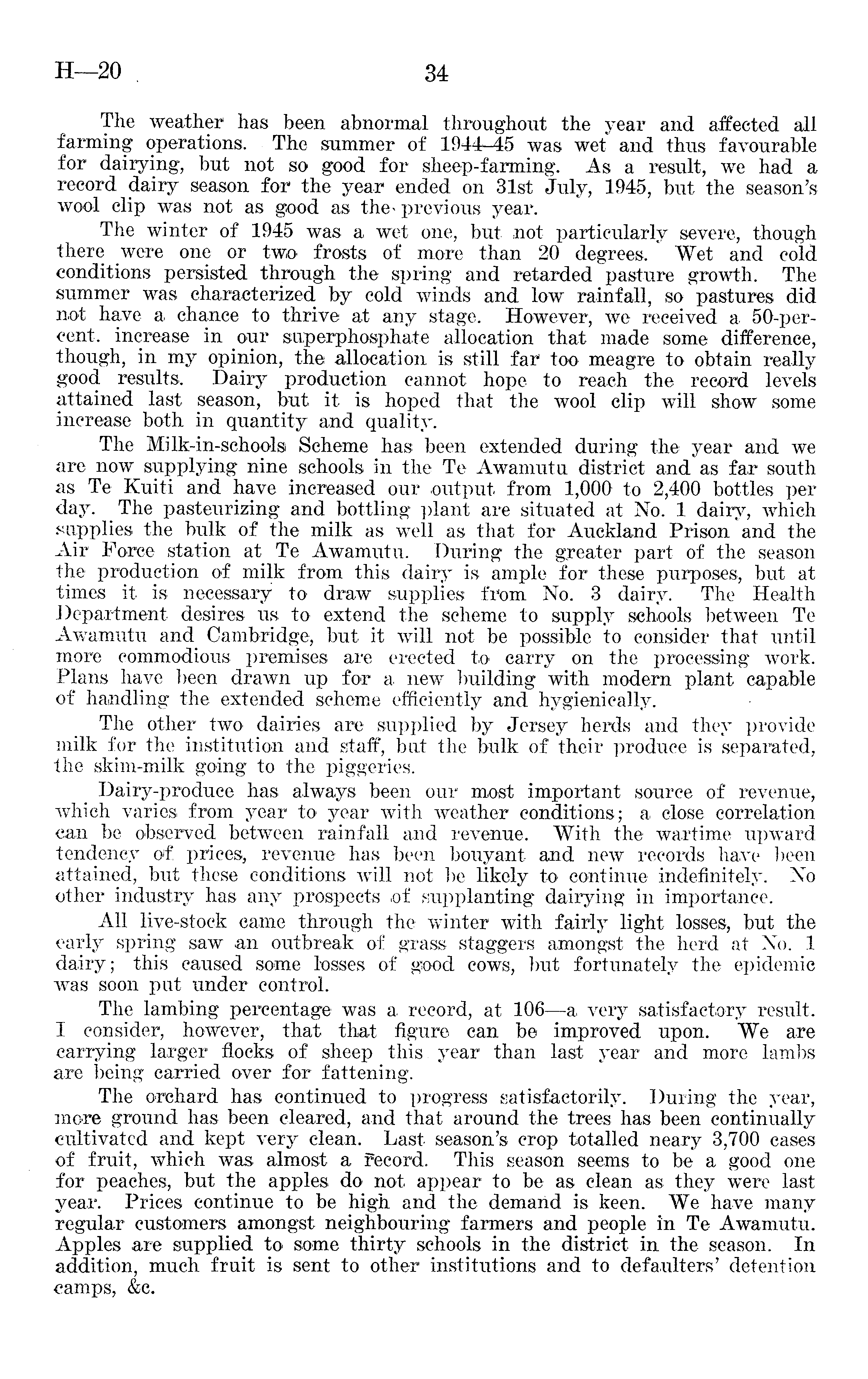 The weather has been abnormal throughout the year and affected all farming operations. The summer of 1944—45 was wet and thus favourable for dairying, but not so good for sheep-farming. As a result, we had a record dairy season for the year ended on 31st July, 1945, but the season's wool clip was not as good as the< previous year. The winter of 1945 was a wet one, but not particularly severe, though there were one or two frosts of more than 20 degrees. Wet and cold conditions persisted through the spring and retarded pasture growth. The summer was characterized by cold winds and low rainfall, so pastures did not have a chance to thrive at any stage. However, we received a 50-per-cent. increase in our superphosphate allocation that made some difference, though, in my opinion, the allocation is still far too meagre to obtain really good results. Dairy production cannot hope to reach the record levels attained last season, but it is hoped that the wool clip will show some increase both in quantity and quality. The Milk-in-schools Scheme has been extended during the year and we are now supplying nine schools in the Te Awamutu district and as far south as Te Kuiti and have increased our .output from 1,000 to 2,400 bottles per day. The pasteurizing and bottling plant are situated at No. 1 dairy, which supplies the bulk of the milk as well as that for Auckland Prison and the Air Force station at Te Awamutu. During the greater part of the season the production of milk from this dairy is ample for these purposes, but at times it is necessary to draw supplies from No. 3 dairy. The Health Department- desires us to extend the scheme to supply schools between Te Awamutu and Cambridge, but it will not be possible to consider that until more commodious premises are erected to carry on the processing work. Plans have been drawn up for a new building with modern plant capable of handling the extended scheme efficiently and hygienically. The other two dairies are supplied by Jersey herds and they provide milk for the institution and staff, but the bulk of their produce is separated, the skim-milk going to the piggeries. Dairy-produce has always been our most important source of revenue, which varies from year to year with weather conditions; a close correlation can be observed between rainfall and revenue. With the wartime upward tendency of prices, revenue has been bouyant and new records have been attained, but these conditions will not be likely to continue indefinitely. No other industry has any prospects of supplanting dairying in importance. All liye-stock came through the winter with fairly light losses, but the early spring saw an outbreak of grass staggers amongst the herd at No. .1 dairy; this caused some losses of good cows, but fortunately the epidemic was soon put under control. The lambing percentage was a. record, at 106—a very satisfactory result. I consider, however, that that figure can be improved upon. We are carrying larger flocks of sheep this, year than last year and more lambs are being carried over for fattening. The orchard has continued to progress satisfactorily. During the year, more ground has been cleared, and that around the trees has been continually cultivated and kept very clean. Last season's crop totalled neary 3,700 cases of fruit, which was. almost a record. This season seems to be a good one for peaches, but the apples do not appear to be as clean as they were last year. Prices continue to be high and the demand is keen. We have many regular customers amongst neighbouring farmers and people in Te Awamutu. Apples are supplied to some thirty schools in the district in the season. In addition, much fruit is sent to other institutions and to defaulters' detention camps, &c.