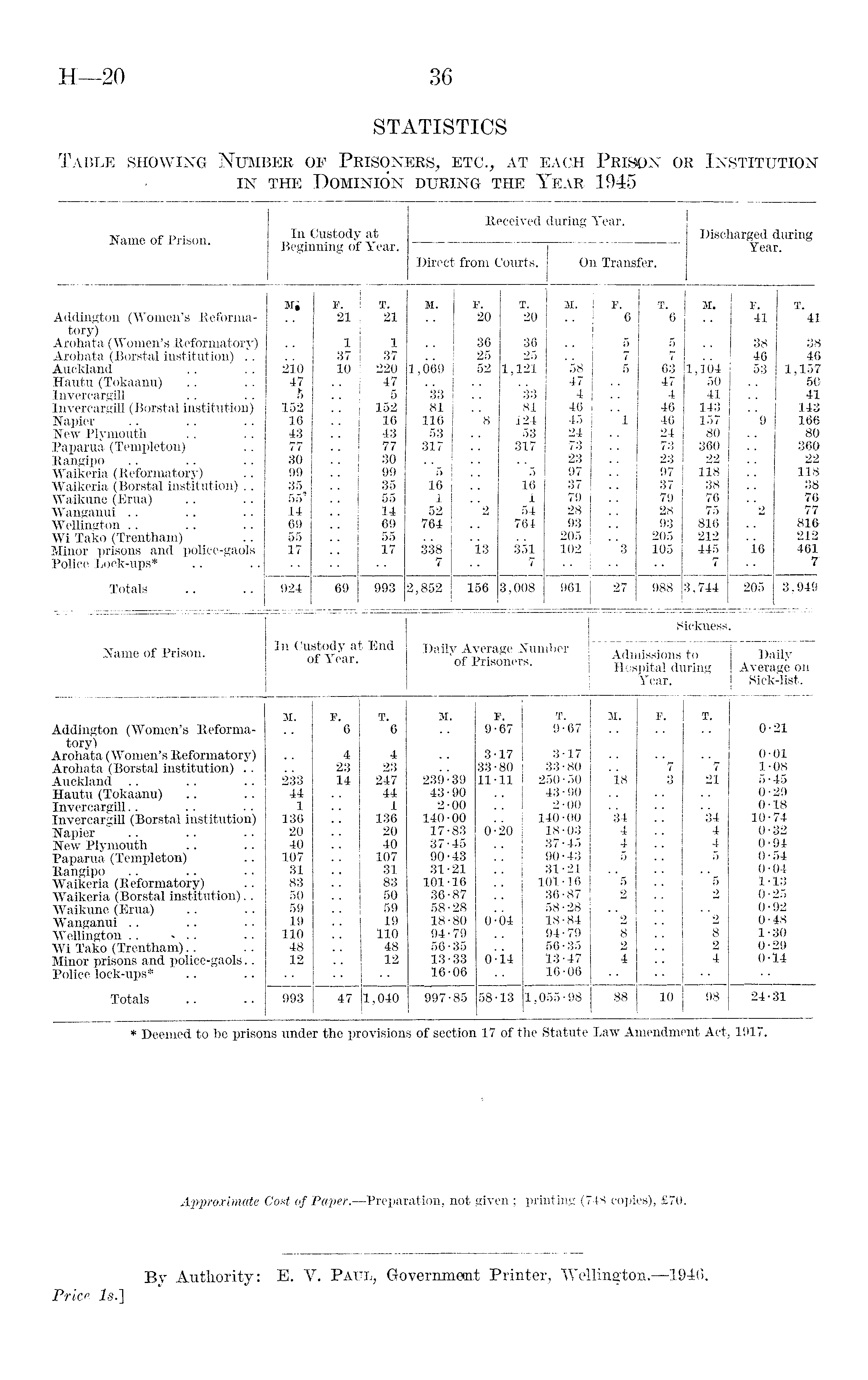 STATISTICS Table showing Number of Prisoners, etc., at each Prison or Institution in the Dominion during the Year 1945