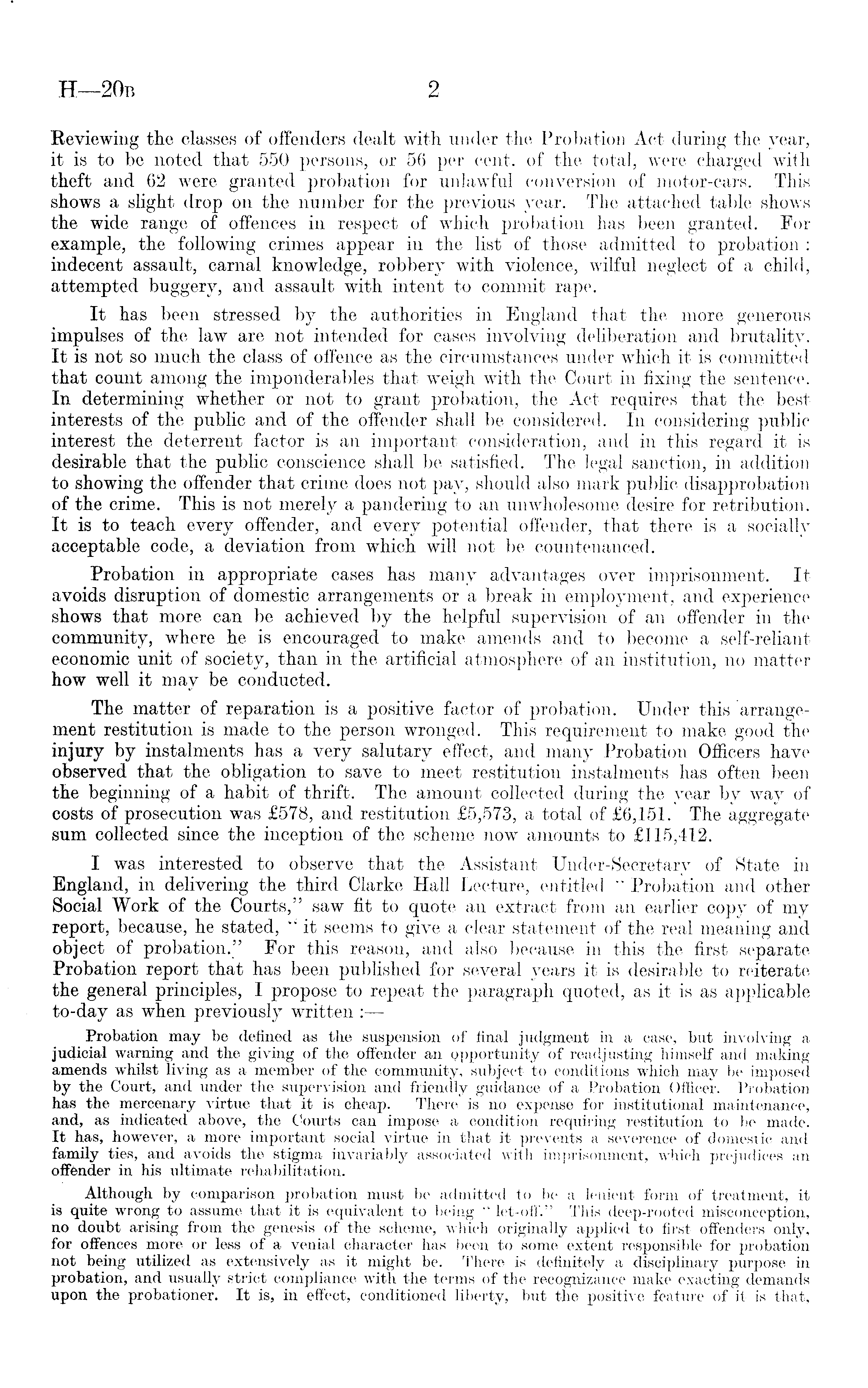 Reviewing the classes of offenders dealt with under the Probation Act during the year, it is to be noted that 550 persons, or 56 per cent, of the total, were charged with theft and 62 were granted probation for unlawful conversion of motor-cars. This shows a slight drop on the number for the previous year. The attached table shows the wide range of offences in respect of which probation has been granted. For example, the following crimes appear in the list of those admitted to probation : indecent assault, carnal knowledge, robbery with violence, wilful neglect of a child, attempted buggery, and assault with intent to commit rape. It has been stressed by the authorities in England that the more generous impulses of the law are not intended for cases involving deliberation and brutality. It is not so much the class of offence as the circumstances under which it is committed that count among the imponderables that weigh with the Court in fixing the sentence. In determining whether or not to grant probation, the Act requires that the best interests of the public and of the offender shall be considered. In considering public interest the deterrent factor is an important consideration, and in this regard it is desirable that the public conscience shall be satisfied. The legal sanction, in addition to showing the offender that crime does not pay, should also mark public disapprobation of the crime. This is not merely a pandering to an unwholesome desire for retribution. It is to teach every offender, and every potential offender, that there is a socially acceptable code, a deviation from which will not be countenanced. Probation in appropriate cases has many advantages over imprisonment. It avoids disruption of domestic arrangements or a break in employment, and experience shows that more can be achieved by the helpful supervision of an offender in the community, where he is encouraged to make amends and to become a self-reliant economic unit of society, than in the artificial atmosphere of an institution, no matter how well it may be conducted. The matter of reparation is a positive factor of probation. Under this arrangement restitution is made to the person wronged. This requirement to make good the injury by instalments has a very salutary effect, and many Probation Officers have observed that the obligation to save to meet restitution instalments has often been the beginning of a habit of thrift. The amount collected during the year by way of costs of prosecution was £578, and restitution £5,573, a total of £6,151. The aggregate sum collected since the inception of the scheme now amounts to £115,412. I was interested to observe that the Assistant Under-Secretary of State in England, in delivering the third Clarke Hall Lecture, entitled " Probation and other Social Work of the Courts," saw fit to quote an extract from an earlier copy of my report, because, he stated, " it seems to give a clear statement of the real meaning and object of probation." For this reason, and also because in this the first separate Probation report that has been published for several years it is desirable to reiterate the general principles, I propose to repeat the paragraph quoted, as it is as applicable to-day as when previously written : Probation may be defined as the suspension of final judgment in a case, but involving a judicial warning and the giving of the offender an opportunity of readjusting himself and making amends whilst living as a member of the community, subject to conditions which may be imposed by the Court, and under the supervision and friendly guidance of a Probation Officer. Probation has the mercenary virtue that it is cheap. There is no expense for institutional maintenance, and, as indicated above, the Courts can impose a condition requiring restitution to be made. It has, however, a more important social virtue in that it prevents a severence of domestic and family ties, and avoids the stigma invariably associated with imprisonment, which prejudices an offender in his ultimate rehabilitation. Although by comparison probation must be admitted to be a lenient form of treatment, it is quite wrong to assume that it is equivalent to being ' L let-off." This deep-rooted misconception, no doubt arising from the genesis of the scheme, which originally applied to first offenders only, for offences more or less of a venial character has been to some extent responsible for probation not being utilized as extensively as it might be. There is definitely a disciplinary purpose in probation, and usually strict compliance with the terms of the recognizance make exacting demands upon the probationer. It is, in effect, conditioned liberty, but the positive feature of it is that,