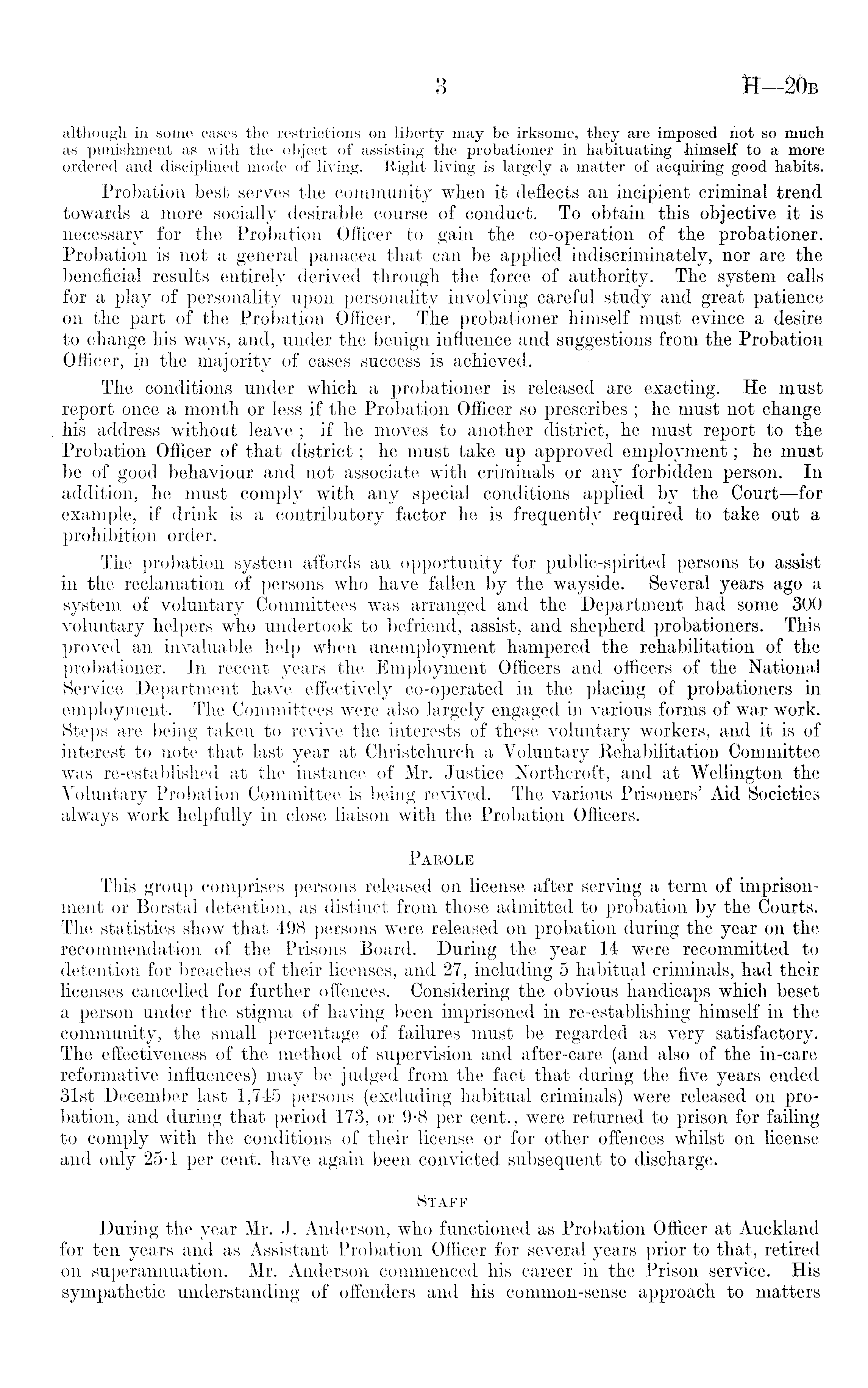 although in some cases the restrictions on liberty may be irksome, they are imposed hot so much as punishment as with the object of assisting the probationer in habituating himself to a more ordered and disciplined mode of living. Right living is largely a matter of acquiring good habits. Probation best serves the community" when it deflects an incipient criminal trend towards a more socially desirable course of conduct. To obtain this objective it is necessary for the Probation Officer to gain the co-operation of the probationer. Probation is not a general panacea that can be applied indiscriminately, nor are the beneficial results entirely derived through the force of authority. The system calls for a play of personality upon personality involving careful study and great patience on the part of the Probation Officer. The probationer himself must evince a desire to change his Avays, and, under the benign influence and suggestions from the Probation Officer, in the majority of cases success is achieved. The conditions under which a probationer is released are exacting. He must report once a month or less if the Probation Officer so prescribes ; he must not change his address without leave ; if he moves to another district, he must report to the Probation Officer of that district; he must take up approved employment; he must be of good behaviour and not associate with criminals or any forbidden person. In addition, he must comply with any special conditions applied by the Court—for example, if drink is a contributory factor he is frequently required to take out a prohibition order. The probation system affords an opportunity for public-spirited persons to assist in the reclamation of persons who have fallen by the wayside. Several years ago a system of voluntary Committees was arranged and the Department had some 300 voluntary helpers who undertook to befriend, assist, and shepherd probationers. This proved an invaluable help when unemployment hampered the rehabilitation of the probationer. In recent years the Employment Officers and officers of the National Service Department have effectively co-operated in the placing of probationers in employment. The Committees were also largely engaged in various forms of war work. Steps are being taken to revive the interests of these voluntary workers, and it is of interest to note that last year at Christchurch a Voluntary Rehabilitation Committee was re-established at the instance of Mr. Justice Northcroft, and at Wellington the Voluntary Probation Committee is being revived. The various Prisoners' Aid Societies always work helpfully in close liaison with the Probation Officers. Parole This group comprises persons released on license after serving a term of imprisonment or Borstal detention, as distinct from those admitted to probation by the Courts. The statistics show that 498 persons were released on probation during the year on the recommendation of the Prisons Board. During the year 14 were recommitted to detention for breaches of their licenses, and 27, including 5 habitual criminals, had their licenses cancelled for further offences. Considering the obvious handicaps which beset a person under the stigma of having been imprisoned in re-establishing himself in the community, the small percentage of failures must be regarded as very satisfactory. The effectiveness of the method of supervision and after-care (and also of the in-care reformative influences) may be judged from the fact that during the five years ended 31st December last 1,745 persons (excluding habitual criminals) were released on probation, and during that period 173, or 9-8 per cent., were returned to prison for failing to comply with the conditions of their license or for other offences whilst on license and only 25-1 per cent, have again been convicted subsequent to discharge. Staff During the year Mr. J. Anderson, who functioned as Probation Officer at Auckland for ten years and as Assistant Probation Officer for several years prior to that, retired on superannuation. Mr. Anderson commenced his career in the Prison service. His sympathetic understanding of offenders and his common-sense approach to matters