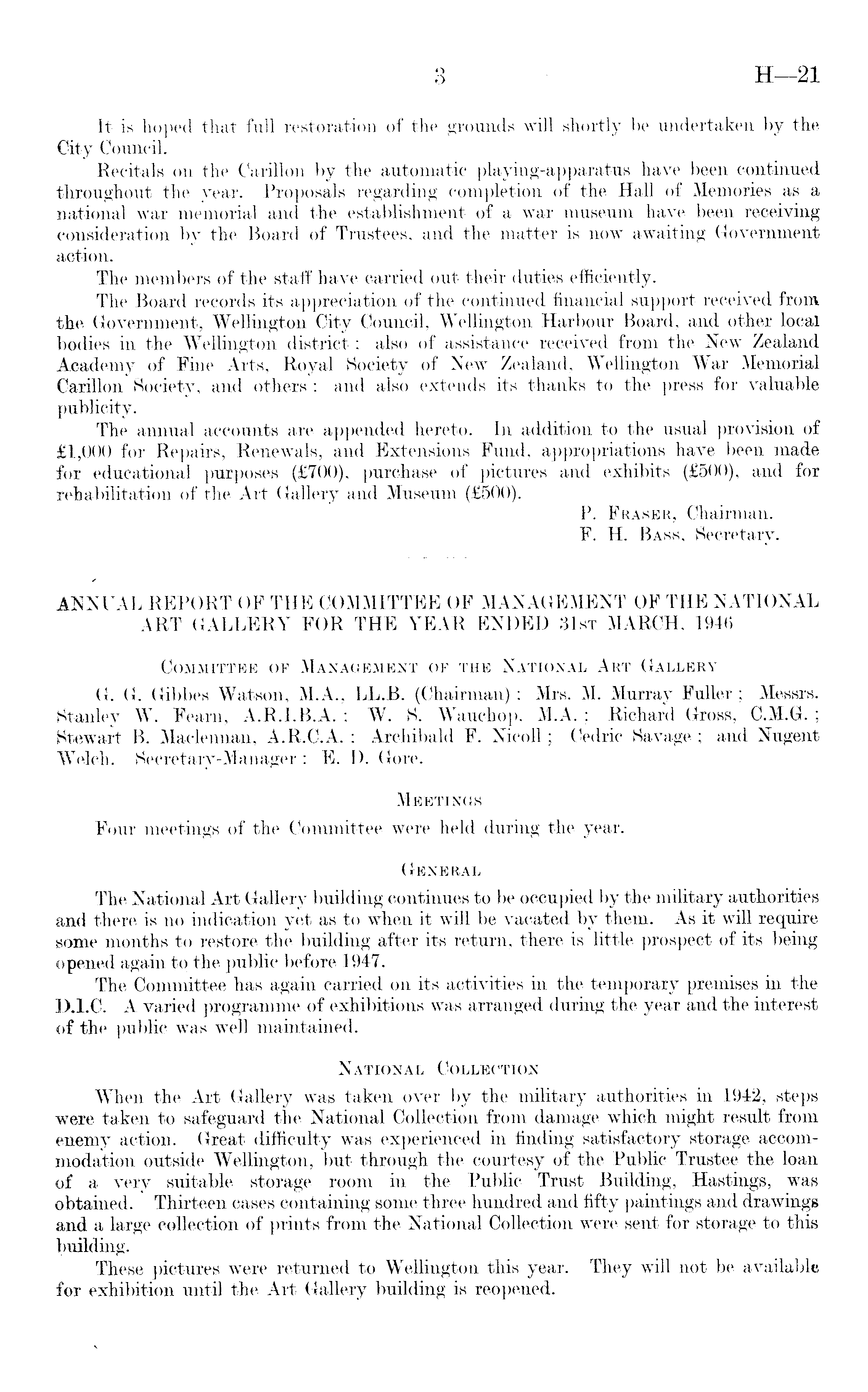 It is hoped that full restoration of the grounds will shortly be undertaken by the City Council. Recitals on the Carillon by the automatic playing-apparatus have been continued throughout the year. Proposals regarding completion of the Hall of Memories as a national war memorial and the establishment of a war museum have been receiving consideration by the Board of Trustees, and the matter is now awaiting Government action. The members of the staff have carried out their duties efficiently. The Board records its appreciation of the continued financial support received from the Government, Wellington City Council, Wellington Harbour Board, and other local bodies in the Wellington district; also of assistance received from the New Zealand Academy of Fine Arts, Royal Society of New Zealand, Wellington War Memorial Carillon Society, and others ; and also extends its thanks to the press for valuable publicity. The annual accounts are appended hereto. In addition to the usual provision of £l,OOO for Repairs, Renewals, and Extensions Fund, appropriations have been made for educational purposes (£700), purchase of pictures and exhibits (£500), and for rehabilitation of the Art Gallery and Museum (£500). P. Fraser, Chairman. F. H. Bass, Secretary.