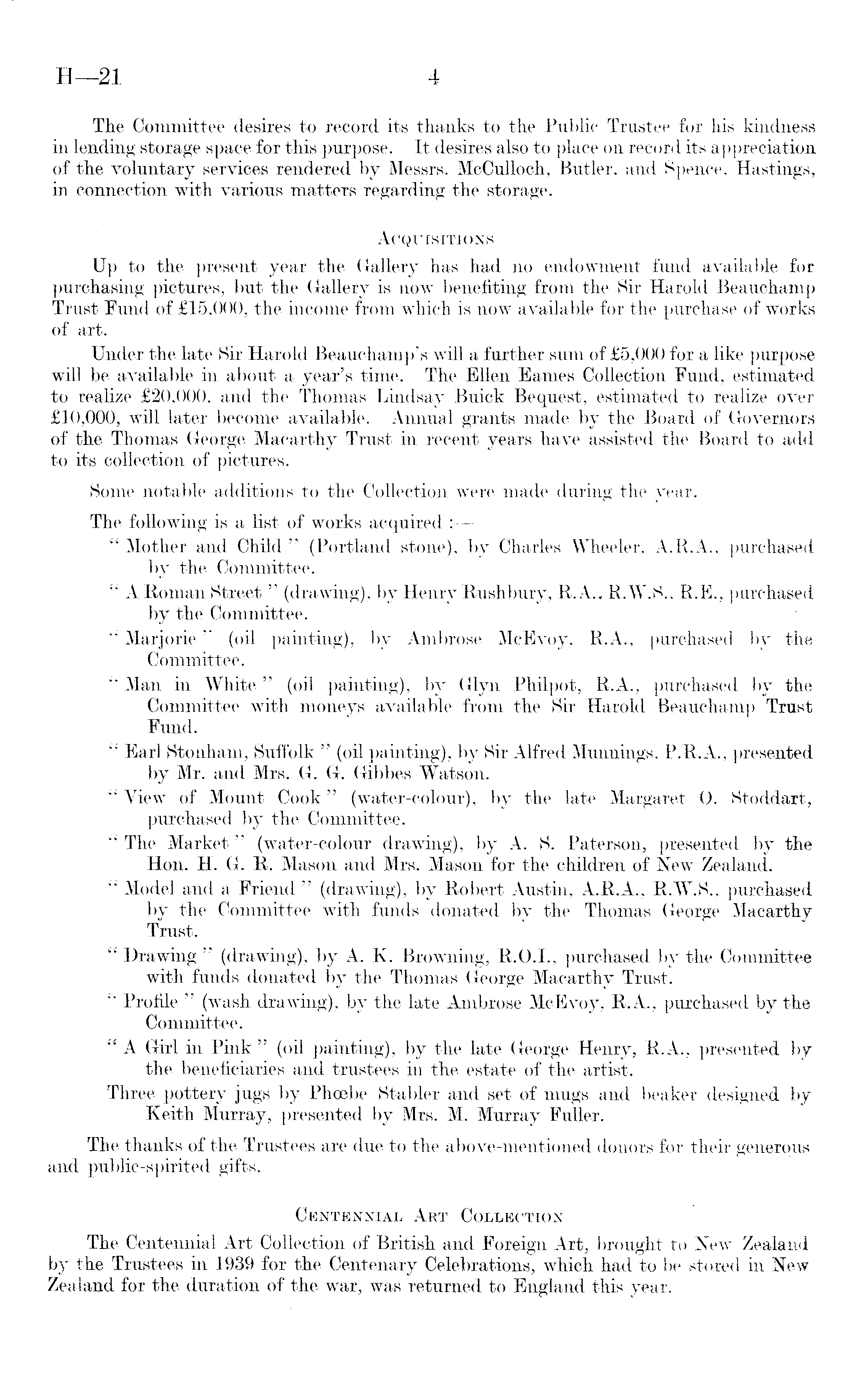 The Committee desires to record its thanks to the Public Trustee for his kindness in lending storage space for this purpose. It desires also to place on record its appreciation of the voluntary services rendered by Messrs. McCulloch, Butler, and Spence, Hastings, in connection with various matters regarding the storage. Acquisitions Up to the present year the Gallery has had no endowment fund available for purchasing pictures, but the Gallery is now benefiting from the Sir Harold Beauchamp Trust Fund of £15,000, the income from which is now available for the purchase of works of art. Under the late Sir Harold Beauchamp's will a further sum of £5,000 for a like purpose will be available in about a year's time. The Ellen Eames Collection Fund, estimated to realize £20,000, and the Thomas Lindsay Buick Bequest, estimated to realize over £lO,OOO, will later become available. Annual grants made by the Board of Governors of the Thomas George Macarthy Trust in recent years have assisted the Board to add to its collection of pictures. Some notable additions to the Collection were made during the year. The following is a list of works acquired : " Mother and Child " (Portland stone), by Charles Wheeler, A.R.A., purchased by the Committee. " A Roman Street " (drawing), by Henry Rushbury, R. A., R.W.S., R.E., purchased by the Committee. " Marjorie" (oil painting), by Ambrose McEvoy, R.A., purchased by the Committee. " Man in White" (oil painting), by 'Glyn Philpot, R.A., purchased by the Committee with moneys available from the Sir Harold Beauchamp Trust Fund. " Earl Stonham, Suffolk " (oil painting), by Sir Alfred Munnings, P.R.A., presented by Mr. and Mrs. G. G. Gibbes Watson. " View of Mount Cook" (water-colour), by the late Margaret O. Stoddart, purchased by the Committee. " The Market " (water-colour drawing), by A. S. Paterson, presented by the Hon. H. G. R. Mason and Mrs. Mason for the children of New Zealand. " Model and a Friend " (drawing), by Robert Austin, A.R.A., R.W.S., purchased by the Committee with funds donated by the Thomas George Macarthy Trust. " Drawing " (drawing), by A. K. Browning, R. 0.1., purchased by the Committee with funds donated by the Thomas George Macarthy Trust. " Profile " (wash drawing), by the late Ambrose McEvoy, R.A., purchased by the Committee. " A Girl in Pink " (oil painting), by the late George Henry, R.A., presented by the beneficiaries and trustees in the estate of the artist. Three pottery jugs by Phoebe Stabler and set of mugs and beaker designed by Keith Murray, presented by Mrs. M. Murray Fuller. The thanks of the Trustees are due to the above-mentioned donors for their generous and public-spirited gifts. Centennial Art Collection The Centennial Art Collection of British and Foreign Art, brought to New Zealand by the Trustees in 1939 for the Centenary Celebrations, which had to be stored in New Zealand for the duration of the war, was returned to England this year.