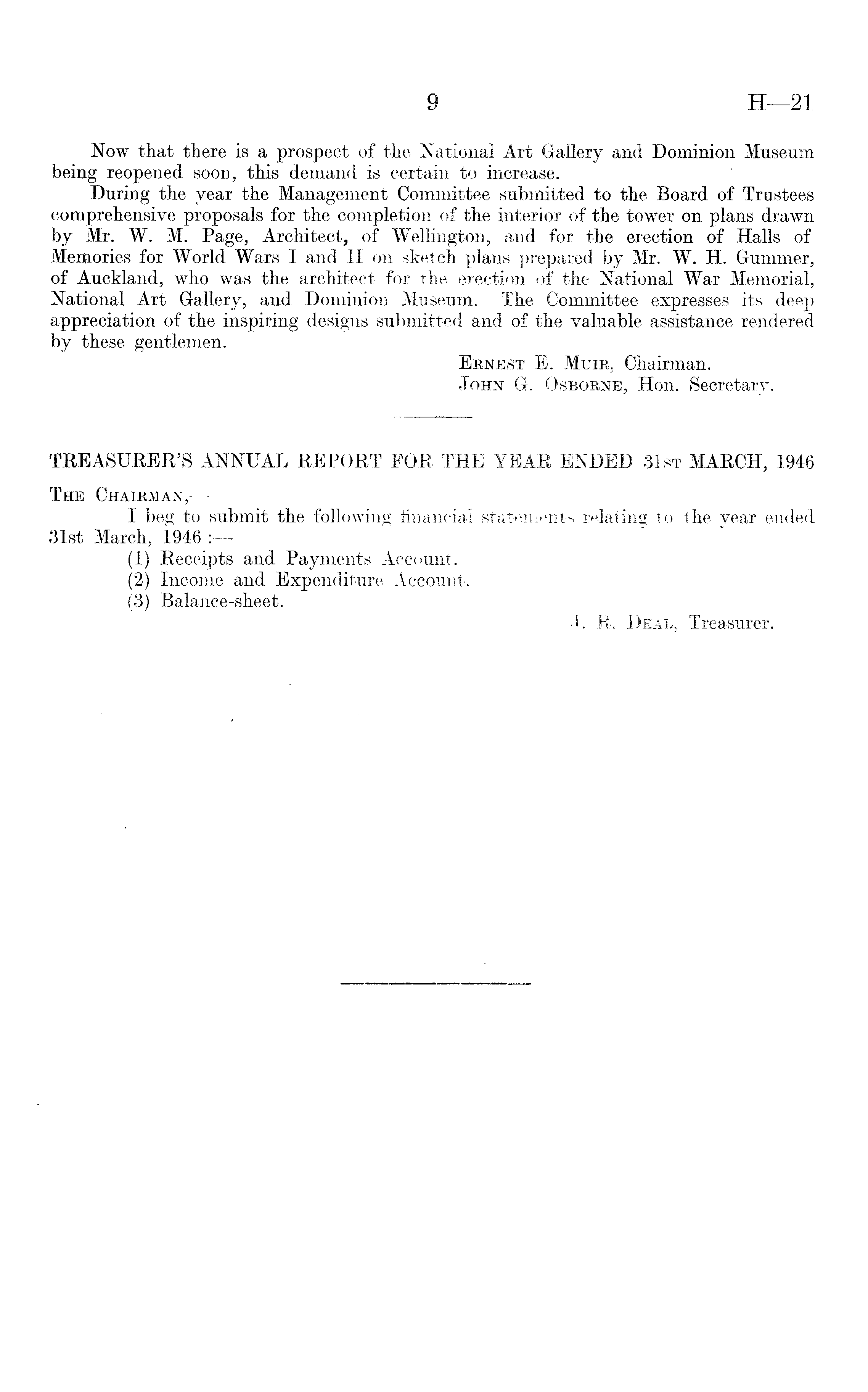 Now that there is a prospect of the National Art Gallery and Dominion Museum being reopened soon, this demand is certain to increase. During the year the Management Committee submitted to the Board of Trustees comprehensive proposals for the completion of the interior of the tower on plans drawn by Mr. W. M. Page, Architect, of Wellington, and for the erection of Halls of Memories for World Wars I and II on sketch plans prepared by Mr. W. H. Gummer, of Auckland, who was the architect for the erection of the National War Memorial, National Art Gallery, and Dominion Museum. The Committee expresses its deep appreciation of the inspiring designs submitted and of the valuable assistance rendered by these gentlemen. Ernest E. Muir, Chairman. John G. Osborne, Hon. Secretary.
