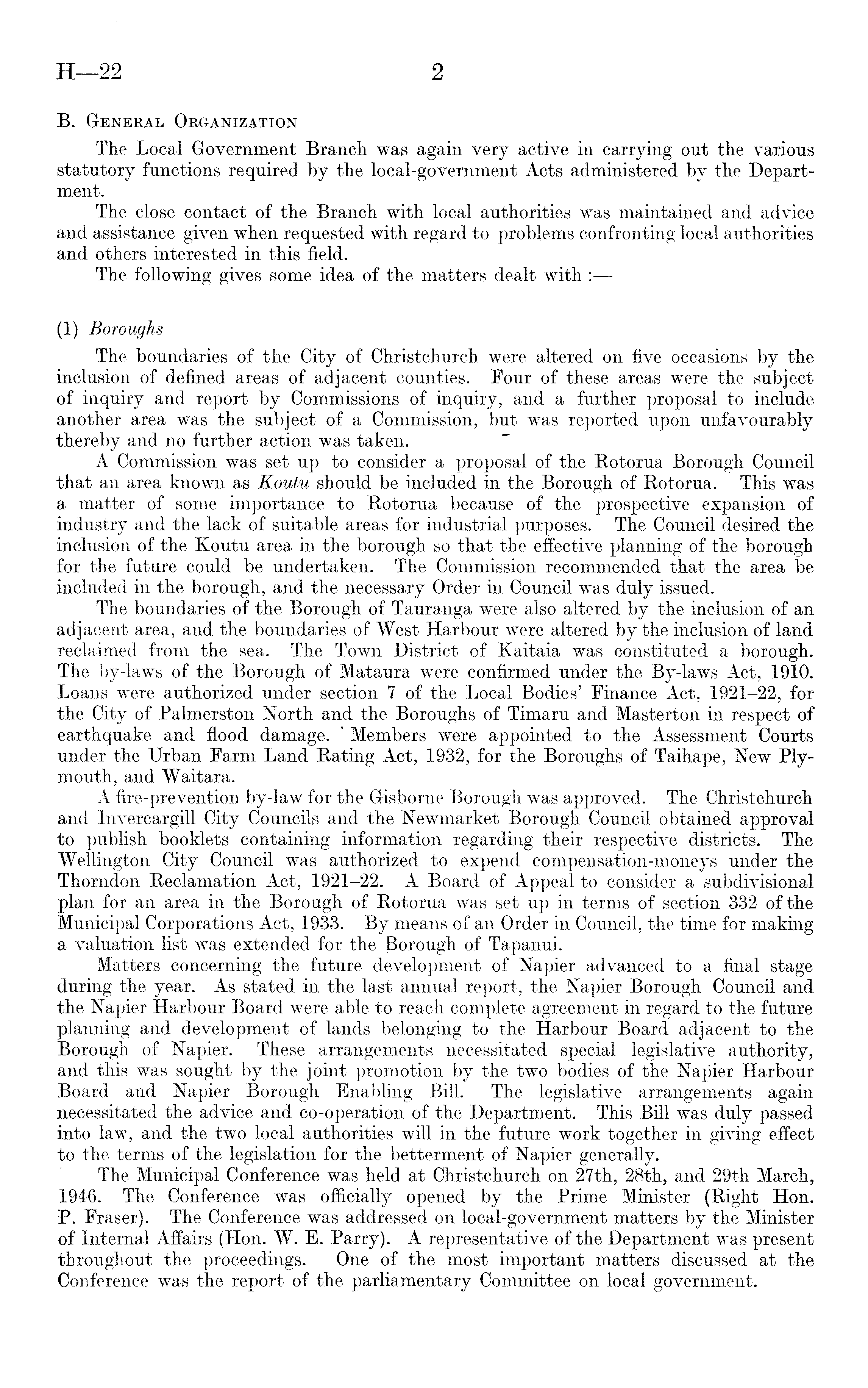 B. General Organization The Local Government Branch was again very active in carrying out the various statutory functions required by the local-government Acts administered by the Department. The close contact of the Branch with local authorities was maintained and advice and assistance given when requested with regard to problems confronting local authorities and others interested in this field. The following gives some idea of the matters dealt with : (1) Boroughs The boundaries of the City of Christchurch were altered on five occasions by the inclusion of defined areas of adjacent counties. Four of these areas were the subject of inquiry and report by Commissions of inquiry, and a further proposal to include another area was the subject of a Commission, but was reported upon unfavourably thereby and no further action was taken. A Commission was set up to consider a proposal of the Rotorua Borough Council that an area known as Koutu should be included in the Borough of Rotorua. This was a matter of some importance to Rotorua because of the prospective expansion of industry and the lack of suitable areas for industrial purposes. The Council desired the inclusion of the Koutu area in the borough so that the effective planning of the borough for the future could be undertaken. The Commission recommended that the area be included in the borough, and the necessary Order in Council was duly issued. The boundaries of the Borough of Tauranga were also altered by the inclusion of an adjacent area, and the boundaries of West Harbour were altered by the inclusion of land reclaimed from the sea. The Town District of Kaitaia was constituted a borough. The by-laws of the Borough of Mataura were confirmed under the By-laws Act, 1910. Loans were authorized under section 7 of the Local Bodies' Finance Act, 1921-22, for the City of Palmerston North and the Boroughs of Timaru and Masterton in respect of earthquake and flood damage. ' Members were appointed to the Assessment Courts under the Urban Farm Land Rating Act, 1932, for the Boroughs of Taihape, New Plymouth, and Waitara. A fire-prevention by-law for the Gisborne Borough was approved. The Christchurch and Invercargill City Councils and the Newmarket Borough Council obtained approval to publish booklets containing information regarding their respective districts. The Wellington City Council was authorized to expend compensation-moneys under the Thorndon Reclamation Act, 1921-22. A Board of Appeal to consider a subdivisional plan for an area in the Borough of Rotorua was set up in terms of section 332 of the Municipal Corporations Act, 1933. By means of an Order in Council, the time for making a valuation list was extended for the Borough of Tapanui. Matters concerning the future development of Napier advanced to a final stage during the year. As stated in the last annual report, the Napier Borough Council and the Napier Harbour Board were able to reach complete agreement in regard to the future planning and development of lands belonging to the Harbour Board adjacent to the Borough of Napier. These arrangements necessitated special legislative authority, and this was sought by the joint promotion by the two bodies of the Napier Harbour Board and Napier Borough Enabling Bill. The legislative arrangements again necessitated the advice and co-operation of the Department. This Bill was duly passed into law, and the two local authorities will in the future work together in giving effect to the terms of the legislation for the betterment of Napier generally. The Municipal Conference was held at Christchurch on 27th, 28th, and 29th March, 1946. The Conference was officially opened by the Prime Minister (Right Hon. P. Fraser). The Conference was addressed on local-government matters by the Minister of Internal Affairs (Hon. W. E. Parry). A representative of the Department was present throughout the proceedings. One of the most important matters discussed at the Conference was the report of the parliamentary Committee on local government.