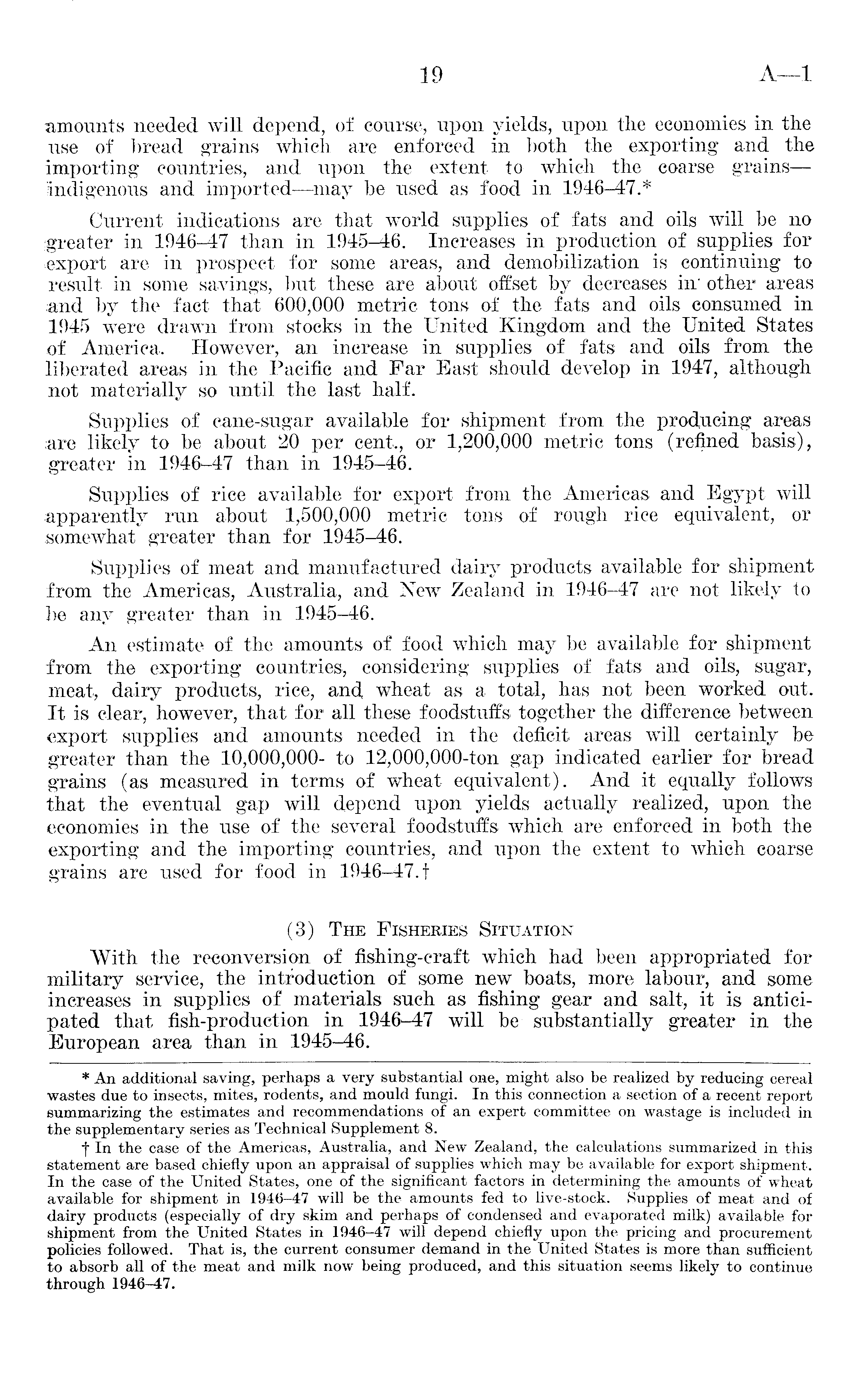 amounts needed will depend, of course, upon yields, upon the economies in the use of bread grains which are enforced in both the exporting and the importing countries, and upon the extent to which the coarse grains—indigenous and imported—may be used as food in 1946-47.* Current indications are that world supplies of fats and oils will be no greater in 1946-47 than in lncreases in production of supplies for .export are in prospect for some areas, and demobilization is continuing to result in some savings, but these are about offset by decreases in' other areas and by the fact that 600,000 metric tons of the fats and oils consumed in 1945 were drawn from stocks in the United Kingdom and the United States of America. However, an increase in supplies of fats and oils from the liberated areas in the Pacific and Far East should develop in 1947, although not materially so until the last half. Supplies of cane-sugar available for shipment from the producing areas are likely to be about 20 per cent., or 1,200,000 metric tons (refined basis), greater in 1946-47 than in 1945-46. Supplies of rice available for export from the Americas and Egypt will apparently run about 1,500,000 metric tons of rough rice equivalent, or somewhat greater than for 1945^6. Supplies of meat and manufactured dairy products available for shipment from the Americas, Australia, and New Zealand in 1946-47 are not likely to be any greater than in 1945-46. An estimate of the amounts of food which may be available for shipment from the exporting countries, considering supplies of fats and oils, sugar, meat, dairy products, rice, and, wheat as a total, has not been worked out. It is clear, however, that for all these foodstuffs together the difference between export supplies and amounts needed in the deficit areas will certainly be greater than the 10,000,000- to 12,000,000-ton gap indicated earlier for bread grains (as measured in terms of wheat equivalent). And it equally follows that the eventual gap will depend upon yields actually realized, upon the economies in the use of the several foodstuffs which are enforced in both the exporting and the importing countries, and upon the extent to which coarse grains are used for food in 1946-47. t (3) The Fisheries Situation With the reconversion of fishing-craft which had been appropriated for military service, the introduction of some new boats, more labour, and some increases in supplies of materials such as fishing gear and salt, it is anticipated that fish-production in 1946-47 will be substantially greater in the European area than in 1945-46.