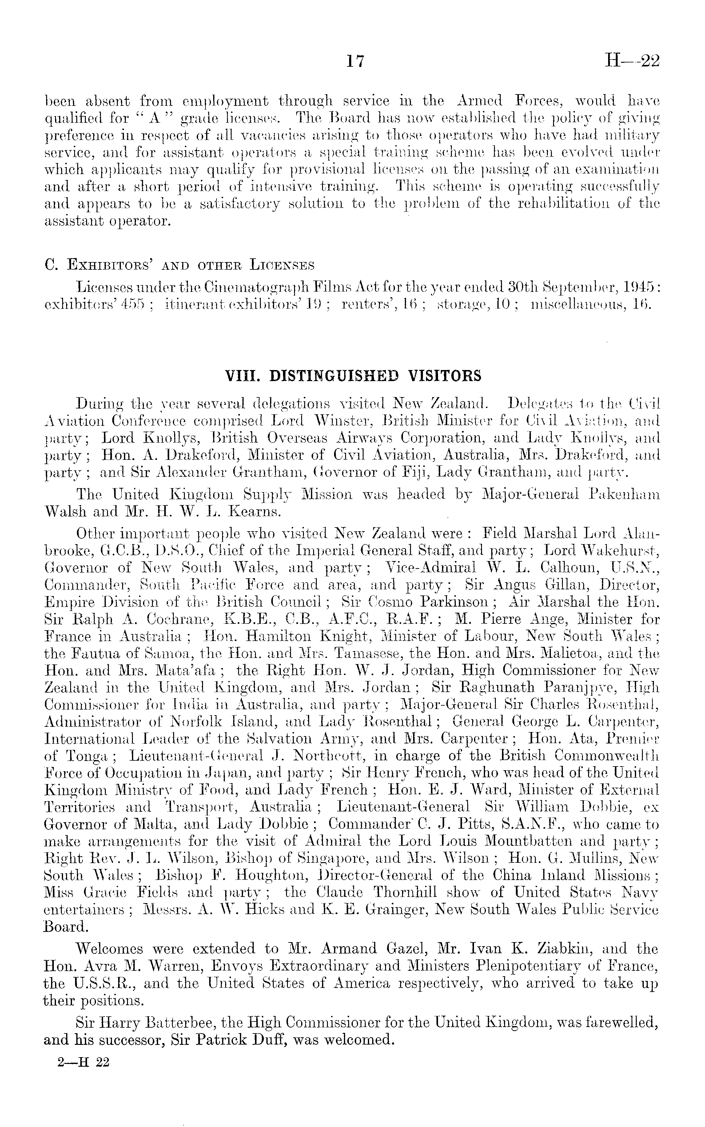 been absent from employment through, service in the Armed Forces, would have qualified for "A " grade licenses. The Board has now established the policy of giving preference in respect of all vacancies arising to those operators who have had military service, and for assistant operators a special training scheme has been evolved under which applicants may qualify for provisional licenses on the passing of an examination and after a short period of intensive training. This scheme is operating successfully and appears to be a satisfactory solution to the problem of the rehabilitation of the assistant operator. C. Exhibitors'• and other Licenses Licenses under the Cinematograph Films Act for the year ended 30th September, 1945: exhibitors'4ss ; itinerant exhibitors' 19 ; renters', 16 ; storage, 10 ; miscellaneous, 16. VIII. DISTINGUISHED VISITORS During the year several delegations visited New Zealand. Delegates to the Civil Aviation Conference comprised Lord Winster, British Minister for Civil Aviation, and party; Lord Knollys, British Overseas Airways Corporation, and Lady Knollys, and party; Hon. A. Drakeford, Minister of Civil Aviation, Australia, Mrs. Drakeford, and party ; and Sir Alexander Grantham, Governor of Fiji, Lady Grantham, and party. The United Kingdom Supply "Mission was headed by Major-General Pakenham Walsh and Mr. H. W. L. Kearns. Other important people who visited New Zealand were : Field Marshal Lord Alanbrooke, G.C.8., D.5.0., Chief of the Imperial General Staff, and party; Lord Wakehurst, Governor of New South Wales, and party; Vice-Admiral W. L. Calhoun, U.S.N., Commander, South Pacific Force and area, and party; Sir Angus Gillan, Director, Empire Division of the British Council; Sir Cosmo Parkinson; Air Marshal the Hon. Sir Ralph A. Cochrane, K.8.E., C.8., A.F.C., R.A.F.; M. Pierre Ange, Minister for France in Australia ; Hon. Hamilton Knight, Minister of Labour, New South Wales; the Fautua of Samoa, the Hon. and Mrs. Tamasese, the Hon. and Mrs. Malietoa, and the Hon. and Mrs. Mata'afa ; the Right Hon. W. J. Jordan, High Commissioner for New Zealand in the United Kingdom, and Mrs. Jordan ; Sir Raghunath Paranjpye, High Commissioner for India in Australia, and party; Major-General Sir Charles Rosenthal, Administrator of Norfolk Island, and Lady Rosenthal; General George L. Carpenter, International Leader of the Salvation Army, and Mrs. Carpenter ; Hon. Ata, Premier of Tonga ; Lieutenant-General J. Northcott, in charge of the British Commonwealth Force of Occupation in Japan, and party ; Sir Henry French, who was head of the United Kingdom Ministry of Food, and Lady French ; Hon. E. J. Ward, Minister of External Territories and Transport, Australia; Lieutenant-General Sir William Dobbie, ex Governor of Malta, and Lady Dobbie; Commander' C. J. Pitts, S.A.N.F., who came to make arrangements for the visit of Admiral the Lord Louis Mountbatten and party ; Right Rev. J. L. Wilson, Bishop of Singapore, and Mrs. Wilson ; Hon. G. Mullins, New South Wales ; Bishop F. Houghton, Director-General of the China Inland Missions ; Miss Gracie Fields and party ; the Claude Thornhill show of United States Navy entertainers ; Messrs. A. W. Hicks and K. E. Grainger, New South Wales Public Service Board. Welcomes were extended to Mr. Armand Gazel, Mr. Ivan K. Ziabkin, and the Hon. Avra M. Warren, Envoys Extraordinary and Ministers Plenipotentiary of France, the U.S.S.R., and the United States of America respectively, who arrived to take up their positions. Sir Harry Batterbee, the High Commissioner for the United Kingdom, was farewelled, and his successor, Sir Patrick Duff, was welcomed. 2—H 22
