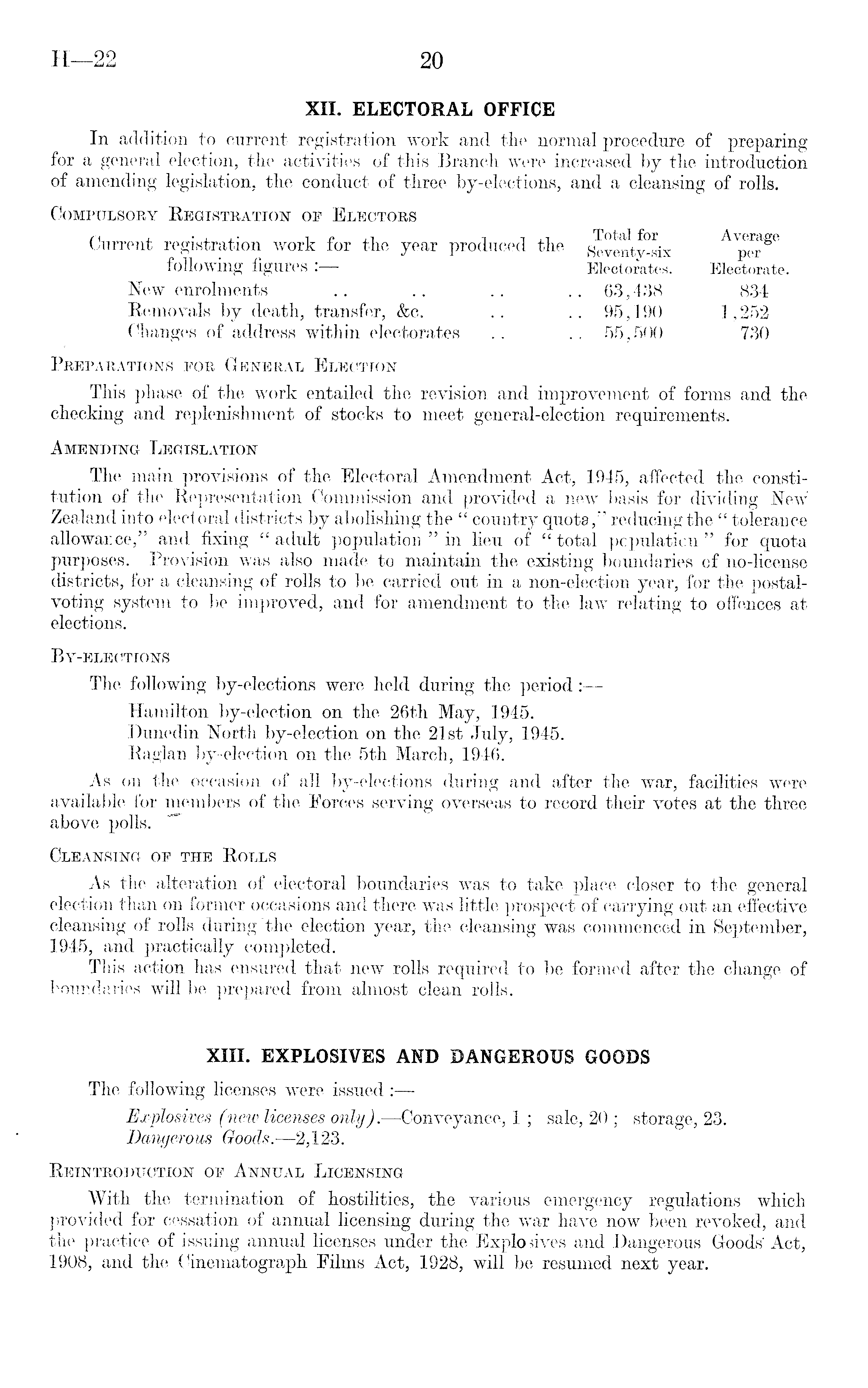 XII. ELECTORAL OFFICE In addition to current registration work and the normal procedure of preparing for a general election, the activities of this Branch were increased by the introduction of amending legislation, the conduct of three by-elections, and a cleansing of rolls. Compulsory Registration of Electors Current registration work for the year produced the Seventy°six A^per S6 following figures : Electorates. Electorate. New enrolments .. .. .. .. 63,438 834 Removals by death, transfer, &c. .. .. 95,190 1,252 Changes of address within electorates .. .. 55,500 730 Preparations for General Election This phase of the work entailed the revision and improvement of forms and the checking and replenishment of stocks to meet general-election requirements. Amending Legislation The main provisions of the Electoral Amendment Act, 1945, affected the constitution of the Representation Commission and provided a new basis for dividing New. Zealand into electoral districts by abolishing the " country quota," reducing the " tolerance allowarce," and fixing "adult population " in lieu of "total population" for quota purposes. Provision was also made to maintain the existing boundaries of no-license districts, for a cleansing of rolls to be carried out in a non-election year, for the postalvoting system to be improved, and for amendment to the law relating to offences at elections. By-elections The following by-elections were held during the period:— Hamilton by-election on the 26th May, 1945. Dunedin North by-election on the 21st July, 1945. Raglan by-election on the sth March, 1946. As on the occasion of all by-elections during and after the war, facilities were available for members of the Forces serving overseas to record their votes at the three above polls. Cleansing of the Rolls As the alteration of electoral boundaries was to take place closer to the general election than on former occasions and there was little prospect of carrying out an effective cleansing of rolls during the election year, the cleansing was commenced in September, 1945, and practically completed. This action has ensured that new rolls required to be formed after the change of boundaries will be prepared from almost clean rolls. XIII. EXPLOSIVES AND DANGEROUS GOODS The following licenses were issued : Explosives (new licenses only).—Conveyance, 1 ; sale, 20 ; storage, 23. Dangerous G00d5.—2,123. Reintroduction of Annual Licensing With the termination of hostilities, the various emergency regulations which provided for cessation of annual licensing during the war have now been revoked, and the practice of issuing annual licenses under the Explosives and Dangerous Goods' Act, 1908, and the Cinematograph Films Act, 1928, will be resumed next year.