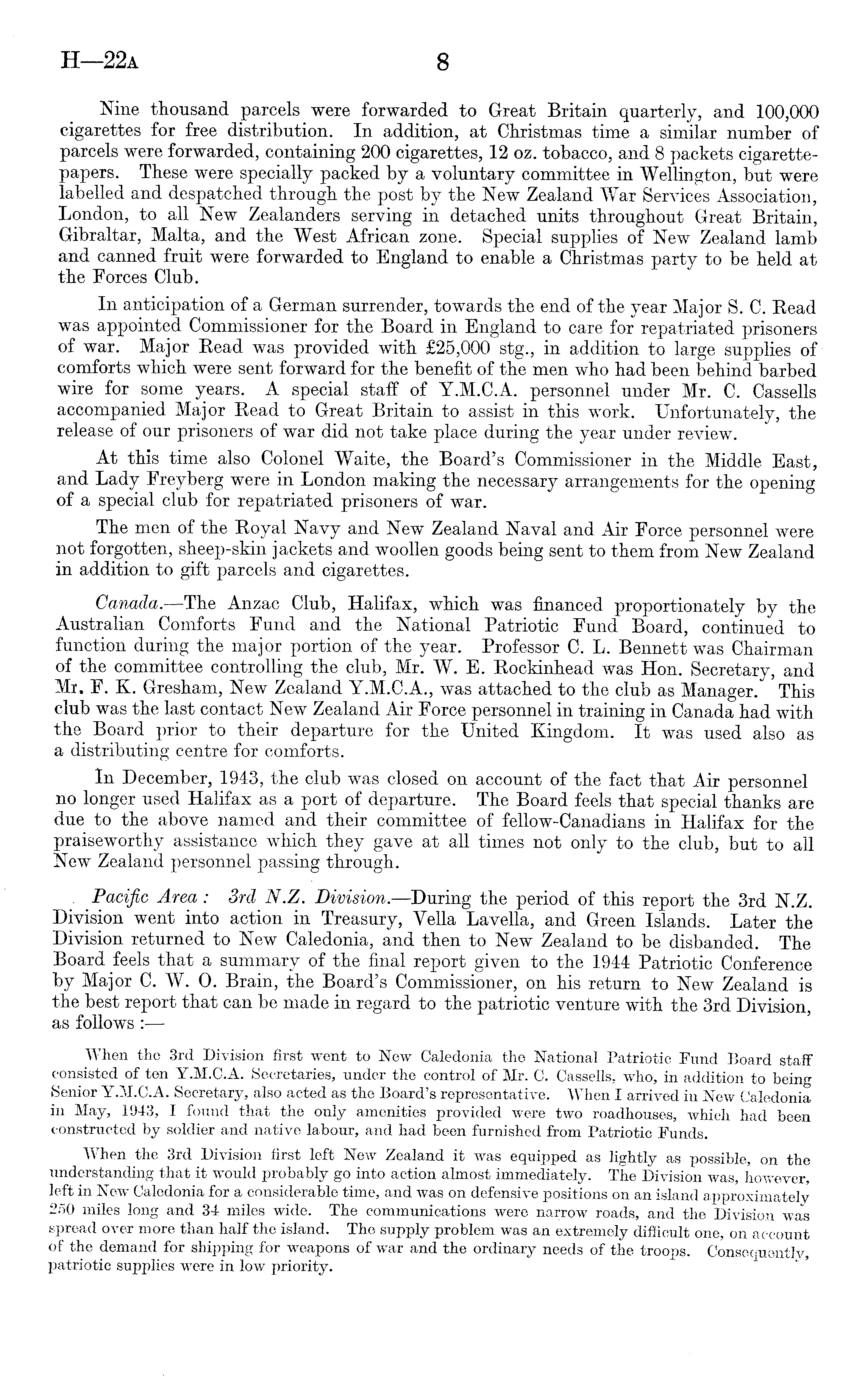 Nine thousand parcels were forwarded to Great Britain quarterly, and 100,000 cigarettes for free distribution. In addition, at Christmas time a similar number of parcels were forwarded, containing 200 cigarettes, 12 oz. tobacco, and 8 packets cigarettepapers. These were specially packed by a voluntary committee in Wellington, but were labelled and despatched through the post by the New Zealand War Services Association, London, to all New Zealanders serving in detached units throughout Great Britain, Gibraltar, Malta, and the West African zone. Special supplies of New Zealand lamb and canned fruit were forwarded to England to enable a Christmas party to be held at the Forces Club. In anticipation of a German surrender, towards the end of the year Major S. C. Head was appointed Commissioner for the Board in England to care for repatriated prisoners of war. Major Read was provided with £25,000 stg., in addition to large supplies of comforts which were sent forward for the benefit of the men who had been behind barbed wire for some years. A special staff of Y.M.C.A. personnel under Mr. C. Cassells accompanied Major Read to Great Britain to assist in this work. Unfortunately, the release of our prisoners of war did not take place during the year under review. At this time also Colonel Waite, the Board's Commissioner in the Middle East, and Lady Freyberg were in London making the necessary arrangements for the opening of a special club for repatriated prisoners of war. The men of the Royal Navy and New Zealand Naval and Air Force personnel were not forgotten, sheep-skin jackets and woollen goods being sent to them from New Zealand in addition to gift parcels and cigarettes. Canada.—The Anzac Club, Halifax, which was financed proportionately by the Australian Comforts Fund and the National Patriotic Fund Board, continued to function during the major portion of the year. Professor C. L. Bennett was Chairman of the committee controlling the club, Mr. W. E. Rockinhead was Hon. Secretary, and Mi. F. K. Gresham, New Zealand Y.M.C.A., was attached to the club as Manager. This club was the last contact New Zealand Air Force personnel in training in Canada had with the Board prior to their departure for the United Kingdom. It was used also as a distributing centre for comforts. In December, 1943, the club was closed on account of the fact that Air personnel no longer used Halifax as a port of departure. The Board feels that special thanks are due to the above named and their committee of fellow-Canadians in Halifax for the praiseworthy assistance which they gave at all times not only to the club, but to all New Zealand personnel passing through. Pacific Area: 3rd N.Z. Division.—During the period of this report the 3rd N.Z. Division went into action in Treasury, Vella Lavella, and Green Islands. Later the Division returned to New Caledonia, and then to New Zealand to be disbanded. The Board feels that a summary of the final report given to the 1944 Patriotic Conference by Major C. W. O. Brain, the Board's Commissioner, on his return to New Zealand is the best report that can be made in regard to the patriotic venture with the 3rd Division, as follows : When the 3rd Division first went to New Caledonia the National Patriotic Fund Board staff consisted of ten Y.M.C.A. Secretaries, under the control of Mr. C. Cassells, who, in addition to being Senior Y.M.C.A. Secretary, also acted as the Board's representative. When I arrived in New Caledonia in May, 1943, I found that the only amenities provided were two roadhouses, which had been constructed by soldier and native labour, and had been furnished from Patriotic Funds. When the 3rd Division first left New Zealand it was equipped as lightly as possible, on the understanding that it would probably go into action almost immediately. The Division was, however, left in New Caledonia for a considerable time, and was on defensive positions on an island approximately 250 miles long and 34 miles wide. The communications were narrow roads, and the Division was spread over more than half the island. The supply problem was an extremely difficult one, on account of the demand for shipping for weapons of war and the ordinary needs of the troops. Consequently, patriotic supplies were in low priority.