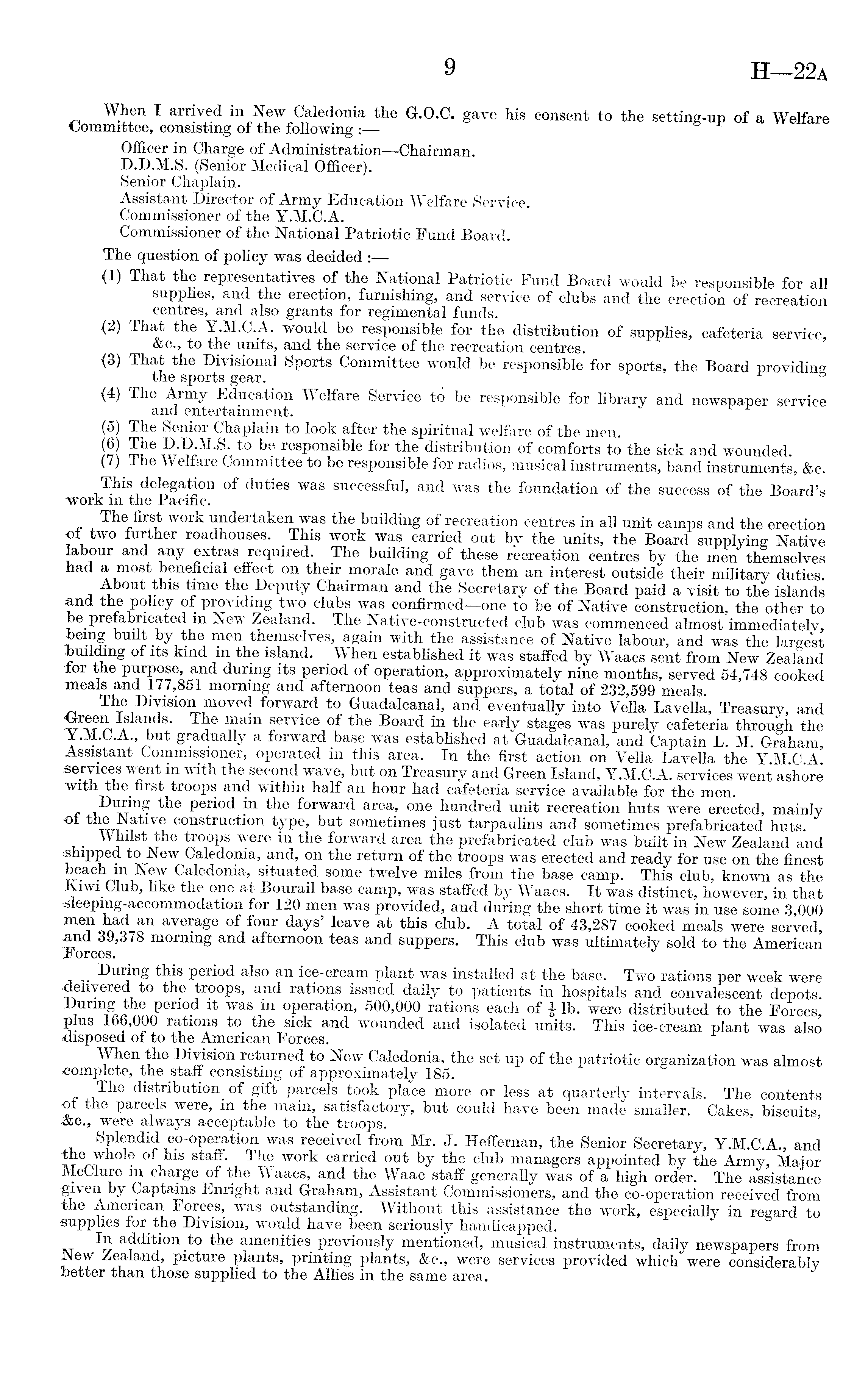 When I arrived in New Caledonia the G.O.C. gave his consent to the setting-up of a Welfare Committee, consisting of the following : Officer in Charge of Administration—Chairman. D.D.M.S. (Senior Medical Officer). Senior Chaplain. Assistant Director of Army Education Welfare Service. Commissioner of the Y.M.C.A. Commissioner of the National Patriotic Fund Board. The question of policy was decided : <1) That the representatives of the National Patriotic Fund Board would be responsible for all supplies, and the erection, furnishing, and service of clubs and the erection of recreation centres, and also grants for regimental funds. <2) That the Y.M.C.A. would be responsible for the distribution of supplies, cafeteria service, &c., to the units, and the service of the recreation centres. (3) That the Divisional Sports Committee would be responsible for sports, the Board providing the sports gear. s (4) The Army Education Welfare Service to be responsible for library and newspaper service and entertainment. (5) The Senior Chaplain to look after the spiritual welfare of the men. t0 be responsible for the distribution of comforts to the sick and wounded. (7) lhe Welfare Committee to be responsible for radios, musical instruments, band instruments, &c. This delegation of duties was successful, and was the foundation of the success of the Board's -work in the Pacific. The first work undertaken was the building of recreation centres in all unit camps and the erection of two further roadhouses. This work was carried out by the units, the Board supplying Native labour and any extras required. The building of these recreation centres by the men themselves had a most beneficial effect on their morale and gave them an interest outside their military duties About this time the Deputy Chairman and the Secretary of the Board paid a visit to the islands and the policy of providing two clubs was confirmed—one to be of Native construction, the other to be prefabricated in New Zealand. The Native-constructed club was commenced almost immediately, being built by the men themselves, again with the assistance of Native labour, and was the largest building of its kind in the island. When established it was staffed by Waacs sent from New Zealand for the purpose, and during its period of operation, approximately nine months, served 54,748 cooked meals and 177,851 morning and afternoon teas and suppers, a total of 232,599 meals The Division moved forward to Guadalcanal, and eventually into Vella Lavella, Treasury, and A ? , mam service of the Board in the early stages was purely cafeteria through the Y.M.C.A., but gradually a forward base was established at Guadalcanal, and Captain L. M. Graham, Assistant Commissioner, operated in this area. In the first action on Yella Lavella the YM C A services went m with the second wave, but on Treasury and Green Island, Y.M.C.A. services went ashore with the first troops and within half an hour had cafeteria service available for the men. P er i°d in the forward area, one hundred unit recreation huts were erected, mainly ■°* ® f tlve construc tion type, but sometimes just tarpaulins and sometimes prefabricated huts. Whilst the troops were in the forward area the prefabricated club was built in New Zealand and shipped to New Caledonia, and, on the return of the troops was erected and ready for use on the finest beach m New Caledonia, situated some twelve miles from the base camp. This club, known as the Kiwi Club, like the one at Bourail base camp, was staffed by Waacs. It was distinct, however, in that sleeping-accommodation for 120 men was provided, and during the short time it was in use some 3,000 men had an average of four days' leave at this club. A total of 43,287 cooked meals were served, and 39,378 morning and afternoon teas and suppers. This club was ultimately sold to the American Forces. During this period also an ice-cream plant was installed at the base. Two rations per week were •delivered to the troops, and rations issued daily to patients in hospitals and convalescent depots During the period it was in operation, 500,000 rations each of % lb. were distributed to the Forces, plus 166,000 rations to the sick and wounded and isolated units. This ice-cream plant was also disposed of to the American Forces. When the Division returned to New Caledonia, the set up of the patriotic organization was almost complete, the staff consisting of approximately 185. The distribution of gift parcels took place more or less at quarterly intervals. The contents ot the parcels were, in the main, satisfactory, but could have been made smaller. Cakes, biscuits, &c., were always acceptable to the troops. Splendid co-operation was received from Mr. J. Heffernan, the Senior Secretary, Y.M.C.A., and the whole of his staff. The work carried out by the club managers appointed by the Army, Maior McClure in charge of the Waacs, and the Waac staff generally was of a high order. The assistance b y Captains Enright and Graham, Assistant Commissioners, and the co-operation received from the American Forces, was outstanding. Without this assistance the work, especially in regard to supplies for the Division, would have been seriously handicapped. In addition to the amenities previously mentioned, musical instruments, daily newspapers from New Zealand, picture plants, printing plants, &c., were services provided which were considerably better than those supplied to the Allies in the same area.