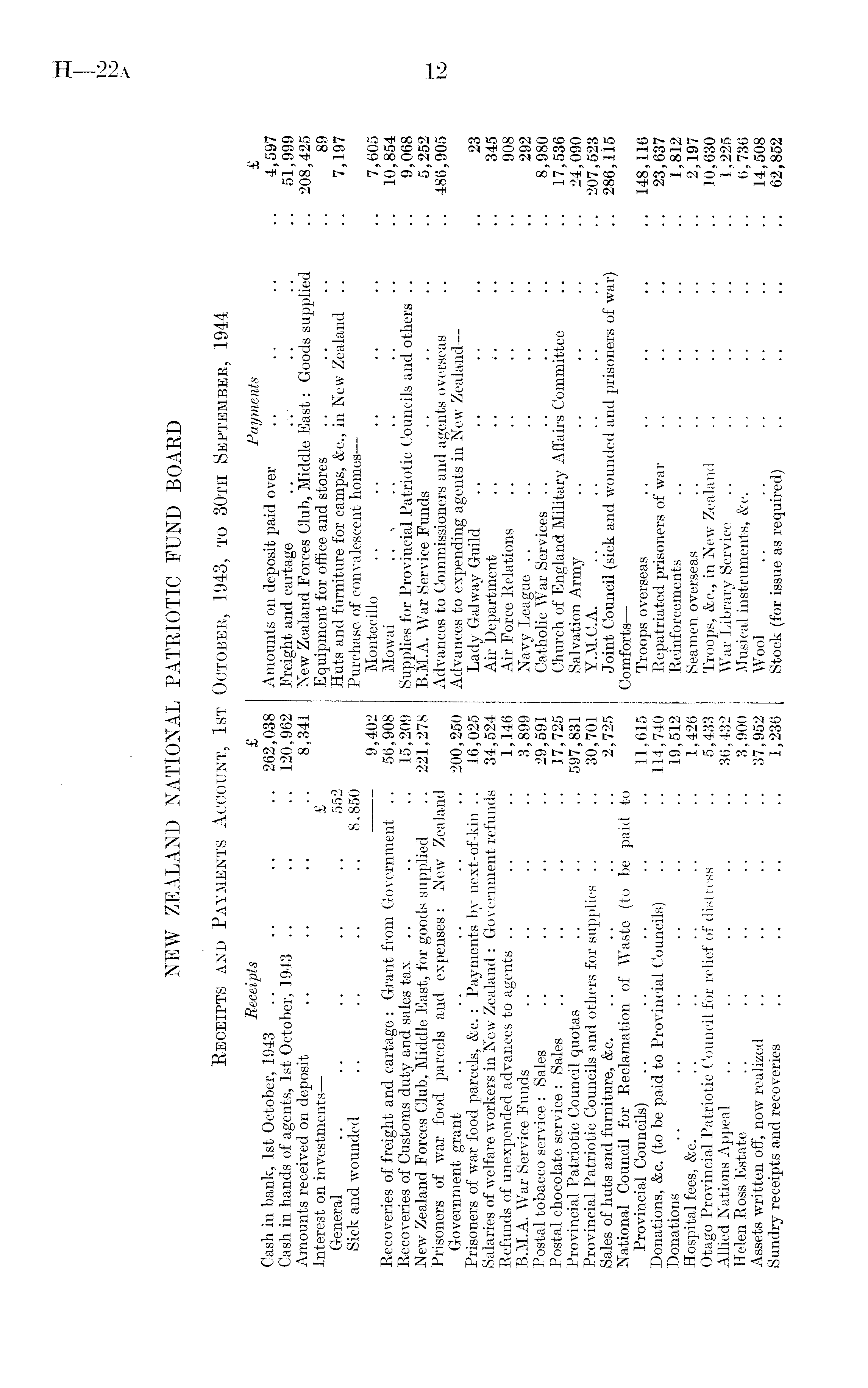 NEW ZEALAND NATIONAL PATRIOTIC FUND BOARD Receipts and Payments Account, Ist October, 1943, to 30th September, 1944 Receipts £ Payments £ Cash in bank, Ist October, 1943 .. .. .. .. 262,038 Amounts on deposit paid over .. .. .. .. 4,597 Cash in hands of agents, Ist October, 1943 .. .. .. 120,962 Freight and cartage .. . . .. .. .. 51,999 Amounts received on deposit .. .. .. .. 8,341 New Zealand Forces Club, Middle East: Goods supplied .. 208,425 Interest on investments— £ Equipment for office and stores .. .. .. .. 89 General .. .. .. .. .. 552 Huts and furniture for camps, &c., in New Zealand .. .. 7,197 Sick and wounded .. .. .. .. 8,850 Purchase of convalescent homes— 9,402 Montecillo .. .. .. .. .. .. 7,605 Recoveries of freight and cartage: Grant from Government .. 56,908 Mowai .. , .. .. .. .. .. 10,854 Recoveries of Customs duty and sales tax .. .. .. 15,209 Supplies for Provincial Patriotic Councils and others .. .. 9,068 New Zealand Forces Club, Middle East, for goods supplied .. 221,278 B.M. A. War Service Funds .. .. .. .. 5,252 Prisoners of war food parcels and expenses: New Zealand Advances to Commissioners and agents overseas .. .. 486,905 Government grant .. .. .. .. .. 200,250 Advances to expending agents in New Zealand— Prisoners of war food parcels, &c. : Payments by next-of-kin . . 16,025 Lady Galway Guild .. .. .. .. 23 Salaries of welfare workers in New Zealand : Government refunds 34,524 Air Department .. .. .. .. 345 Refunds of unexpended advances to agents .. .. .. 1,146 Air Force Relations .. .. .. .. .. 908 B.M. A. War Service Funds .. .. .. .. 3,899 Navy League .. .. .. .. .. .. 292 Postal tobacco service: Sales .. .. .. .. 29,591 Catholic War Services .. .. .. .. .. 8,980 Postal chocolate service: Sales .. .. .. .. 17,725 Church of England Military Affairs Committee .. .. 17,536 Provincial Patriotic Council quotas .. .. .. 597,831 Salvation Army .. .. .. .. .. 24,090 Provincial Patriotic Councils and others for supplies .. .. 30,701 Y.M.C.A. .. .. .. .. .. .. 207,523 Sales of huts and furniture, &c. .. .. .. .. 2,725 Joint Council (sick and wounded and prisoners of war) .. 286, lis National Council for Reclamation of Waste (to be paid to Comforts— Provincial Councils) .. .. .. .. .. 11,615 Troops overseas .. .. .. .. .. 148,116 Donations, &c. (to be paid to Provincial Councils) .. .. 114,740 Repatriated prisoners of war .. .. .. .. 23,637 Donations .. .. .. .. .. .. 19,512 Reinforcements .. .. .. .. .. 1,812 Hospital fees, &c. .. .. .. .. .. 1,426 Seamen overseas .. .. .. .. .. 2,197 Otago Provincial Patriotic Council for relief of distress .. 5,433 Troops, &c., in New Zealand .. .. .. .. 10,630 Allied Nations Appeal .. .. .. .. .. 36,432 War Library Service .. .. .. .. .. 1,225 Helen Ross Estate .. .. .. .. .. 3,900 Musical instruments, &c. .. .. .. .. 6,736 Assets written off, now realized .. .. .. .. 37,952 Wool .. .. . . .. .. .. 14,508 Sundry receipts and recoveries .. .. .. .. 1,236 Stock (for issue as required) .. .. .. .. 62,852