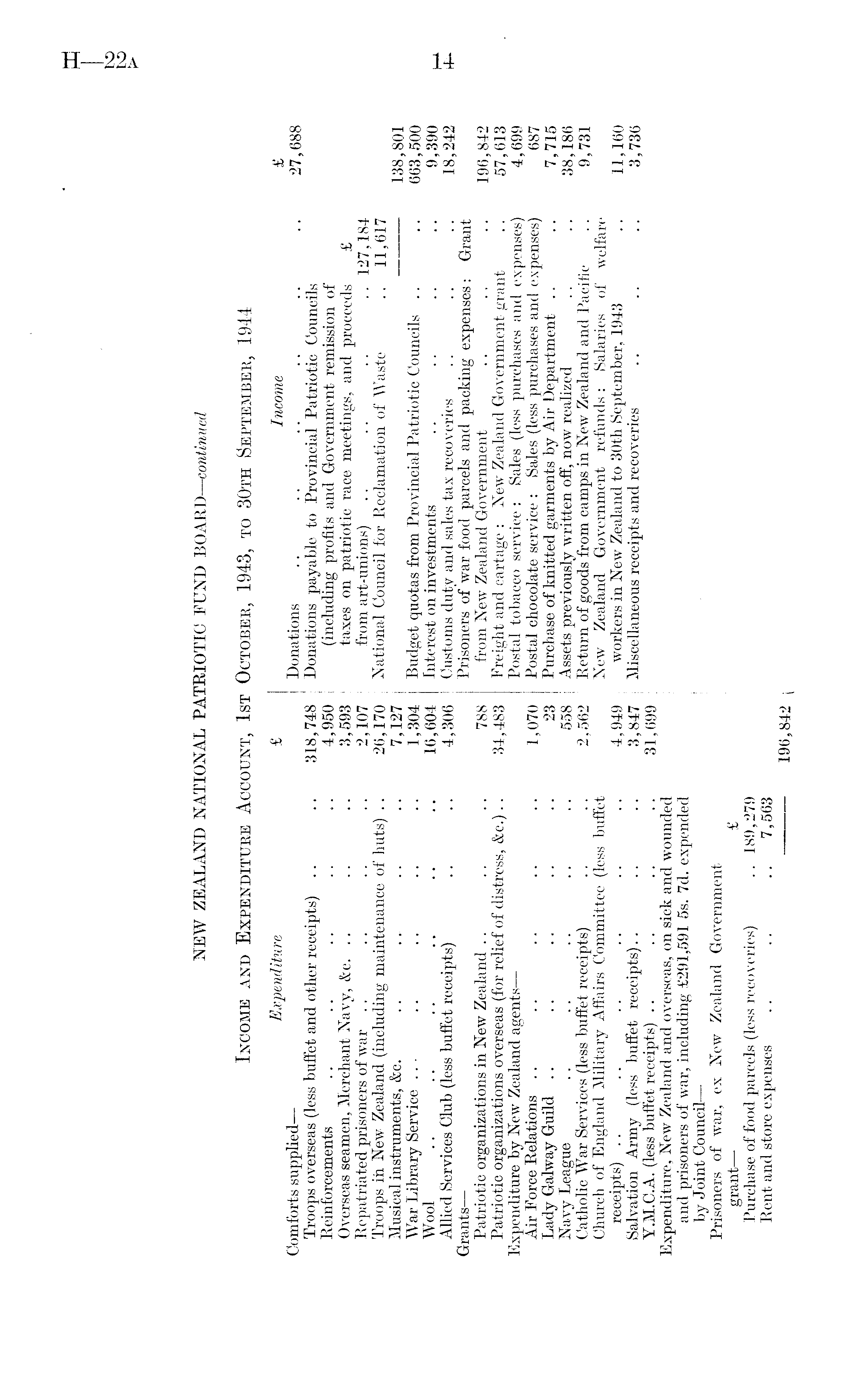 NEW ZEALAND NATIONAL PATRIOTIC FUND BOARD— continued Income and Expenditure Account, Ist October, 1943, to 30th September, 1944 Expenditure £ Income £ Comforts supplied— Donations .. .. .. .. .. .. 27,688 Troops overseas (less buffet and other receipts) .. .. 318,748 Donations payable to Provincial Patriotic Councils Reinforcements .. .. .. .. .. 4,950 (including profits and Government remission of Overseas seamen, Merchant Navy, &c. .. .. .. 3,593 taxes on patriotic race meetings, and proceeds £ Repatriated prisoners of war .. .. .. .. 2,107 from art-unions) .. .. .. .. 127,184 Troops in New Zealand (including maintenance of huts) .. 26,170 National Council for Reclamation of Waste .. 11,617 Musical instruments, &c. .. ... .. .. 7,127 138,801 War Library Service ... .. .. .. .. 1,304 Budget quotas from Provincial Patriotic Councils .. .. 663, 500 Wool .. .. .. .. .. .. 16,604 Interest on investments .. .. .. .. 9,390 Allied Services Club (less buffet receipts) .. .. 4,306 Customs duty and sales tax recoveries .. .. .. 18,242 Grants— Prisoners of war food parcels and packing expenses: Grant Patriotic organizations in New Zealand .. .. .. 788 from New Zealand Government .. .. .. 196,842 Patriotic organizations overseas (for relief of distress, &c.).. 34,483 Freight and cartage : New Zealand Government grant .. 57,613 Expenditure by New Zealand agents— Postal tobacco service: Sales (less purchases and expenses) 4,699 Air Force Relations .. .. .. .. .. 1,070 Postal chocolate service : Sales (less purchases and expenses) 687 Lady Galway Guild .. .. .. .. .. 23 Purchase of knitted garments by Air Department .. .. 7,715 Navy League .. .. .. .. .. 558 Assets previously written off, now realized .. .. 38,186 Catholic War Services (less buffet receipts) .. .. 2,562 Return of goods from camps in New Zealand and Pacific .. 9,731 Church of England Military Affairs Committee (less buffet New Zealand Government refunds: Salaries of welfare receipts) .. .. .. .. .. .. 4,949 workers in New Zealand to 30th September, 1943 .. 11,160 Salvation Army (less buffet receipts).. .. 3,847 Miscellaneous receipts and recoveries .. .. .. 3,736 Y.M.C.A. (less buffet receipts) .. .. .. .. 31,699 Expenditure, New Zealand and overseas, on sick and wounded and prisoners of war, including £291,591 ss. 7d. expended by Joint Council— Prisoners of war, ex New Zealand Government grant— £ Purchase of food parcels (less recoveries) .. 189,279 Rent and store expenses .. .. .. 7,563 196, .842 [
