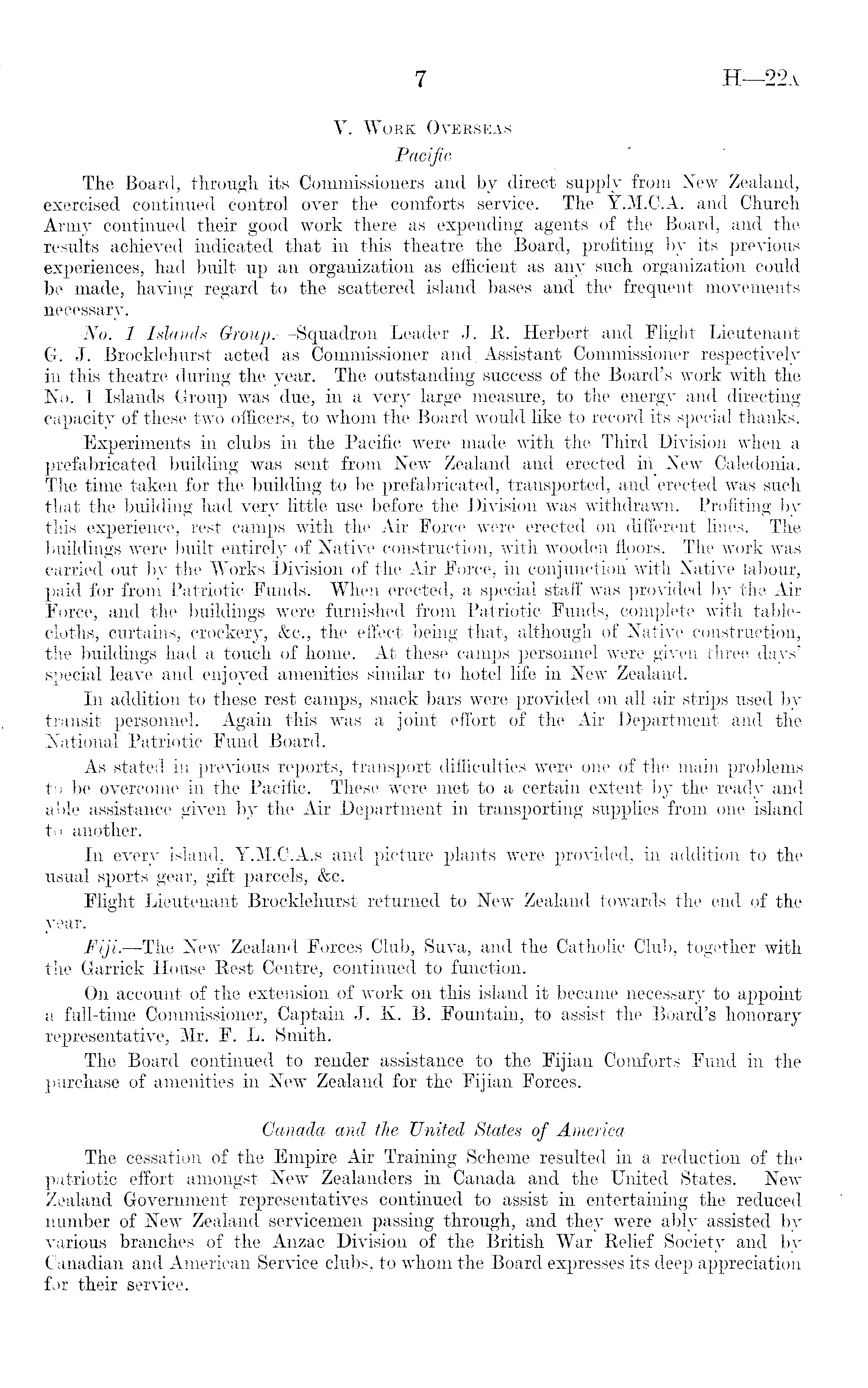 V. Work Overseas Pacific The Board, through, its Commissioners and by direct supply from New Zealand, exercised continued control over the comforts service. The Y.M.C.A. and Church Army continued their good work there as expending agents of the Board, and the results achieved indicated that in this theatre„ the Board, profiting by its previous experiences, had built up an organization as efficient as any-such organization could be made, having regard to the scattered island bases and the frequent movements necessary. No. 1 Islands Group. —Squadron Leader J. R. Herbert and Flight Lieutenant G. J. Brocklehurst acted as Commissioner and. Assistant Commissioner respectively in this theatre during the year. The outstanding success of the Board's work with the No. 1 Islands Group was due, in a very large measure, to the energy and directing capacity of these two officers, to whom the Board would like to record its special thanks. Experiments in clubs in the Pacific were made with the Third Division when a prefabricated building was sent from New Zealand and erected in New Caledonia. The time taken for the building to be prefabricated, transported, and erected was such that the building had very little use before the Division was withdrawn. Profiting by this experience, rest camps with the Air Force were erected on different lines. The buildings were built entirely of Native construction, with wooden floors. The work was carried out by the Works Division of the Air Force, in conjunction with Native labour, paid for from Patriotic Funds. When erected, a special staff was provided by the Air Force, and the buildings were furnished from Patriotic Funds, complete with tablecloths, curtains, crockery, &c., the effect being that, although of Native construction, the buildings had a touch of home. At these camps personnel were given three days' special leave and enjoyed amenities similar to hotel life in New Zealand. In addition to these rest camps, snack bars were provided on all air strips used by transit personnel. Again this was a joint effort of the Air Department and the National Patriotic Fund Board. As stated in previous reports, transport difficulties were one of the main problems to be overcome in the Pacific. These were met to a certain extent by the ready and able assistance given by the Air Department in transporting supplies from one island to another. In every island, Y.M.C.A.s and picture plants were provided, in addition to the usual sports gear, gift parcels, &c. Flight Lieutenant Brocklehurst returned to New Zealand towards the end of the year. Fiji.—The New Zealand Forces Club, Suva, and the Catholic Club, together with the Garrick House Rest Centre, continued to function. On account of the extension of work on this island it became necessary to appoint a full-time Commissioner, Captain J. K. B. Fountain, to assist the Board's honorary representative, Mr. F. L. Smith. The Board continued to render assistance to the Fijian Comforts Fund in the purchase of amenities in New Zealand for the Fijian Forces. Canada and the United States of America The cessation of the Empire Air Training Scheme resulted in a reduction of the patriotic effort amongst New Zealanders in Canada and the United States. New Zealand Government representatives continued to assist in entertaining the reduced number of New Zealand servicemen passing through, and they were ably assisted by various branches of the Anzac Division of the British War Relief Society and by Canadian and American Service clubs, to whom the Board expresses its deep appreciation for their service.