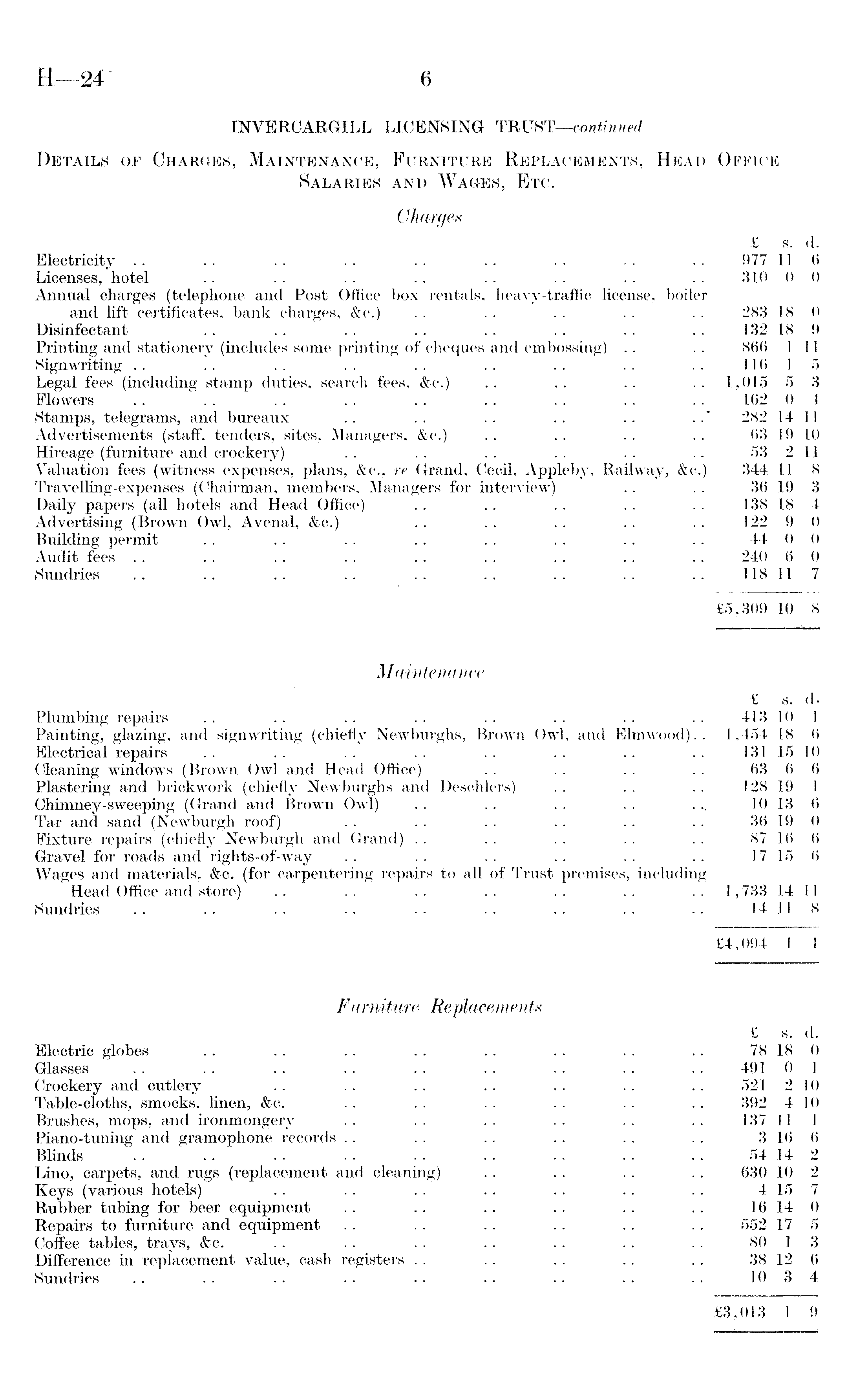 INVERCARGILL LICENSING TRUST—continued Details op Charges, Maintenance, Furniture Replacements, Head Office Salaries and Wages, Etc. Charges £ s. d. Electricity .. .. .. .. .. .. .. .. .. 977 11 6 Licenses, hotel . . . . . . . . .. . . . . . . 310 0 0 Annual charges (telephone and Post Office box rentals, heavy-traffic license, boiler and lift certificates, bank charges, &c.) .. .. .. .. .. 283 18 0 Disinfectant .. . . .. .. . . .. .. .. 132 18 9 Printing and stationery (includes some printing of cheques and embossing) .. . . 866 1 11 Signwriting .. .. .. .. .. .. .. .. .. 116 1 5 Legal fees (including stamp duties, search fees, &c.) .. .. .. .. 1,015 5 3 Flowers .. . . .. .. .. .. . . .. . . 162 0 4 Stamps, telegrams, and bureaux .. .. .. .. .. .282 14 11 Advertisements (staff, tenders, sites, Managers, &c.) .. .. .. .. 63 19 10 Hireage (furniture and crockery) .. . . .. . . .. .. 53 2 11 Valuation fees (witness expenses, plans, &c., re Grand, Cecil, Appleby, Railway, &c.) 344 11 8 Travelling-expenses (Chairman, members, Managers for interview) .. .. 36 19 3 Daily papers (all hotels and Head Office) .. .. .. .. .. 138 18 4 Advertising (Brown Owl, Avenal, &c.) .. .. . . .. .. 122 9 0 Building permit .. .. .. .. . . .. .. .. 44 0 0 Audit fees .. .. .. .. .. .. .. .. .. 240 6 0 Sundries .. .. .. . . .. .. . . . . .. 118 11 7 £5,309 10 8 Maintenance £ s. dPlumbing repairs .. .. .. .. .. .. .. .. 413 10 1 Painting, glazing, and signwriting (chiefly Newburghs, Brown Owl, and Elm wood).. 1,454 18 6 Electrical repairs .. .. . . . . .. .. .. .. 131 15 10 Cleaning windows (Brown Owl and Head Offiee) .. .. .. .. 63 6 6 Plastering and brickwork (chiefly Newburghs and Deschlers) .. .. .. 128 19 1 Chimney-sweeping (Grand and Brown Owl) ... .. . . .. .10 13 6 Tar and sand (Newburgh roof) . . .. .. . . .. .. 36 19 0 Fixture repairs (chiefly Newburgh and Grand) . . .. .. .. .. 87 16 6 Gravel for roads and rights-of-way .. . . . . . . . . . . 17 15 6 Wages and materials, &c. (for carpentering repairs to all of Trust premises, including Head Office and store) .. .. .. .. .. .. .. 1,733 14 11 Sundries .. .. .. .. .. .. .. .. .. 14 11 8 £4,094 1 1 Furniture Replacements £ s. d. Electric globes .. .. .. . . .. .. .. .. 78 18 0 Glasses .. .. .. .. .. . . . . .. .. 491 0 1 Crockery and cutlery .. . . . . . . .. .. .. 521 2 10 Table-cloths, smocks, linen, &c. .. .. .. .. .. .. 392 4 10 Brushes, mops, and ironmongery .. .. .. .. .. .. 13 7111 Piano-tuning and gramophone records .. .. .. .. .. .. 3166 Blinds .. .. .. .. .. .. . . .. . . 54 14 2 Lino, carpets, and rugs (replacement and cleaning) .. .. .. .. 630 10 2 Keys (various hotels) .. .. .. .. .. .. .. 4 15 7 Rubber tubing for beer equipment .. .. . . .. . . 16 14 0 Repairs to furniture and equipment . . . . .. .. .. .. 552 17 5 Coffee tables, trays, &c. .. .. .. .. . . .. . . 80 1 3 Difference in replacement value, cash registers .. .: .. .. .. 38 12 6 Sundries .. .. .. .. .. .. .. .. .. 10 3 4 £3,013 1 9