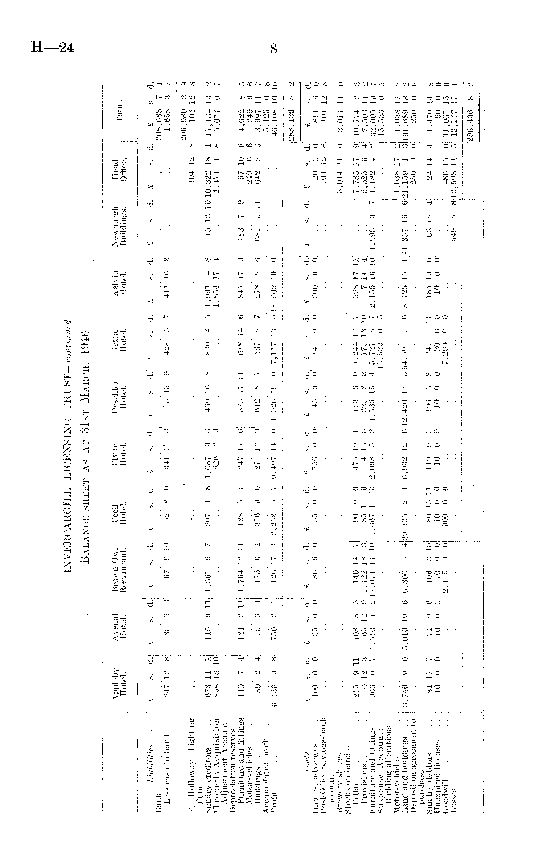 Appleby Avenal Brown Owl Cecil Clyde Deschler ! Grand Kelvin | Newburgh Head Tnfol Hotel. Hotel. Restaurant. Hotel. Hotel. Hotel. * Hotel. Hotel. | Buildings. Office. lotai. Liabilities £ s. d. £ s. d. £ s. d. £ s. d. £ s. d. £ s. d. | £ s. d. £ s. d. 1 £ s. d. £ s. d. £ s. d. Bank 208,638 7 4 Less cash in hand .. 247 "l2 8 33' 0 3 67' 9 10 52' 8 0 34i' 17 3 7513 9 428' 5 7 411 16 3 1,658 3 7 I 206,980 3 9 F. Holloway Lighting 104 12 8 104 12 8 Fund Sundry creditors 673 11 1 145 9 11 1,361 9 7 207 1 8 1,087 3 3 469 16 8 830 4 5 1,991 4 8 45 13 10 10,322 18 1 17,134 13 2 ♦Property Acquisition 858 18 10 826 2 9 1,854 17 4 1,474 1 8 5,014 0 7 Adjustment Account Depreciation reserves — Furniture and fittings 140 7 4 124 2 11 1,764 12 11 128 5 1 247 11 6 375 17 11 | 618 14 6 341 17 9 183 7 9 97 10 9 4,022 8 5 Motor-vehicles 249 6 6 249 6 6 Buildings 00 *9 ts 75 ' 0 4 175' 0 1 376' 9 6 270 12 9 642' 8 7 | 467' 0 7 278' 9 6 68i' 5 11 642 2 0 3,697 11 7 Accumulated profit 5,125 0 8 Profit 6,439' 9 8 750' 2 1 126 17 1 2,253' 5 7 9,497 14 0 1,020 19 0 7,117 13 5 18,902 10 0 46,108 10 10 288,436 8 2 Assets £ s. d. £ s. d. £ s. d. £ s. d. £ s. d. £ s. d. £ s. d. ! £ s. d. £ s. d. £ s. d. £ s. d. Imprest advances 100 0 0 35 0 0 86 6 0 35 0 0 150 0 0 45 0 0 140 0 0 200 0 0 20 0 0 811 6 0 Post Office Savings-bank 104 12 8 104 12 8 account Brewery shares 3,014 11 0 3,014 11 0 Stocks on hand — Cellar 215 9 11 108 8 5 140 14 7 90 9 0 475 19 1 113 6 0 1.244 19 7 598 17 11 7,785 17 9 10,774 2 3 Provisions 0 12 3 65 12 9 1,422 18 3 85 11 0 4 13 3 220 2 2 170 13 10 7 14 4 5,525 16 4 7,503 14 2 Furniture and fittings 966 0 7 1,510 1 2 11,071 14 10: 1,667 11 10 2,098 5 2 4,533 15 4 5,727 6 1 2,155 16 10 1,093" 3 7 1,182 4 2 32,. 005 19 7 Suspense Account: 15,533 0 5 15,533 0 5 Building alterations Motor-vehicles 1,038 17 2 1,038 17 2 Land and buildings .. 3,746' 9 0 5,010 19 6 6;306' 3 4 29,135' 2 1 6,93212 6 12,420 11 5 54,5oi 7' 6 8,125 15 1 44,357 16 6 21,159 1 3 191,689 18 2 Deposit on agreement to 250 0 0 250 0 0 purchase Sundry debtors 84 17 7 74 9 6 406 3 10 80 15 11 119 9 0 190 5 3 241 1 Hi 184 19 0 63 18 4 24 14 4 1,470 14 8 Unexpired licenses 10 0 0 10 0 0 10 0 0 10 0 0 10 0 0 10 0 0 20 0 0 10 0 0 90 0 0 Goodwill 2,415 0 0 900 0 0 7,200 0 0 486 15 0 11,001 15 0 Losses 549' 5 8 12,598 11 5 13,147 17 1 288,436 8 2