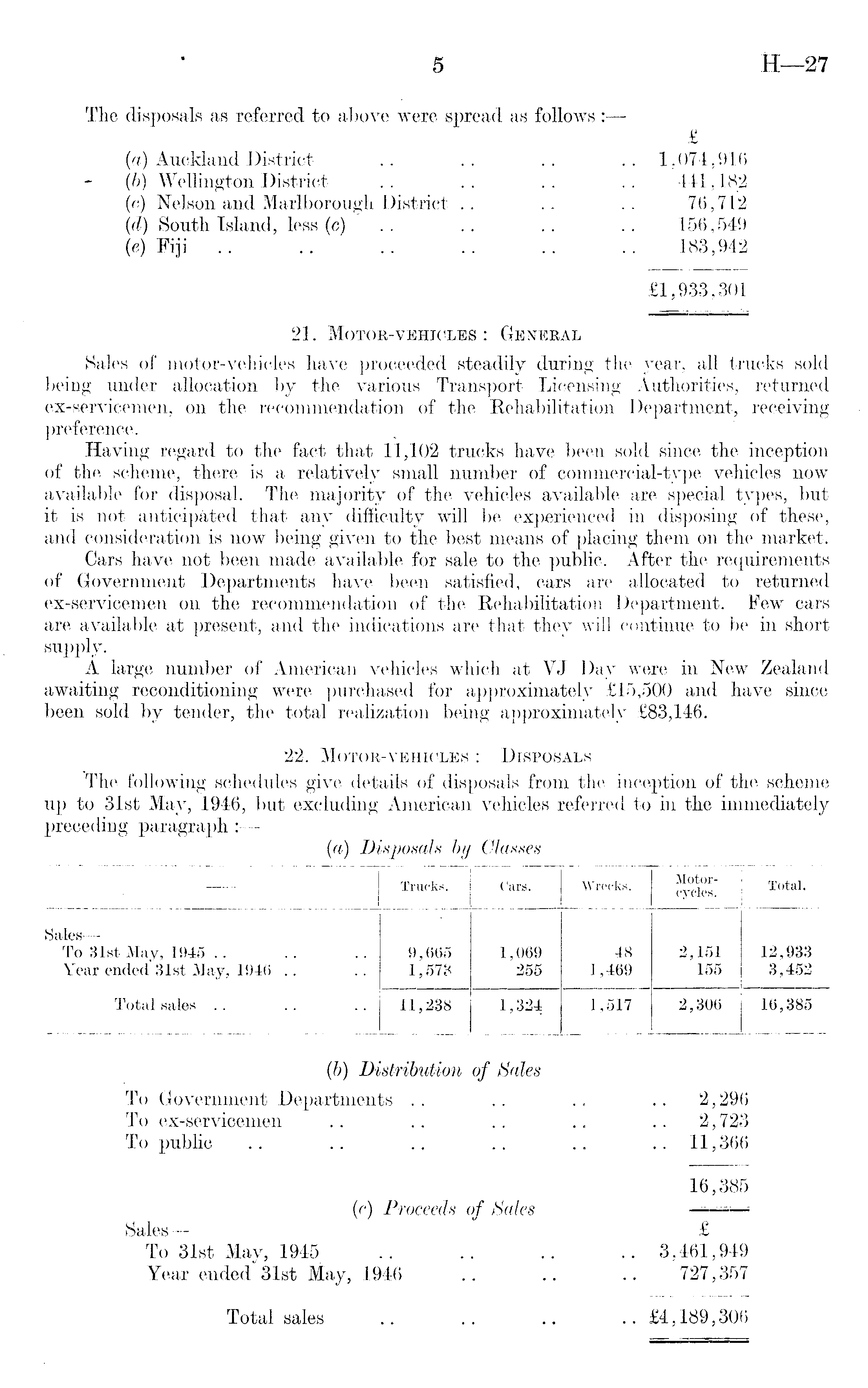 (b) Distribution of Sales To Government Departments . . .. .. .. 2,296 To ex-servicemen .. .. .. .. .. 2,723 To public .. .. .. .. .. .. 11,366 16,385 (c) Proceeds of Sales - Sales — £ To 31st May, 1945 .. .. .. .. 3,461,949 Year ended 31st May, 1946 .. .. .. 727,357 Total sales .. .. .. .. £4,189,306