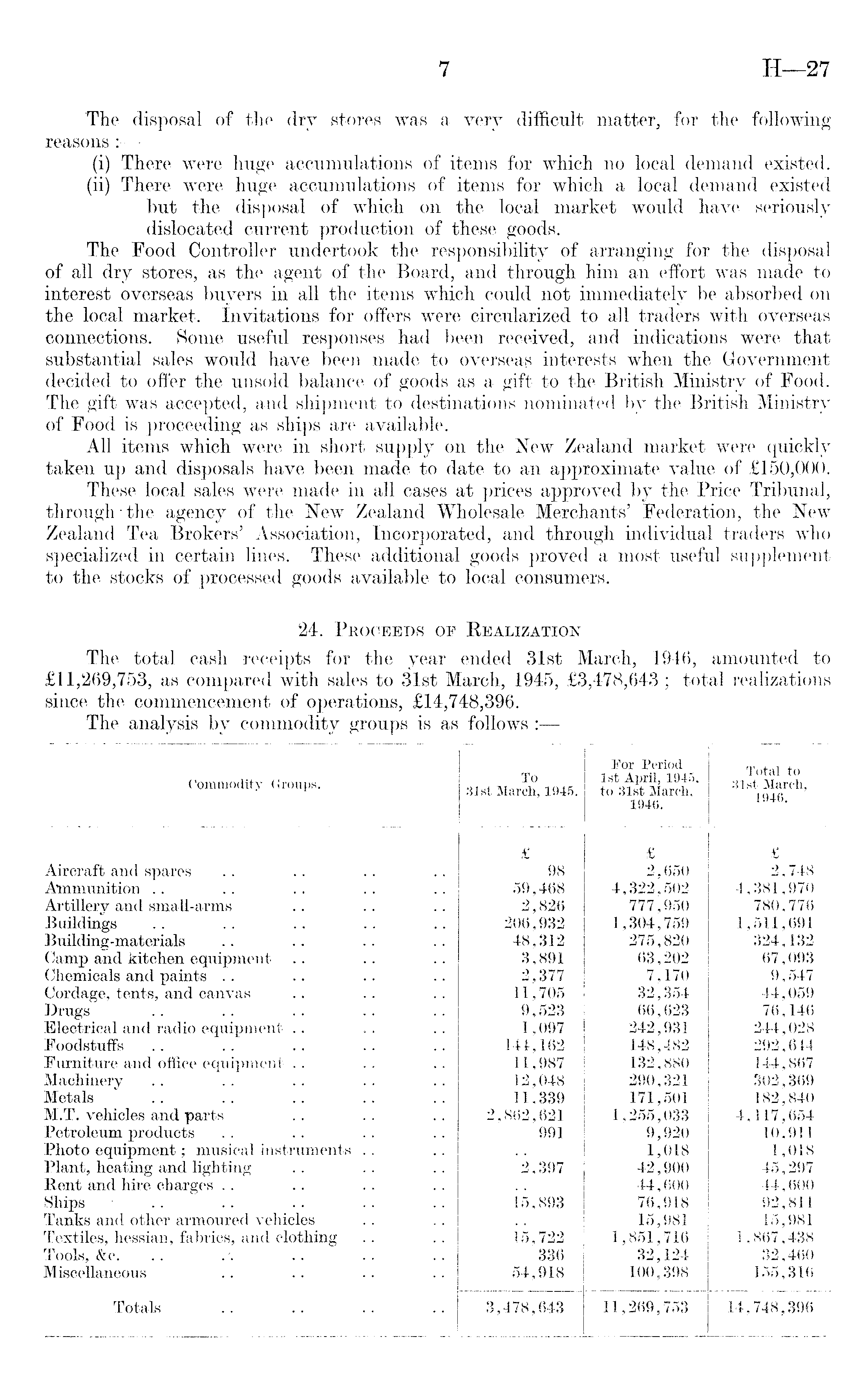 The disposal of the dry stores was a very difficult matter, for the following reasons : —- (i) There were huge accumulations of items for which no local demand existed. (ii) There were huge accumulations of items for which a local demand existed but the disposal of which on the local market would have seriously dislocated current production of these goods. The Food Controller undertook the responsibility of arranging for the disposal of all dry stores, as the agent of the Board, and through him an effort was made to interest overseas buyers in all the items which could not immediately be absorbed on the local market. Invitations for offers were circularized to all traders with overseas connections. Some useful responses had been received, and indications were that substantial sales would have been made to overseas interests when the Government decided to offer the unsold balance of goods as a gift to the British Ministry of Food. The gift was accepted, and shipment to destinations nominated by the British Ministry of Food is proceeding as ships are available. All items which were in short supply on the New Zealand market were quickly taken up and disposals have been made to date to an approximate value of £150,000. These local sales were made in all cases at prices approved by the Price Tribunal, through the agency of the New Zealand Wholesale Merchants' Federation, the New Zealand Tea Brokers' Association, Incorporated, and through individual traders who specialized in certain lines. These additional goods proved a most useful supplement to the stocks of processed goods available to local consumers. 24. Proceeds op Realization The total cash receipts for the year ended 31st March, 1946, amounted to £11,269,753, as compared with sales to 31st March, 1945, £3,478,643 ; total realizations since the commencement of operations, £14,748,396. The analysis by commodity groups is as follows :