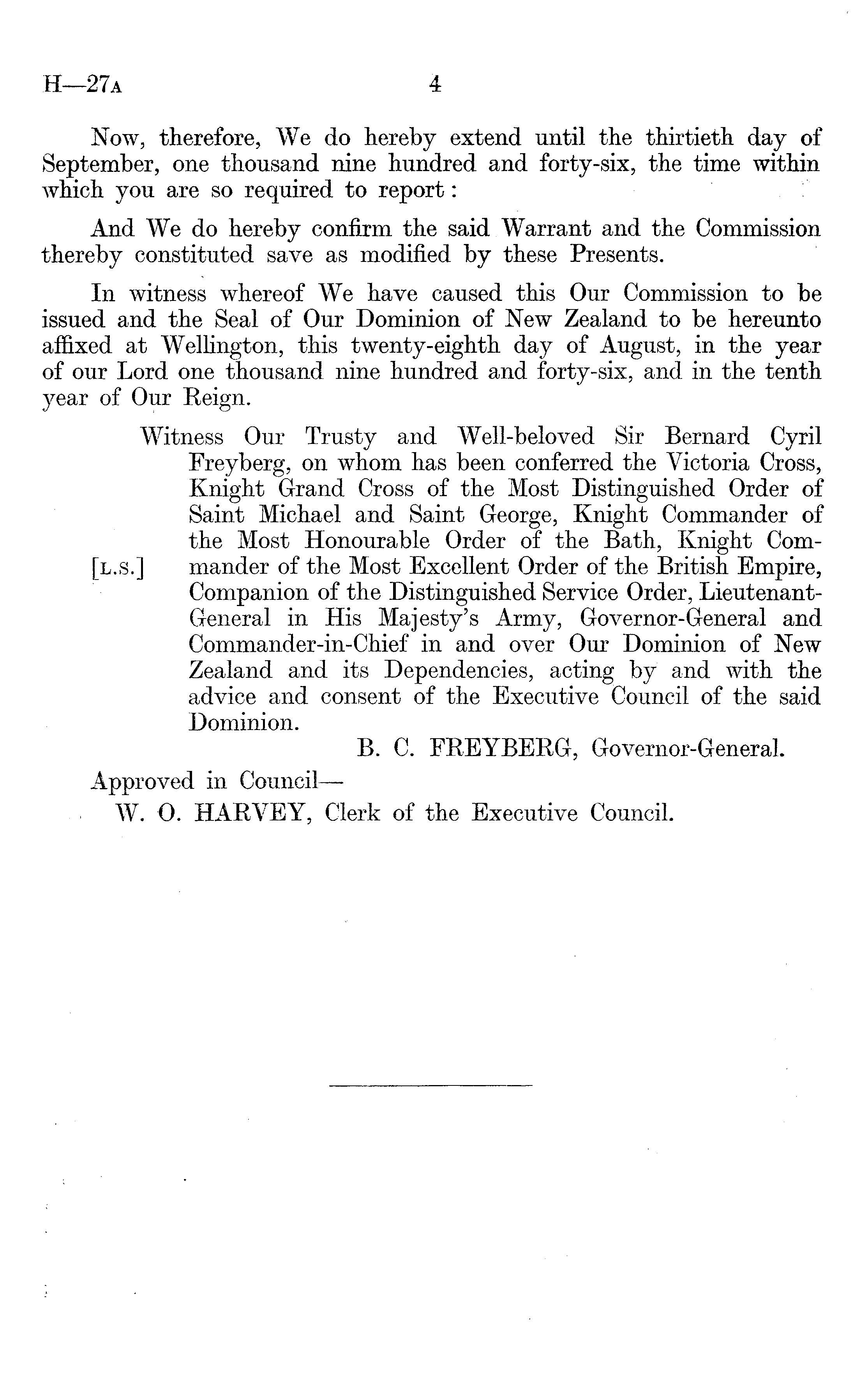 Now, therefore, We do hereby extend until the thirtieth day of September, one thousand nine hundred and forty-six, the time within which you are so required to report: And We do hereby confirm the said . Warrant and the Commission thereby constituted save as modified by these Presents. In witness whereof We have caused this Our Commission to be issued and the Seal of Our Dominion of New Zealand to be hereunto affixed at Wellington, this twenty-eighth day of August, in the year of our Lord one thousand nine hundred and forty-six, and in the tenth year of Our Reign. Witness Our Trusty and Well-beloved Sir Bernard Cyril Freyberg, on whom has been conferred the Victoria Cross, Knight Grand Cross of the Most Distinguished Order of Saint Michael and Saint George, Knight Commander of the Most Honourable Order of the Bath, Knight Com[l.s.] mander of the Most Excellent Order of the British Empire, Companion of the Distinguished Service Order, LieutenantGeneral in His Majesty's Army, Governor-General and Commander-in-Chief in and over Our Dominion of New Zealand and its Dependencies, acting by and with the advice and consent of the Executive Council of the said Dominion. B. C. FREYBERG, Governor-General. Approved in Council — W. O. HARVEY, Clerk of the Executive Council.