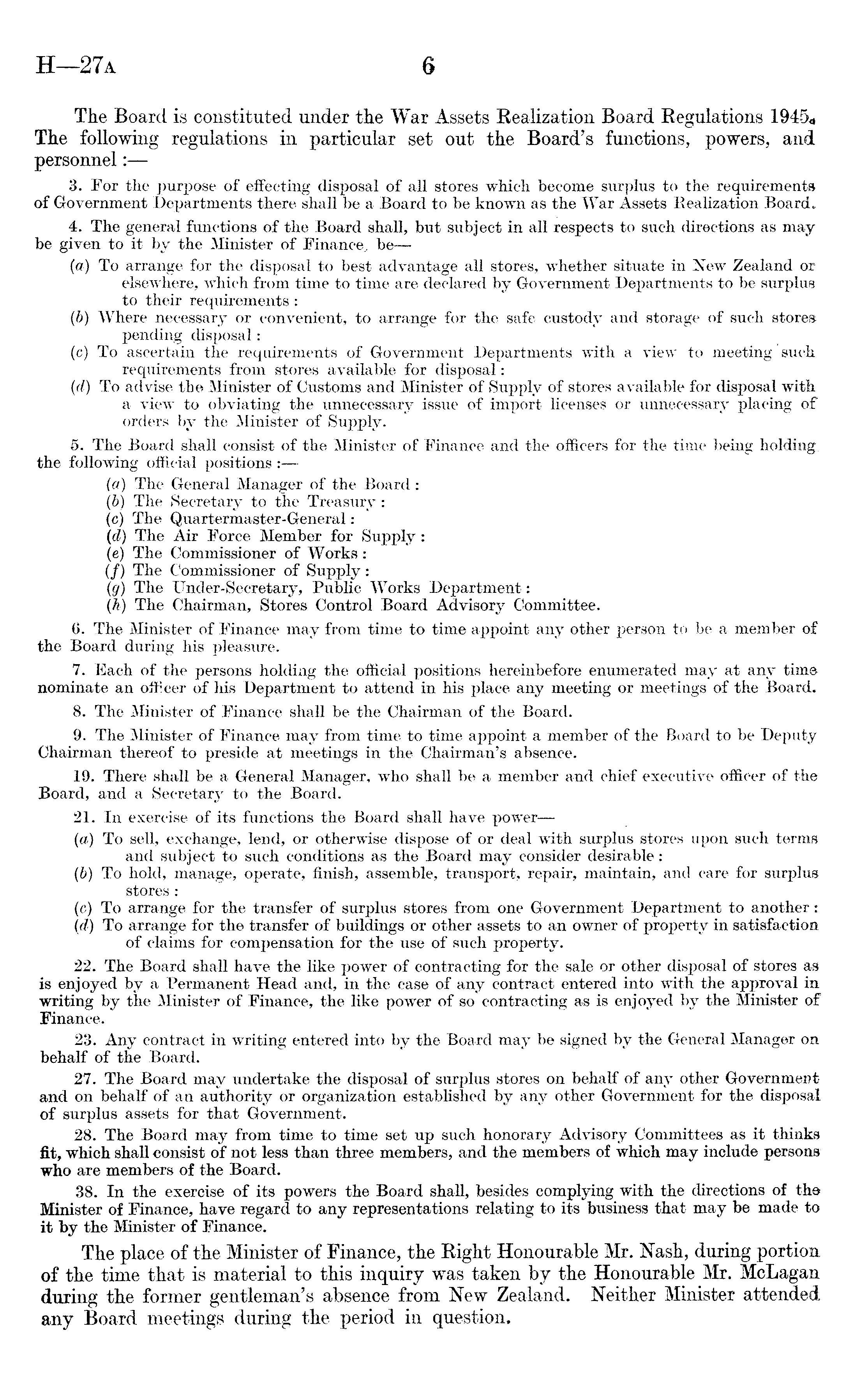 The Board is constituted under the War Assets Realization Board Regulations 1945« The following regulations in particular set out the Board's functions, powers, and personnel:— 3. For the purpose of effecting disposal of all stores which become surplus to the requirements of Government Departments there shall be a Board to be known as the War Assets Realization Board. 4. The general functions of the Board shall, but subject in all respects to such directions as maybe given to it by the Minister of Finance, be—{a) To arrange for the disposal to best advantage all stores, whether situate in New Zealand or elsewhere, which from time to time are declared by Government Departments to be surplus to their requirements : (b) Where necessary or convenient, to arrange for the safe custody and storage of such stores pending disposal: (c) To ascertain the requirements of Government Departments with a view to meeting such requirements from stores available for disposal: (d) To advise the Minister of Customs and Minister of Supply of stores available for disposal with a view to obviating the unnecessary issue of import licenses or unnecessary placing of orders by the Minister of Supply. 5. The Board shall consist of the Minister of Finance and the officers for the time being holding, the following official positions : (a) The General Manager of the Board: (b) The Secretary to the Treasury: (c) The Quartermaster-General: (d) The Air Force Member for Supply : (e) The Commissioner of Works : (/) The Commissioner of Supply : (g) The Under-Secretary, Public Works Department: (h) The Chairman, Stores Control Board Advisory Committee. 6. The Minister of Finance may from time to time appoint any other person to be a member of the Board during his pleasure. 7. Each of the persons holding the official positions hereinbefore enumerated may at any time nominate an officer of his Department to attend in his place any meeting or meetings of the Board. 8. The Minister of Finance shall be the Chairman of the Board. 9. The Minister of Finance may from time to time appoint a member of the Board to be Deputy Chairman thereof to preside at meetings in the Chairman's absence. 19. There shall be a General Manager, who shall be a member and chief executive officer of the Board, and a Secretary to the Board. 21. In exercise of its functions the Board shall have power — (а) To sell, exchange, lend, or otherwise dispose of or deal with surplus stores upon such terms and subject to such conditions as the Board may consider desirable: (б) To hold, manage, operate, finish, assemble, transport, repair, maintain, and care for surplus stores : (c) To arrange for the transfer of surplus stores from one Government Department to another: (d) To arrange for the transfer of buildings or other assets to an owner of property in satisfaction of claims for compensation for the use of such property. 22. The Board shall have the like power of contracting for the sale or other disposal of stores as is enjoyed by a Permanent Head and, in the case of any contract entered into with the approval in writing by the Minister of Finance, the like power of so contracting as is enjoyed by the Minister of Finance. 23. Any contract in writing entered into by the Board may be signed by the General Manager on behalf of the Board. 27. The Board may undertake the disposal of surplus stores on behalf of any other Government and on behalf of an authority or organization established by any other Government for the disposal of surplus assets for that Government. 28. The Board may from time to time set up such honorary Advisory Committees as it thinks fit, which shall consist of not less than three members, and the members of which may include persons who are members of the Board. 38. In the exercise of its powers the Board shall, besides complying with the directions of the Minister of Finance, have regard to any representations relating to its business that may be made to it by the Minister of Finance. The place of the Minister of Finance, the Right Honourable Mr. Nash, during portion of the time that is material to this inquiry was taken by the Honourable Mr. McLagan during the former gentleman's absence from New Zealand. Neither Minister attended any Board meetings during the period in question.