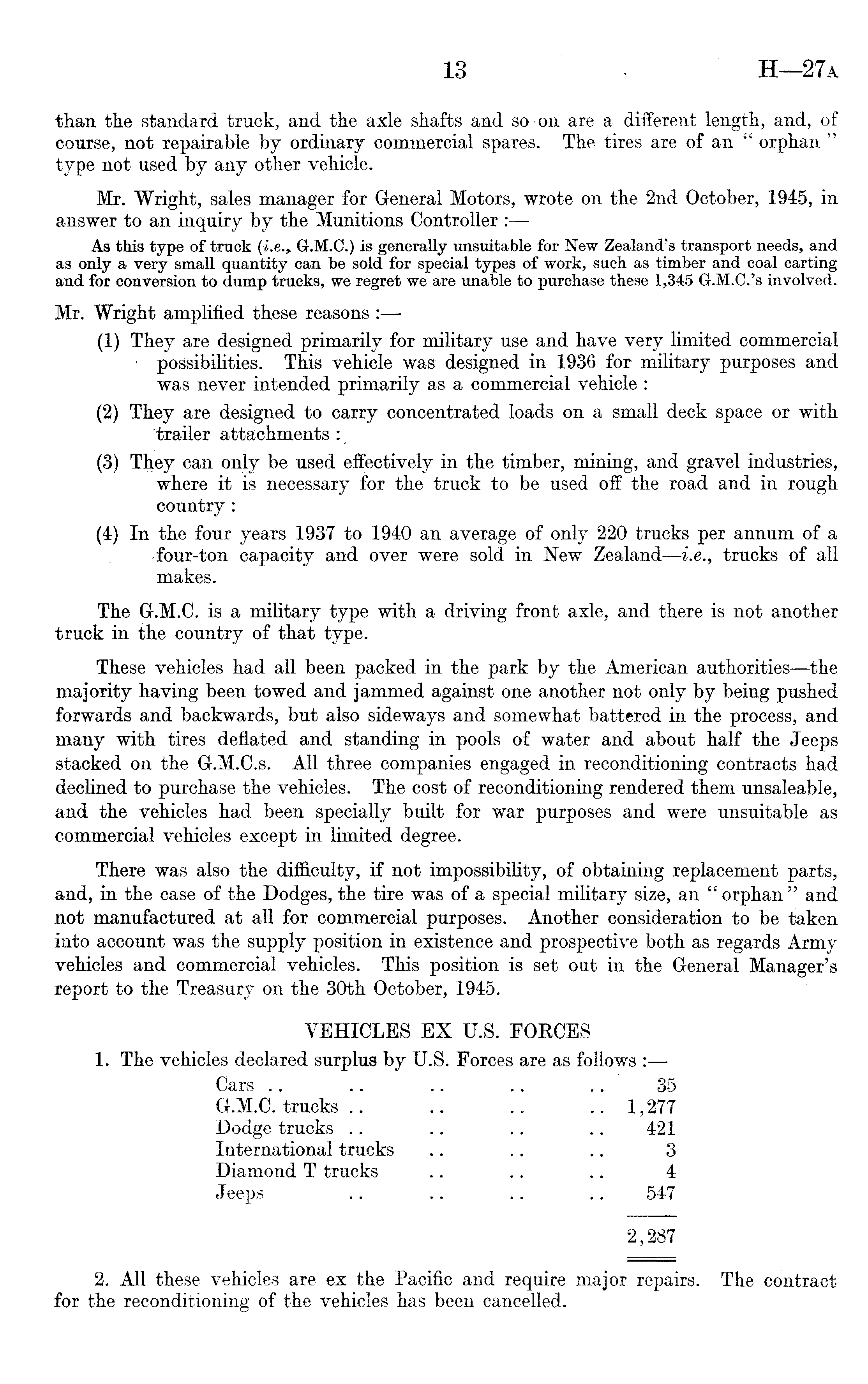 than the standard truck, and the axle shafts and so on are a different length, and, of course, not repairable by ordinary commercial spares. The tires are of an " orphan " type not used by any other vehicle. Mr. Wright, sales manager for General Motors, wrote on the 2nd October, 1945, in answer to an inquiry by the Munitions Controller : As this type of truck (i.e., G.M.C.) is generally unsuitable for New Zealand's transport needs, and as only a very small quantity can be sold for special types of work, such as timber and coal carting and for conversion to dump trucks, we regret we are unable to purchase these 1,345 G.M.C.'s involved. Mr. Wright amplified these reasons : —- (1) They are designed primarily for military use and have very limited commercial possibilities. This vehicle was designed in 1936 for military purposes and was never intended primarily as a commercial vehicle : (2) They are designed to carry concentrated loads on a small deck space or with trailer attachments : (3) They can only be used effectively in the timber, mining, and gravel industries, where it is necessary for the truck to be used off the road and in rough country : (4) In the four years 1937 to 1940 an average of only 220 trucks per annum of a four-ton capacity and over were sold in New Zealand—i.e., trucks of all makes. The G.M.C. is a military type with a driving front axle, and there is not another truck in the country of that type. These vehicles had all been packed in the park by the American authorities—the majority having been towed and jammed against one another not only by being pushed forwards and backwards, but also sideways and somewhat battered in the process, and many with tires deflated and standing in pools of water and about half the Jeeps stacked on the G.M.C.s. All three companies engaged in reconditioning contracts had declined to purchase the vehicles. The cost of reconditioning rendered them unsaleable, and the vehicles had been specially built for war purposes and were unsuitable as commercial vehicles except in limited degree. There was also the difficulty, if not impossibility, of obtaining replacement parts, and, in the case of the Dodges, the tire was of a special military size, an " orphan " and not manufactured at all for commercial purposes. Another consideration to be taken into account was the supply position in existence and prospective both as regards Army vehicles and commercial vehicles. This position is set out in the General Manager's report to the Treasury on the 30th October, 1945. VEHICLES EX U.S. FORCES 1. The vehicles declared surplus by U.S. Forces are as follows : Cars .. .. .. .. .. 35 G.M.C. trucks .. .. .. ..1,277 Dodge trucks .. .. .. .. 421 International trucks .. .. .. 3 Diamond T trucks .. .. .. 4 Jeeps .. .. .. .. 547 2,287 2. All these vehicles are ex the Pacific and require major repairs. The contract for the reconditioning of the vehicles has been cancelled.