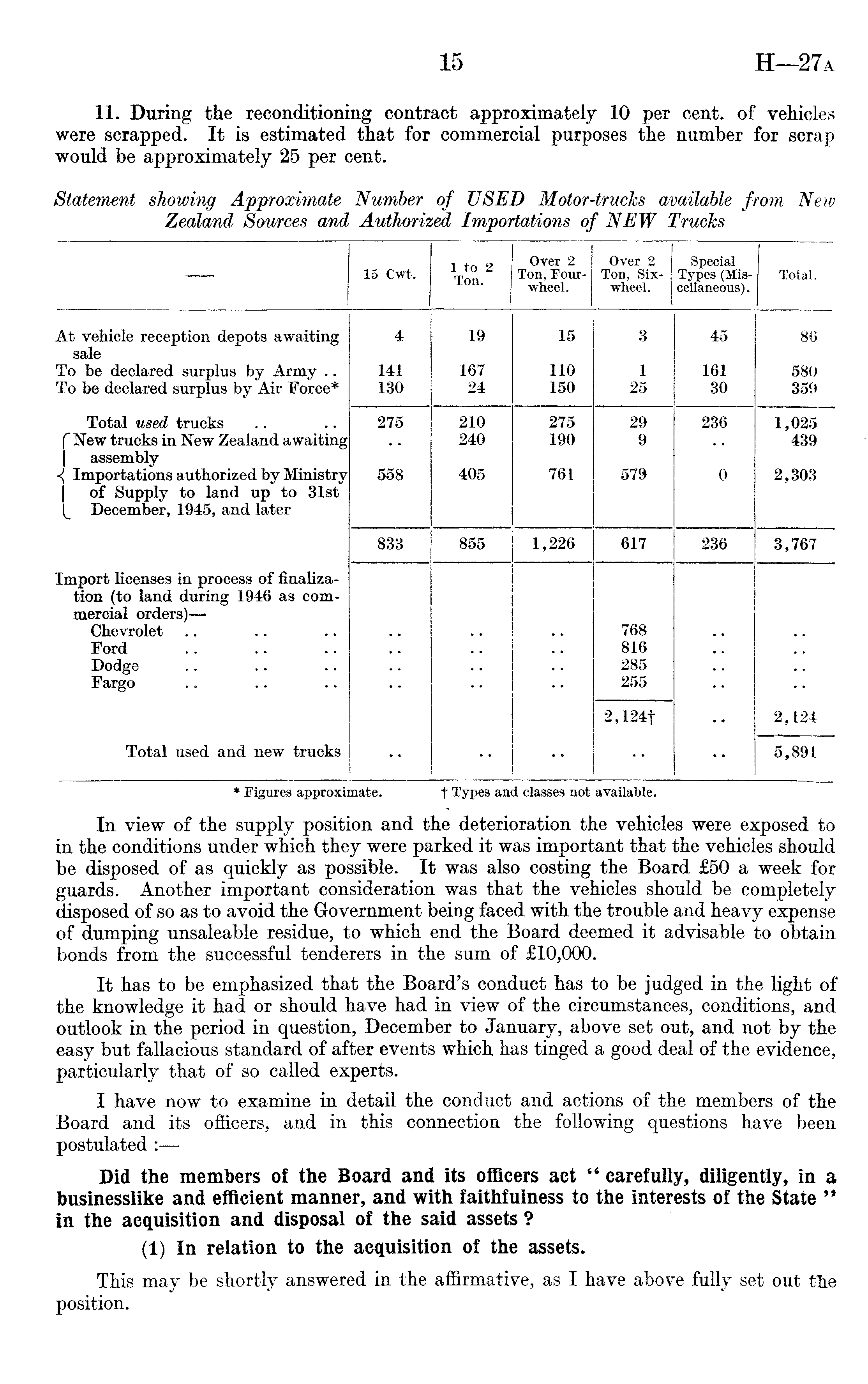 In view of the supply position and the deterioration the vehicles were exposed to in the conditions under which they were parked it was important that the vehicles should be disposed of as quickly as possible. It was also costing the Board £5O a week for guards. Another important consideration was that the vehicles should be completely disposed of so as to avoid the Government being faced with the trouble and heavy expense of dumping unsaleable residue, to which end the Board deemed it advisable to obtain bonds from the successful tenderers in the sum of £lO,OOO. It has to be emphasized that the Board's conduct has to be judged in the light of the knowledge it had or should have had in view of the circumstances, conditions, and outlook in the period in question, December to January, above set out, and not by the easy but fallacious standard of after events which has tinged a good deal of the evidence, particularly that of so called experts. I have now to examine in detail the conduct and actions of the members of the Board and its officers, and in this connection the following questions have been postulated : Did the members of the Board and its officers act " carefully, diligently, in a businesslike and efficient manner, and with faithfulness to the interests of the Staie " in the acquisition and disposal of the said assets ? (1) In relation to the acquisition of the assets. This may be shortly answered in the affirmative, as I have above fully set out the position.