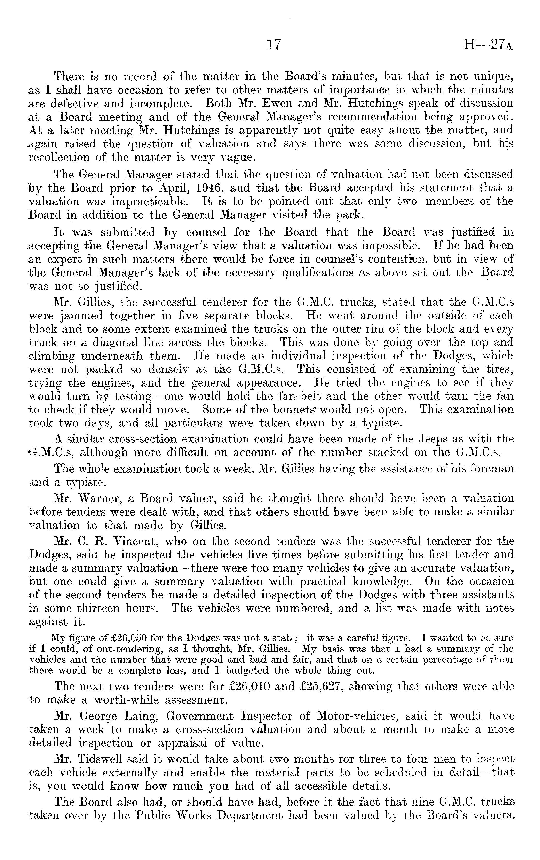 There is no record of the matter in the Board's minutes, but that is not unique, as I shall have occasion to refer to other matters of importance in which the minutes are defective and incomplete. Both Mr. Ewen and Mr. Hutchings speak of discussion at a Board meeting and of the General Manager's recommendation being approved. At a later meeting Mr. Hutchings is apparently not quite easy about the matter, and -again raised the question of valuation and says there was some discussion, but his recollection of the matter is very vague. The General Manager stated that the question of valuation had not been discussed by the Board prior to April, 1946, and that the Board accepted his statement that a valuation was impracticable. It is to be pointed out that only two members of the Board in addition to the General Manager visited the park. It was submitted by counsel for the Board that the Board was justified in accepting the General Manager's view that a valuation was impossible. If he had been an expert in such matters there would be force in counsel's contention, but in view of the General Manager's lack of the necessary qualifications as above set out the Board was not so justified. Mr. Gillies, the successful tenderer for the G.M.C. trucks, stated that the G.M.C.s were jammed together in five separate blocks. He went around the outside of each block and to some extent examined the trucks on the outer rim of the block and every truck on a diagonal line across the blocks. This was done by going over the top and climbing underneath them. He made an individual inspection of the Dodges, which were not packed so densely as the G.M.C.s. This consisted of examining the tires, trying the engines, and the general appearance. He tried the engines to see if they would turn by testing —one would hold the fan-belt and the other would turn the fan to check if they would move. Some of the bonnet? would not open. This examination took two days, and all particulars were taken down by a typiste. A similar cross-section examination could have been made of the Jeeps as with the O.M.C.s, although more difficult on account of the number stacked on the G.M.C.s. The whole examination took a week, Mr. Gillies having the assistance of his foreman and a typiste. Mr. Warner, a Board valuer, said he thought there should have been a valuation before tenders were dealt with, and that others should have been able to make a similar valuation to that made by Gillies. Mr. C. R. Vincent, who on the second tenders was the successful tenderer for the Dodges, said he inspected the vehicles five times before submitting his first tender and made a summary valuation —there were too many vehicles to give an accurate valuation, but one could give a summary valuation with practical knowledge. On the occasion of the second tenders he made a detailed inspection of the Dodges with three assistants in some thirteen hours. The vehicles were numbered, and a list was made with notes against it. My figure of £26,050 for the Dodges was not a stab ; it was a careful figure. I wanted to be sure if I could, of out-tendering, as I thought, Mr. Gillies. My basis was that I had a summary of the vehicles and the number that were good and bad and fair, and that on a certain percentage of them there would be a complete loss, and I budgeted the whole thing out. The next two tenders were for £26,010 and £25,627, showing that others were able to make a worth-while assessment. Mr. George Laing, Government Inspector of Motor-vehicles, said it would have taken a week to make a cross-section valuation and about a month to make a more detailed inspection or appraisal of value. Mr. Tidswell said it would take about two months for three to four men to inspect each vehicle externally and enable the material parts to be scheduled in detail—that is, you would know how much you had of all accessible details. The Board also had, or should have had, before it the fact that nine G.M.C. trucks taken over by the Public Works Department had been valued by the Board's valuers.