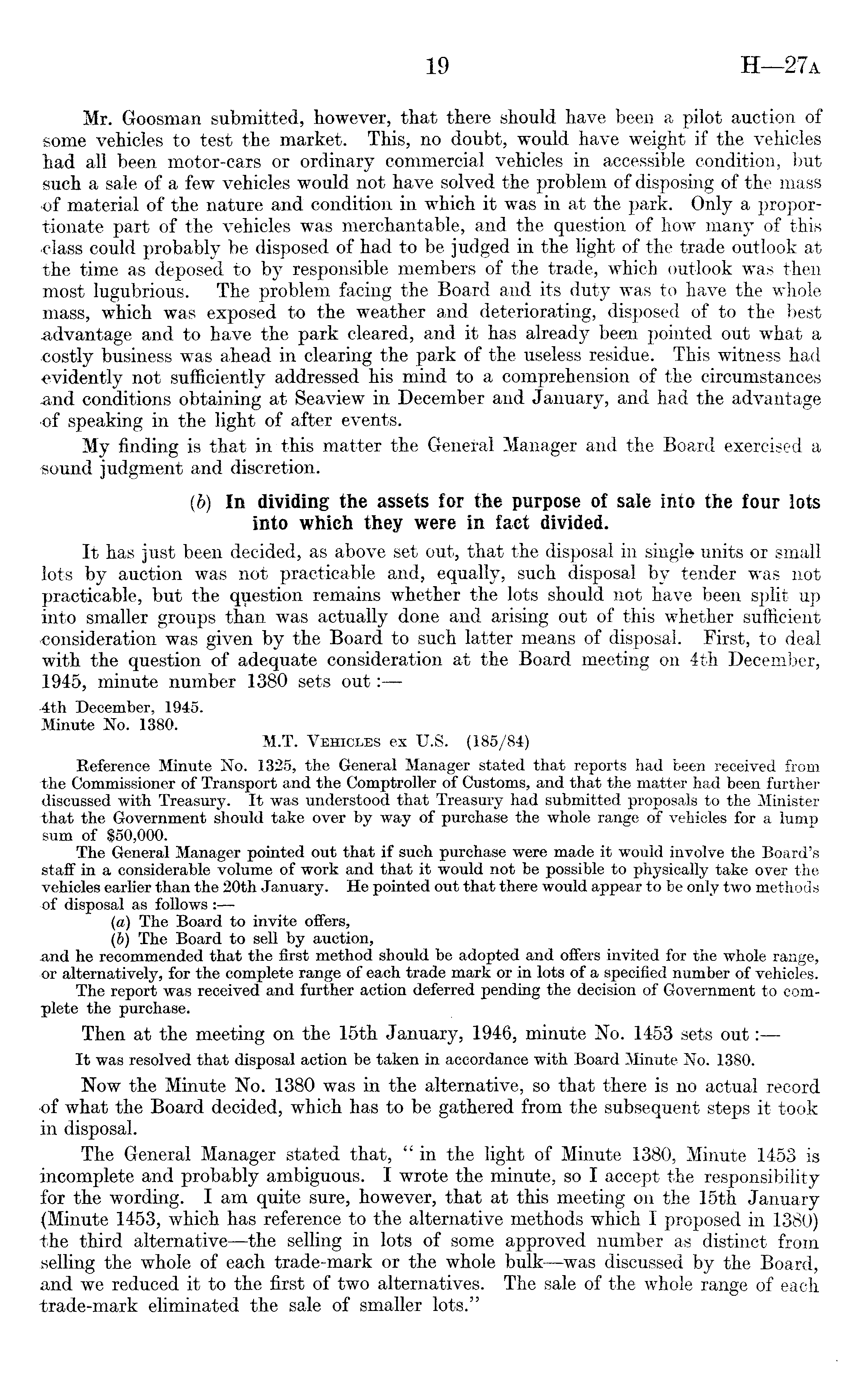 Mr. Goosman submitted, however, that there should have been a pilot auction of some vehicles to test the market. This, no doubt, would have weight if the vehicles had all been motor-cars or ordinary commercial vehicles in accessible condition, but such a sale of a few vehicles would not have solved the problem of disposing of the mass of material of the nature and condition in which it was in at the park. Only a proportionate part of the vehicles was merchantable, and the question of how many of this ■class could probably be disposed of had to be judged in the light of the trade outlook at the time as deposed to by responsible members of the trade, which outlook was then most lugubrious. The problem facing the Board and its duty was to have the whole mass, which was exposed to the weather and deteriorating, disposed of to the best advantage and to have the park cleared, and it has already been pointed out what a -costly business was ahead in clearing the park of the useless residue. This witness had evidently not sufficiently addressed his mind to a comprehension of the circumstances and conditions obtaining at Seaview in December and January, and had the advantage of speaking in the light of after events. My finding is that in this matter the General Manager and the Board exercised a sound judgment and discretion. (b) In dividing the assets for the purpose of sale into the four lots into which they were in fact divided. It has just been decided, as above set out, that the disposal in single units or small lots by auction was not practicable and, equally, such disposal by tender was not practicable, but the question remains whether the lots should not have been split up into smaller groups than was actually done and arising out of this whether sufficient consideration was given by the Board to such latter means of disposal. First, to deal with the question of adequate consideration at the Board meeting on 4th December, 1945, minute number 1380 sets out: — 4th December, 1945. Minute No. 1380. M.T. Vehicles ex U.S. (185/84) Reference Minute No. 1325, the General Manager stated that reports had been received from the Commissioner of Transport and the Comptroller of Customs, and that the matter had been further discussed with Treasury. It was understood that Treasury had submitted proposals to the Minister -that the Government should take over by way of purchase the whole range of vehicles for a lump sum of $50,000. The General Manager pointed out that if such purchase were made it would involve the Board's staff in a considerable volume of work and that it would not be possible to physically take over the vehicles earlier than the 20th January. He pointed out that there would appear to be only two methods of disposal as follows : (a) The Board to invite offers, (b) The Board to sell by auction, and he recommended that the first method should be adopted and offers invited for the whole range, ■or alternatively, for the complete range of each trade mark or in lots of a specified number of vehicles. The report was received and farther action deferred pending the decision of Government to complete the purchase. Then at the meeting on the 15th January, 1946, minute No. 1453 sets out: — It was resolved that disposal action be taken in accordance with Board Minute No. 1380. Now the Minute No. 1380 was in the alternative, so that there is no actual record of what the Board decided, which has to be gathered from the subsequent steps it took in disposal. The General Manager stated that, " in the light of Minute 1380, Minute 1453 is incomplete and probably ambiguous. I wrote the minute, so I accept the responsibility for the wording. lam quite sure, however, that at this meeting on the 15th January (Minute 1453, which has reference to the alternative methods which I proposed in 1380) the third alternative —the selling in lots of some approved number as distinct from selling the whole of each trade-mark or the whole bulk —was discussed by the Board, and we reduced it to the first of two alternatives. The sale of the whole range of each trade-mark eliminated the sale of smaller lots."