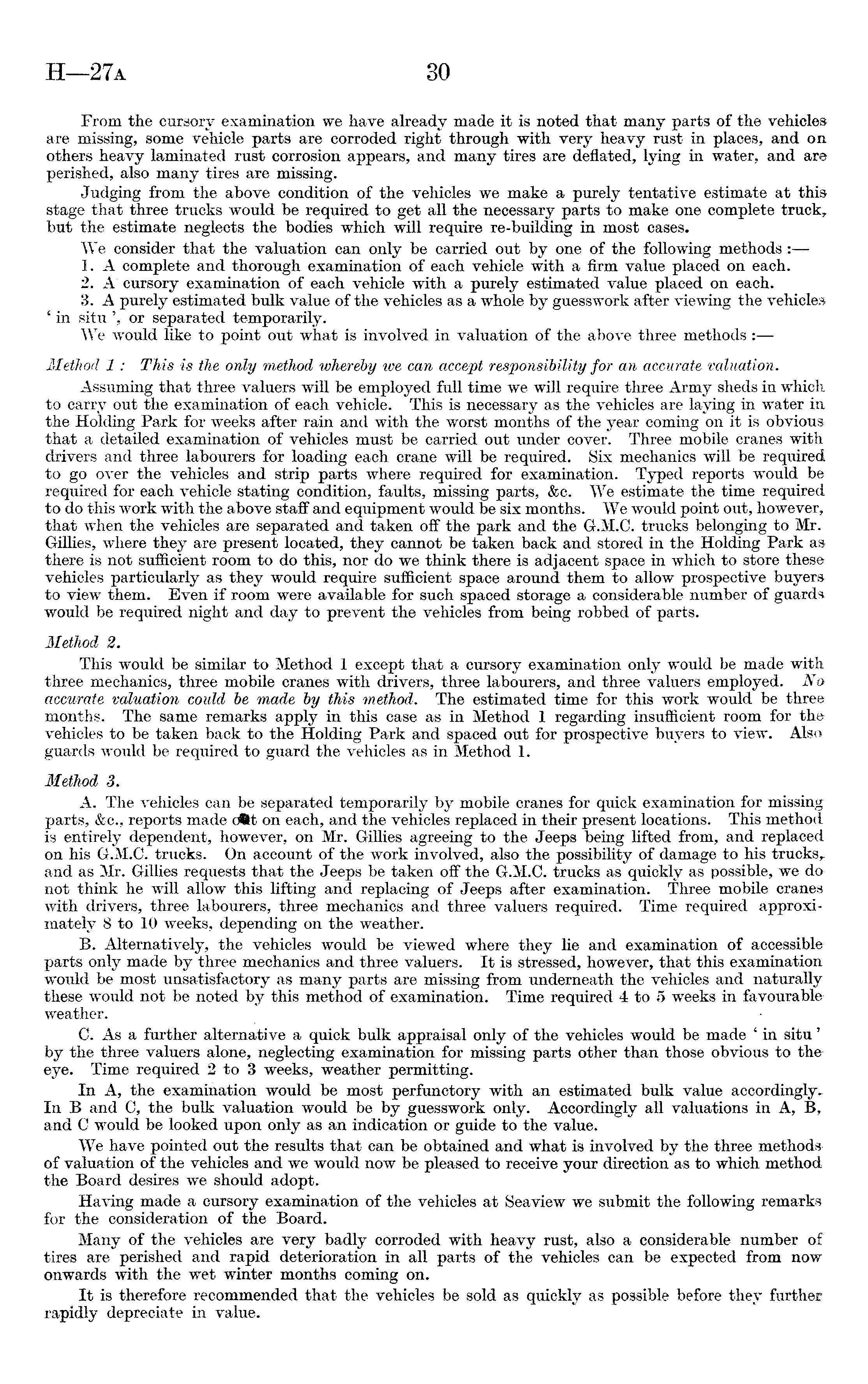 From the cursory examination we have already made it is noted that many parts of the vehicles are missing, some vehicle parts are corroded right through with very heavy rust in places, and on others heavy laminated rust corrosion appears, and many tires are deflated, lying in water, and are perished, also many tires are missing. Judging from the above condition of the vehicles we make a purely tentative estimate at this stage that three trucks would be required to get all the necessary parts to make one complete truck, but the estimate neglects the bodies which will require re-building in most cases. We consider that the valuation can only be carried out by one of the following methods : 1. A complete and thorough examination of each vehicle with a firm value placed on each. 2. A cursory examination of each vehicle with a purely estimated value placed on each. 3. A purely estimated bulk value of the vehicles as a whole by guesswork after viewing the vehicles 'in situ or separated temporarily. We would like to point out what is involved in valuation of the above three methods : Method 1 : This is the only method whereby we can accept responsibility for an accurate valuation. Assuming that three valuers will be employed full time we will require three Army sheds in which to carry out the examination of each vehicle. This is necessary as the vehicles are laying in water in the Holding Park for weeks after rain and with the worst months of the year coming on it is obvious that a detailed examination of vehicles must be carried out under cover. Three mobile cranes with drivers and three labourers for loading each crane will be required. Six mechanics will be required to go over the vehicles and strip parts where required for examination. Typed reports would be required for each vehicle stating condition, faults, missing parts, &c. We estimate the time required to do this work with the above staff and equipment would be six months. We would point out, however, that when the vehicles are separated and taken off the park and the G.M.C. trucks belonging to Mr. Gillies, where they are present located, they cannot be taken back and stored in the Holding Park as there is not sufficient room to do this, nor do we think there is adjacent space in which to store these vehicles particularly as they would require sufficient space around them to allow prospective buyers to view them. Even if room were available for such spaced storage a considerable number of guards would be required night and day to prevent the vehicles from being robbed of parts. Method 2. This would be similar to Method 1 except that a cursory examination only would be made with three mechanics, three mobile cranes with drivers, three labourers, and three valuers employed. No accurate valuation could be made by this method. The estimated time for this work would be three months. The same remarks apply in this case as in Method 1 regarding insufficient room for the vehicles to be taken back to the Holding Park and spaced out for prospective buyers to view. Also guards would be required to guard the vehicles as in Method 1. Method 3. A. The vehicles can be separated temporarily by mobile cranes for quick examination for missing parts, &c., reports made cfct on each, and the vehicles replaced in their present locations. This method is entirely dependent, however, on Mr. Gillies agreeing to the Jeeps being lifted from, and replaced on his G.M.C. trucks. On account of the work involved, also the possibility of damage to his trucks,, and as Mr. Gillies requests that the Jeeps be taken off the G.M.C. trucks as quickly as possible, we da not think he will allow this lifting and replacing of Jeeps after examination. Three mobile cranes with drivers, three labourers, three mechanics and three valuers required. Time required approximately 8 to 10 weeks, depending on the weather. B. Alternatively, the vehicles would be viewed where they Me and examination of accessible parts only made by three mechanics and three valuers. It is stressed, however, that this examination would be most unsatisfactory as many parts are missing from underneath the vehicles and naturally these would not be noted by this method of examination. Time required 4to 5 weeks in favourable weather. C. As a further alternative a quick bulk appraisal only of the vehicles would be made ' in situ' by the three valuers alone, neglecting examination for missing parts other than those obvious to the eye. Time required 2to 3 weeks, weather permitting. In A, the examination would be most perfunctory with an estimated bulk value accordinglyIn B and C, the bulk valuation would be by guesswork only. Accordingly all valuations in A, B, and C would be looked upon only as an indication or guide to the value. We have pointed out the results that can be obtained and what is involved by the three methods of valuation of the vehicles and we would now be pleased to receive your direction as to which method the Board desires we should adopt. Having made a cursory examination of the vehicles at Seaview we submit the following remarks for the consideration of the Board. Many of the vehicles are very badly corroded with heavy rust, also a considerable number of tires are perished and rapid deterioration in all parts of the vehicles can be expected from now onwards with the wet winter months coming on. It is therefore recommended that the vehicles be sold as quickly as possible before they further rapidly depreciate in value.