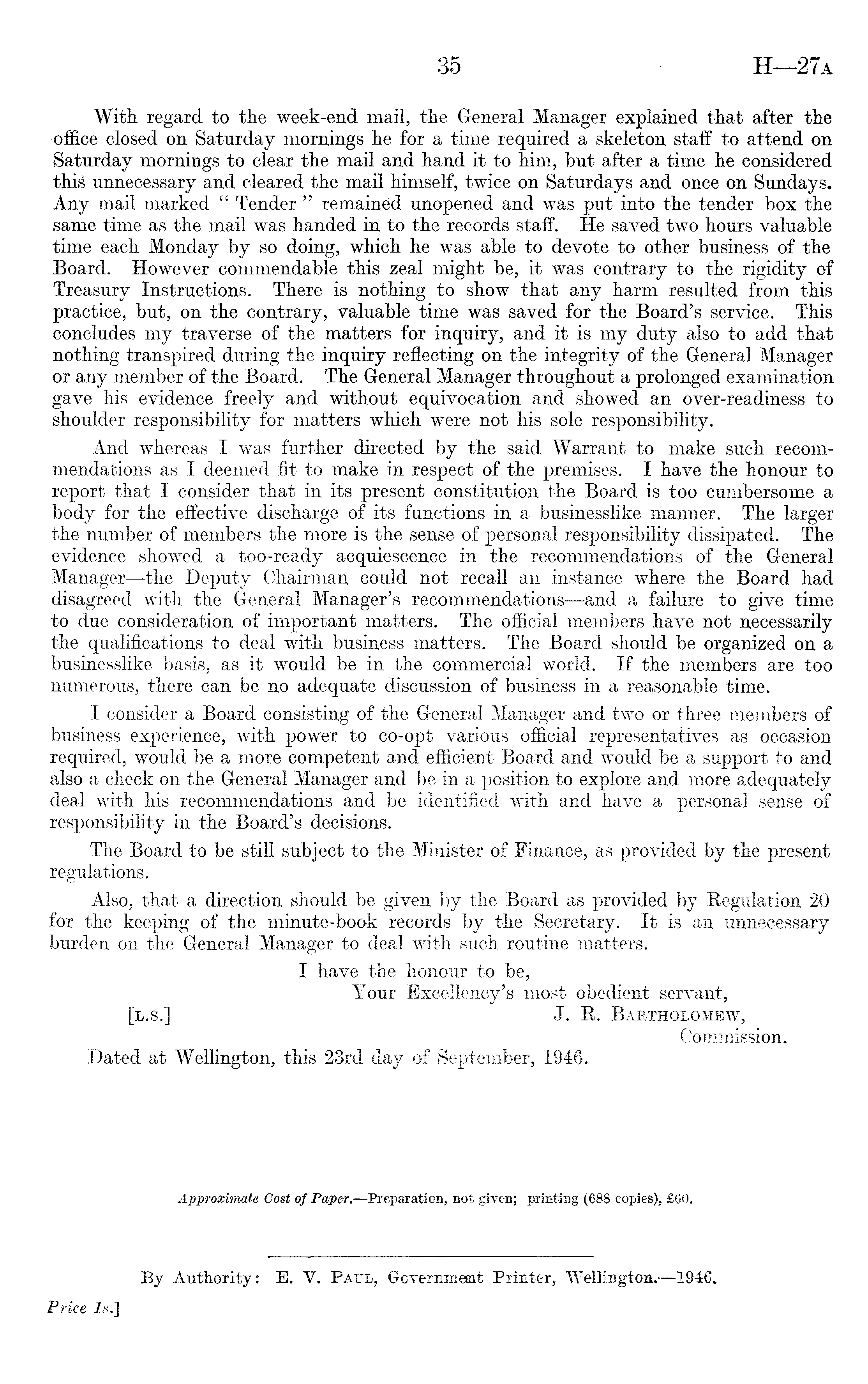 With regard to the week-end mail, the General Manager explained that after the office closed on Saturday mornings he for a time required a skeleton staff to attend on Saturday mornings to clear the mail and hand it to him, but after a time he considered this unnecessary and cleared the mail himself, twice on Saturdays and once on Sundays. Any mail marked " Tender " remained unopened and was put into the tender box the same time as the mail was handed in to the records staff. He saved two hours valuable time each Monday by so doing, which he was able to devote to other business of the Board. However commendable this zeal might be, it was contrary to the rigidity of Treasury Instructions. There is nothing to show that any harm resulted from this practice, but, on the contrary, valuable time was saved for the Board's service. This concludes my traverse of the matters for inquiry, and it is my duty also to add that nothing transpired during the inquiry reflecting on the integrity of the General Manager or any member of the Board. The General Manager throughout a prolonged examination gave his evidence freely and without equivocation and showed an over-readiness to shoulder responsibility for matters which were not his sole responsibility. And whereas I was further directed by the said Warrant to make such recommendations as I deemed fit to make in respect of the premises. I have the honour to report that I consider that in its present constitution the Board is too cumbersome a body for the effective discharge of its functions in a businesslike manner. The larger the number of members the more is the sense of personal responsibility dissipated. The evidence showed a too-ready acquiescence in the recommendations of the General Manager—the Deputy Chairman could not recall an instance where the Board had disagreed with the General Manager's recommendations—and a failure to give time to due consideration of important matters. The official members have not necessarily the qualifications to deal with business matters. The Board should be organized on a businesslike basis, as it would be in the commercial world. If the members are too numerous, there can be no adequate discussion of business in a reasonable time. I consider a Board consisting of the General Manager and two or three members of business experience, with power to co-opt various official representatives as occasion required, would be a more competent and efficient Board and would be a support to and also a check on the General Manager and be in a position to explore and more adequately deal with his recommendations and be identified with and have a personal sense of responsibility in the Board's decisions. The Board to be still subject to the Minister of Finance, as provided by the present regulations. Also, that a direction should be given by the Board as provided by Regulation 20 for the keeping of the minute-book records by the Secretary. It is an unnecessary burden on the General Manager to deal with such routine matters. I have the honour to be, Your Excellency's most obedient servant, [l.s.] J. R. Bartholomew, Commission. Dated at Wellington, this 23rd day of September, 1946.