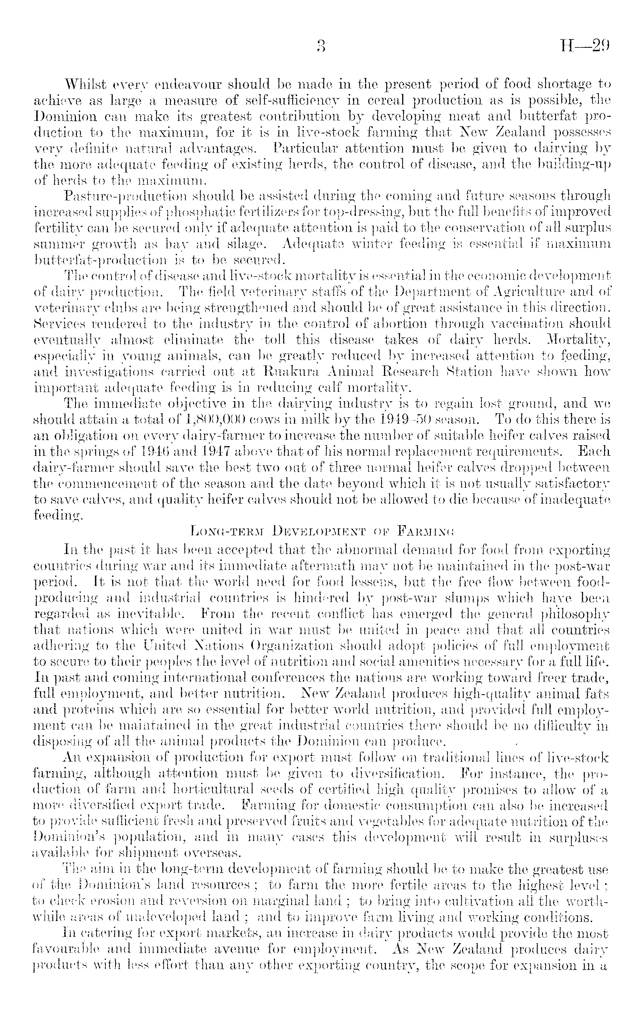 Whilst every endeavour should be made in the present period of food shortage to achieve as large a measure of self-sufficiency in cereal production as is possible, the Dominion can make its greatest contribution by developing meat and butterfat production to the maximum, for it is in live-stock farming that New Zealand possesses very definite natural advantages. Particular attention must be given to dairying by the more adequate feeding of existing herds, the control of disease, and the building-up of herds to the maximum. Pasture-production should be assisted during the-coming and future seasons through increased supplies of phosphatic fertilizers for top-dressing, but the full benefits of improved fertility can be secured only if adequate attention is paid to the conservation of all surplus summer growth as hay and silage. Adequate winter feeding is essential if maximum butterfat-production is to be secured. The control of disease and live-stock mortality is essential in the economic development of dairy production. The field veterinary staffs of the Department of Agriculture and of veterinary clubs are being strengthened and should be of great assistance in this direction. Services rendered to the industry in the control of abortion through vaccination should eventually almost eliminate the -toll this disease takes of dairy herds. Mortality, especially in young animals, can be greatly reduced by increased attention to feeding, and investigations carried out at Ruakura Animal Research Station have shown how important adequate feeding is in reducing calf mortality. The immediate objective in the dairying industry is to regain lost ground, and we should attain a total of 1,800,000 cows in milk by the 1949-50 season. To do this there is an obligation on every dairy-farmer to increase the number of suitable heifer calves raised in the springs of 1946 and 1947 above that of his normal replacement requirements. Bach dairy-farmer should save the best two out of three normal heifer calves dropped between the commencement of the season and the date beyond which it is not usually satisfactory to save calves, and quality heifer calves should not be allowed to die because of inadequate feeding. Long-term Development op Farming In the past it has been accepted that the abnormal demand for food from exporting countries during war and its immediate aftermath may not be maintained in the post-war period. It is not that the world need for food lessens, but the free flow between foodproducing and industrial countries is hindered by post-war slumps which have been regarded as inevitable. From the recent conflict has emerged the general philosophy that nations which were united in war must be united in peace and that all countries adhering to the United Nations Organization should adopt policies of full employment to secure to their peoples the level of nutrition and social amenities necessary for a full life. In past and coming international conferences the nations are working toward freer trade, full employment, and better nutrition. New Zealand produces high-quality animal fats and proteins which are so essential for better world nutrition, and provided full employment can be maintained in the great industrial countries there should be no difficulty in disposing of all the animal products the Dominion can produce. An expansion of production for export must follow on traditional lines of live-stock farming, although attention must be given to diversification. For instance, the production of farm and horticultural seeds of certified high quality promises to allow of a more diversified export trade. Farming for domestic consumption can also be increased to provide sufficient fresh and preserved fruits and vegetables for adequate nutrition of the Dominion's population, and in many cases this development will result in surpluses available for shipment overseas. The aim in the long-term development of farming should be to make the greatest use of the Dominion's land resources ; to farm the more fertile areas to the highest level; to check erosion and reversion on marginal land ; to bring into cultivation all the worthwhile areas of undeveloped land ; and to improve farm living and working conditions. In catering for export markets, an increase in dairy products would provide the most favourable and immediate avenue for employment. As New Zealand produces dairy products with less effort than any other exporting country, the scope for expansion in a